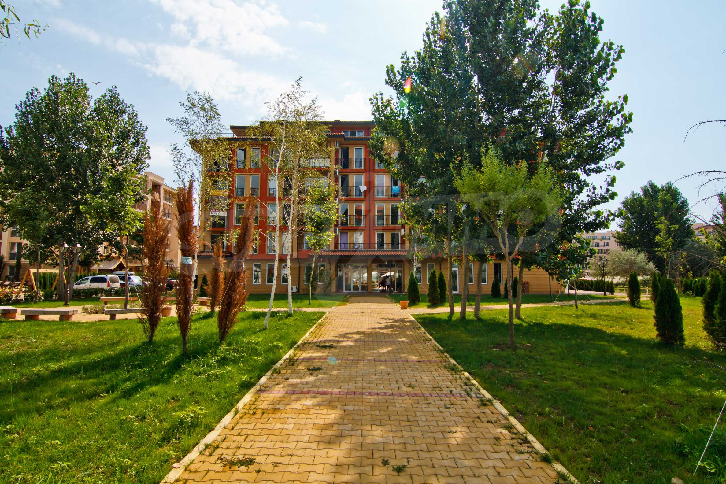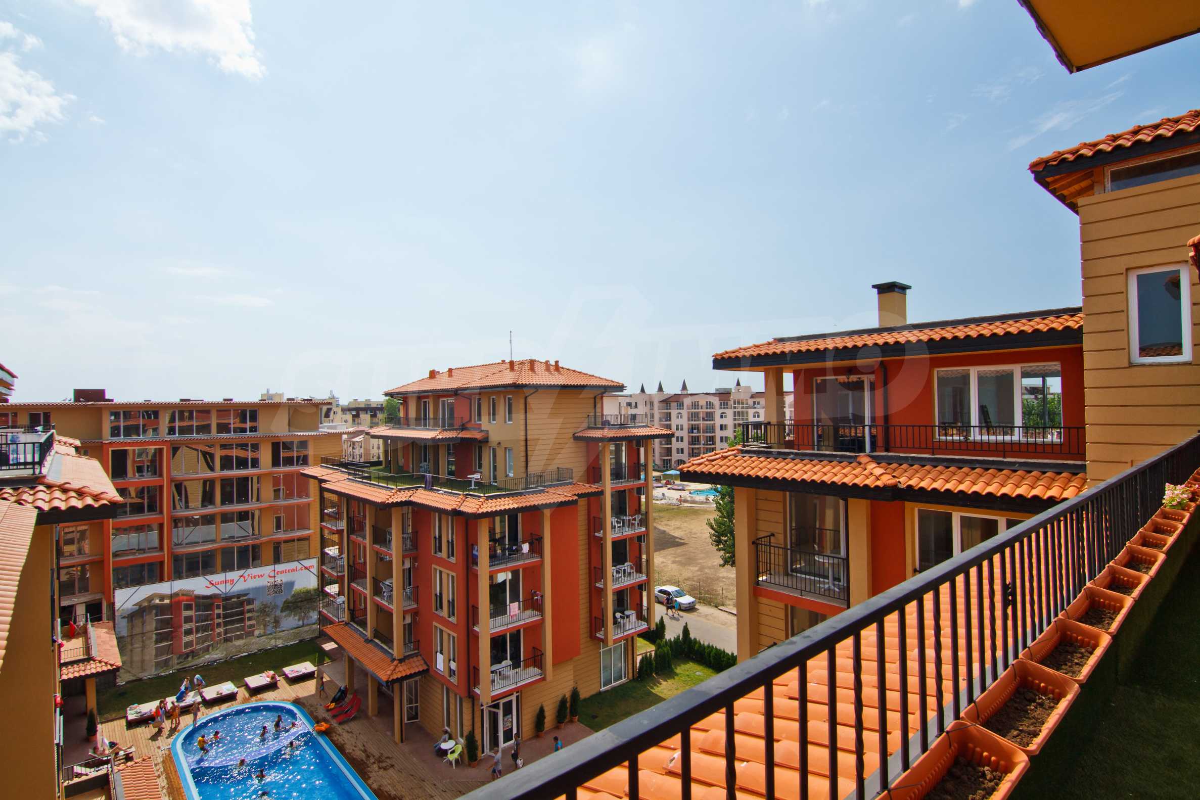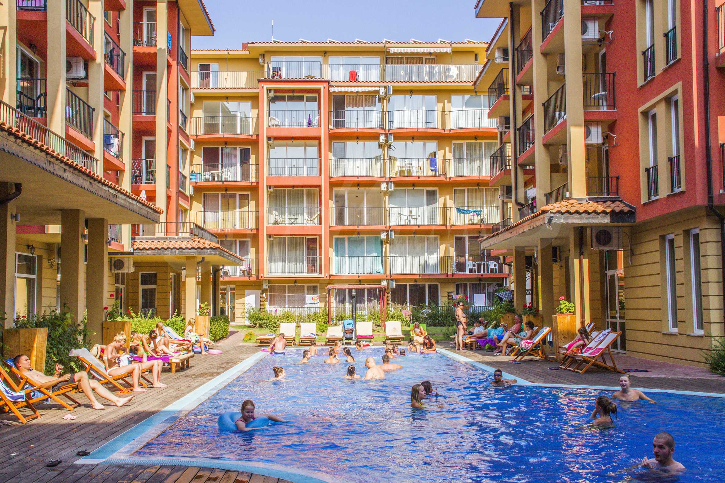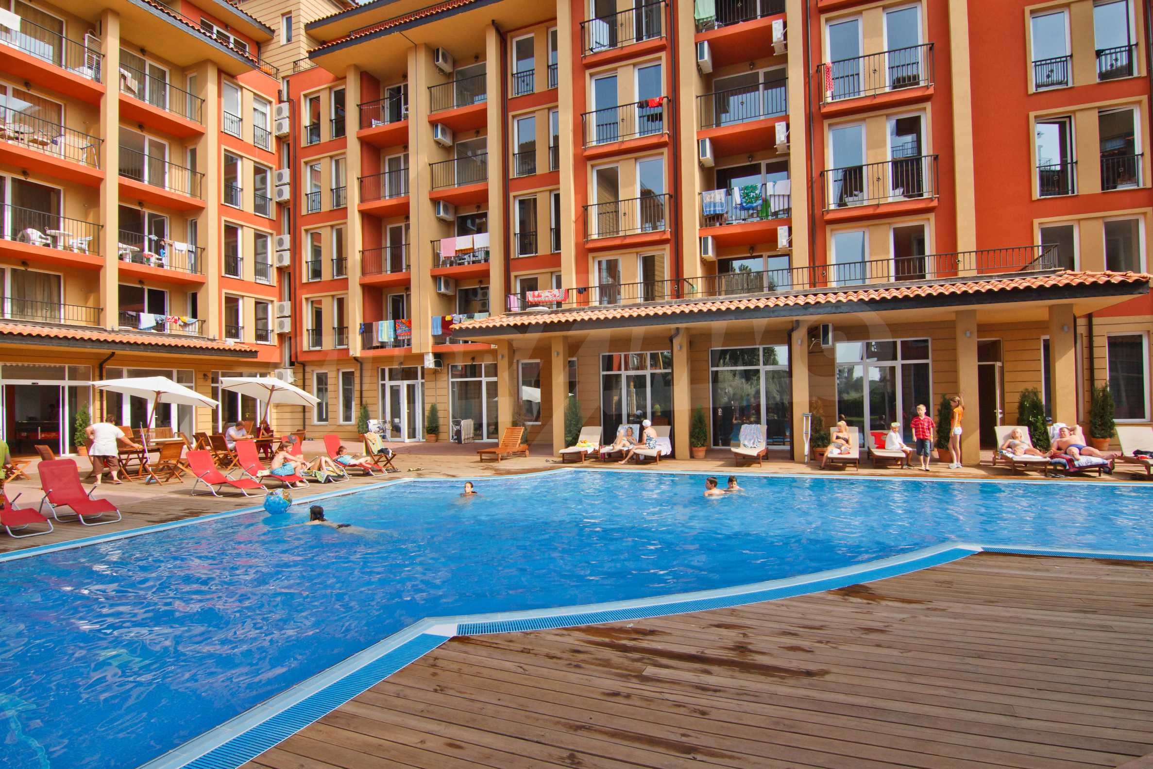 Ориентация комплекса на юг, при этом вид из окон на бассейн и спортивную площадку. В комплексе есть много дополнительных удобств, которые сделают ваше пребывание здесь приятным.