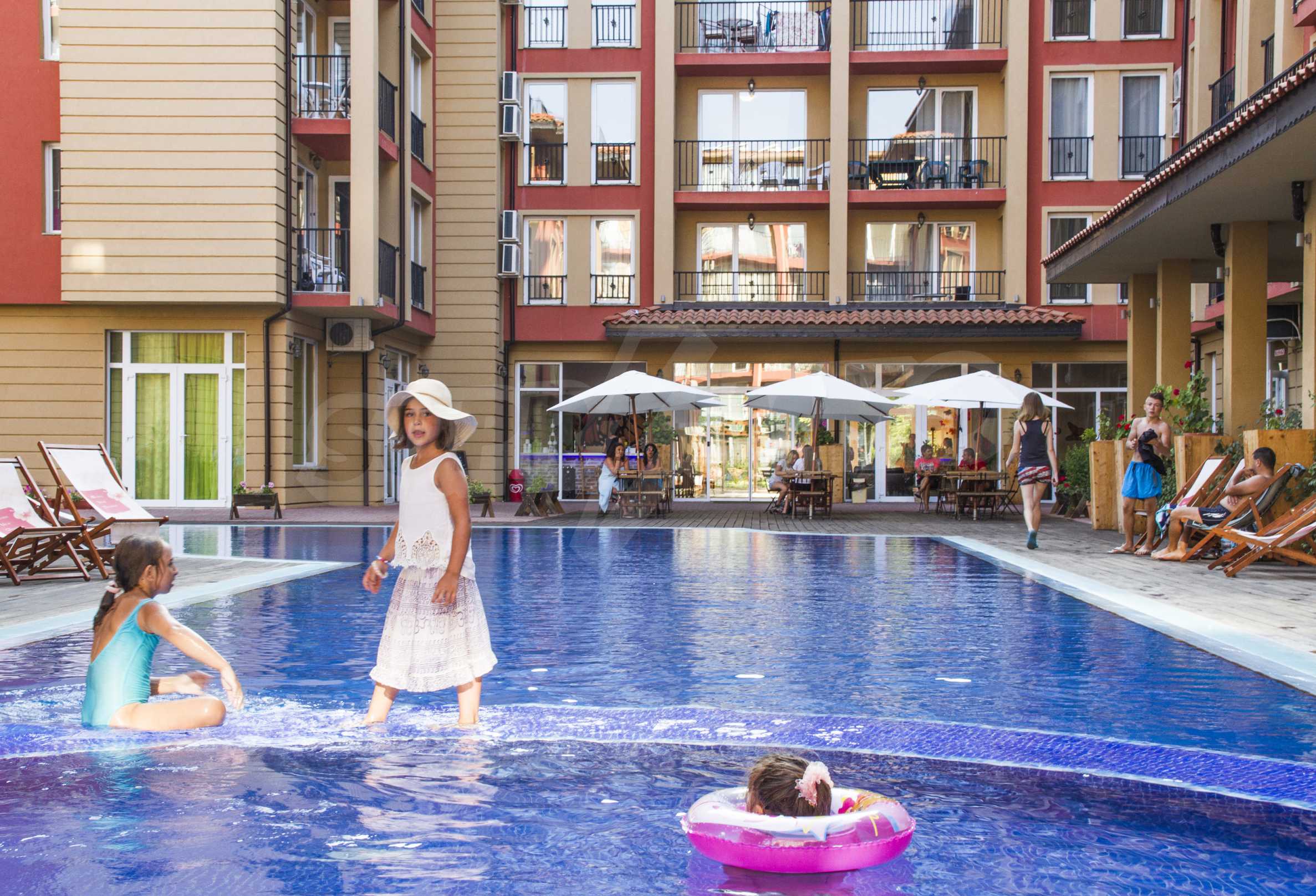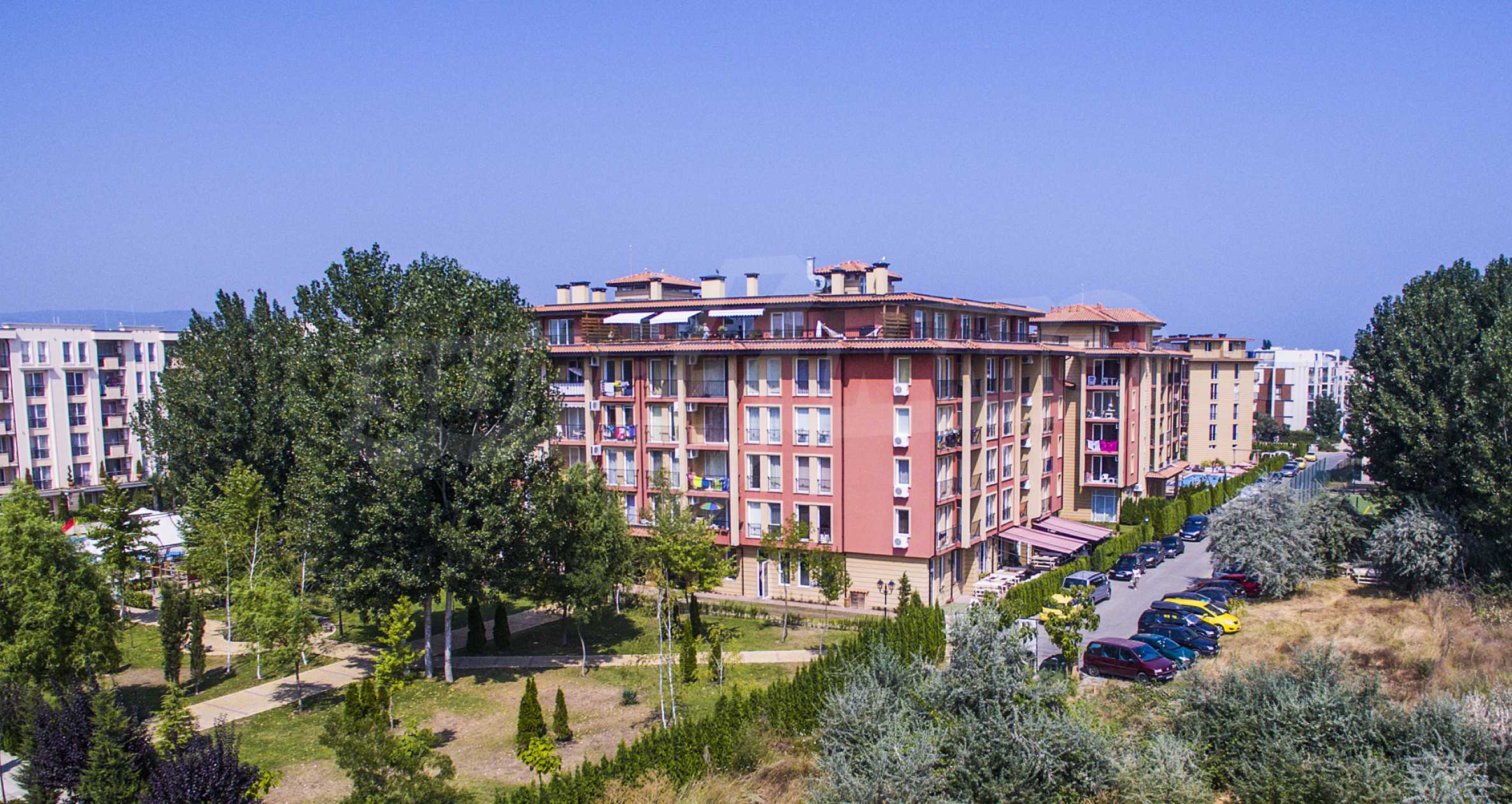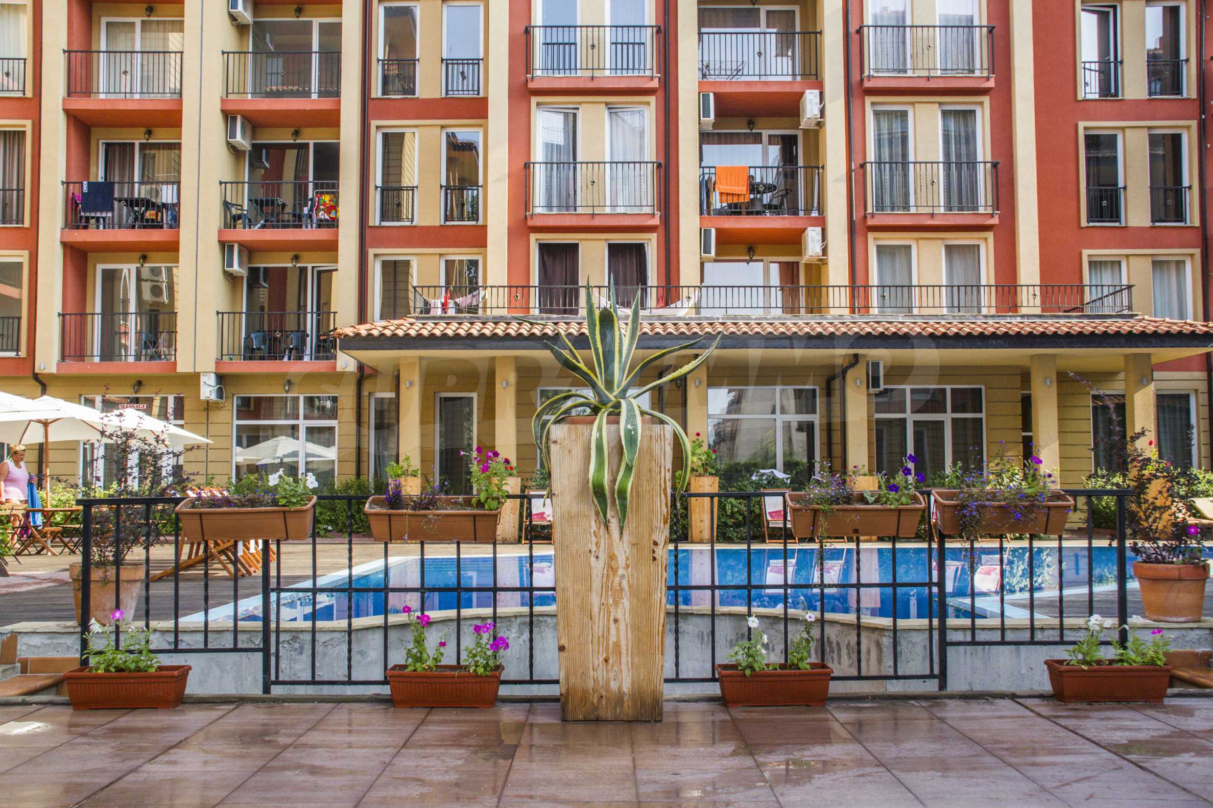 Ориентация комплекса на юг, при этом вид из окон на бассейн и спортивную площадку. В комплексе есть много дополнительных удобств, которые сделают ваше пребывание здесь приятным.