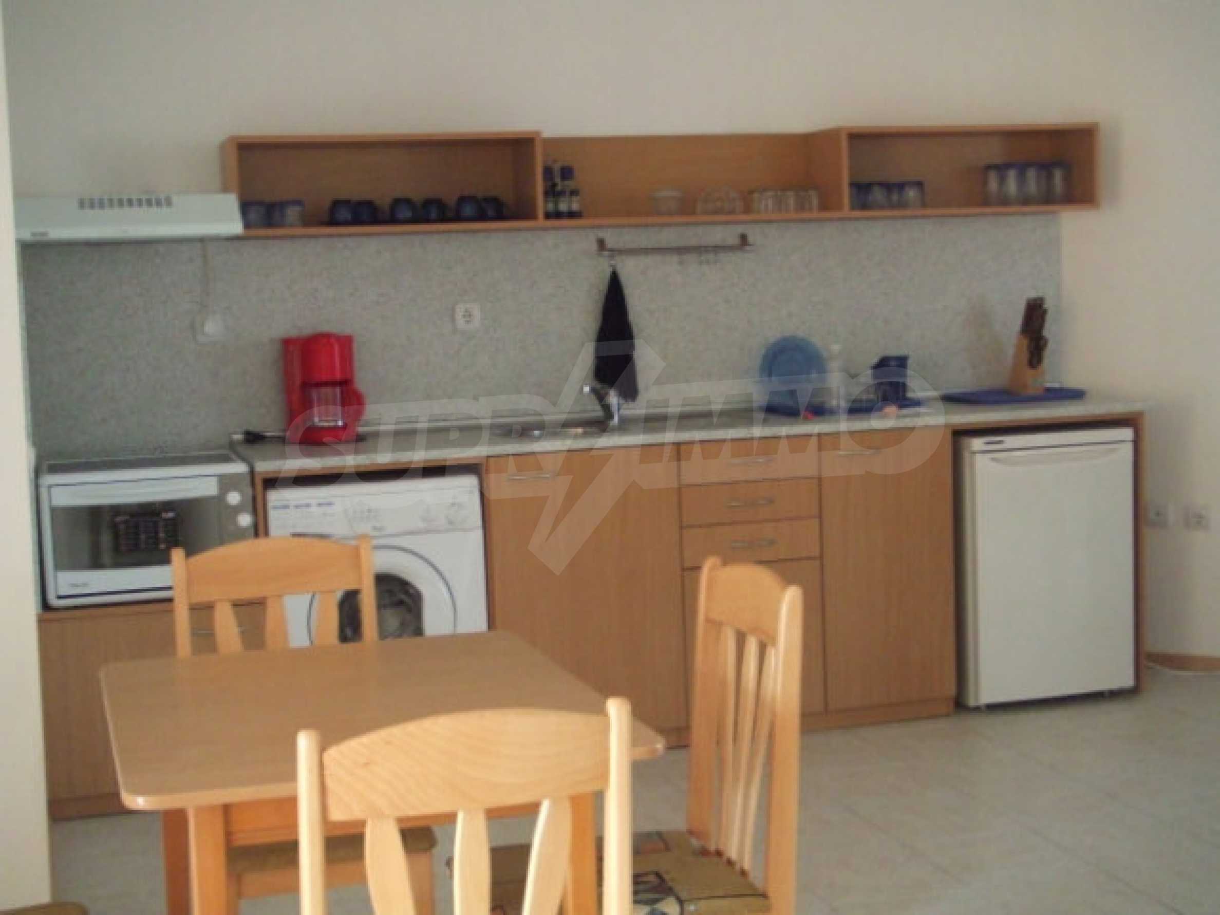 Предлагаем на продажу двухкомнатный, готовый к заселению апартамент в морском курорте Солнечный берег. Апартамент расположен на третьем этаже в жилом здании «Робинзон» со спокойной локацией сзади отеля «Фламинго», возле «Иван Палас», всего в 300 метрах от пляжного побережья и в 400 метрах от центра курорта со всеми современными удобствами.