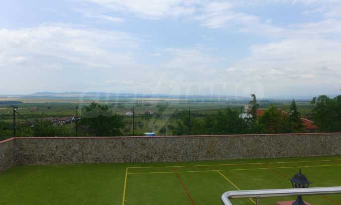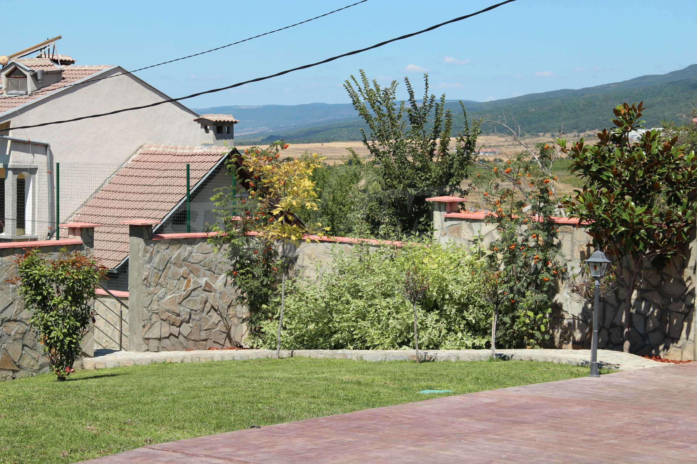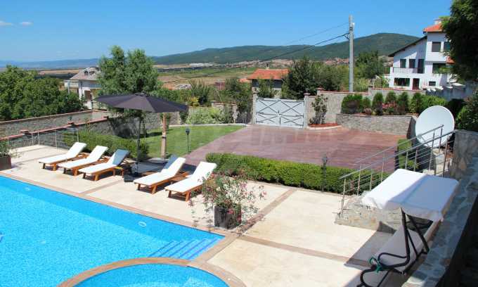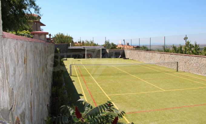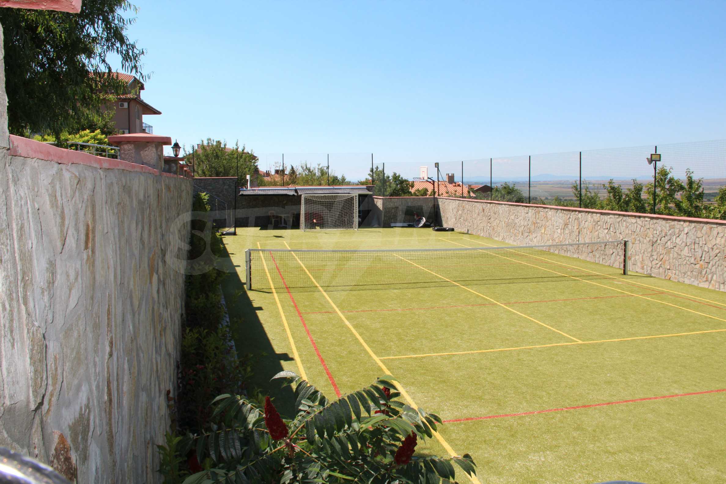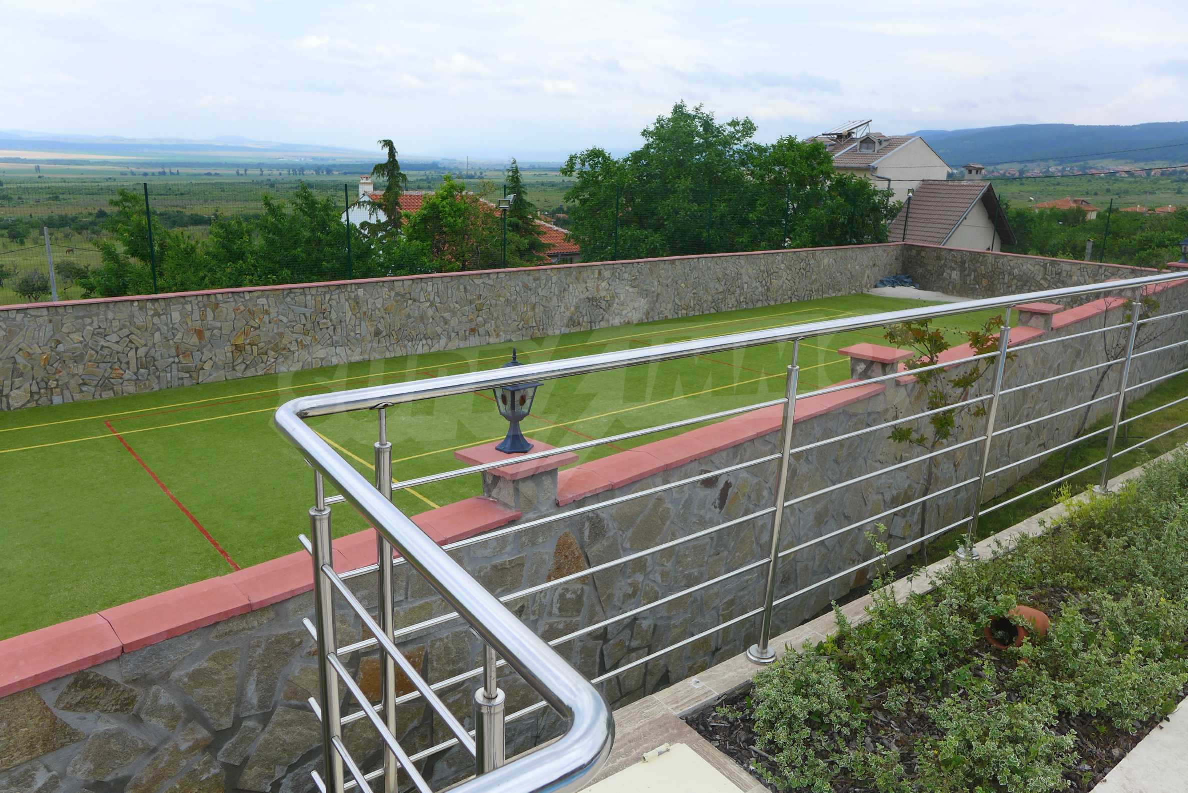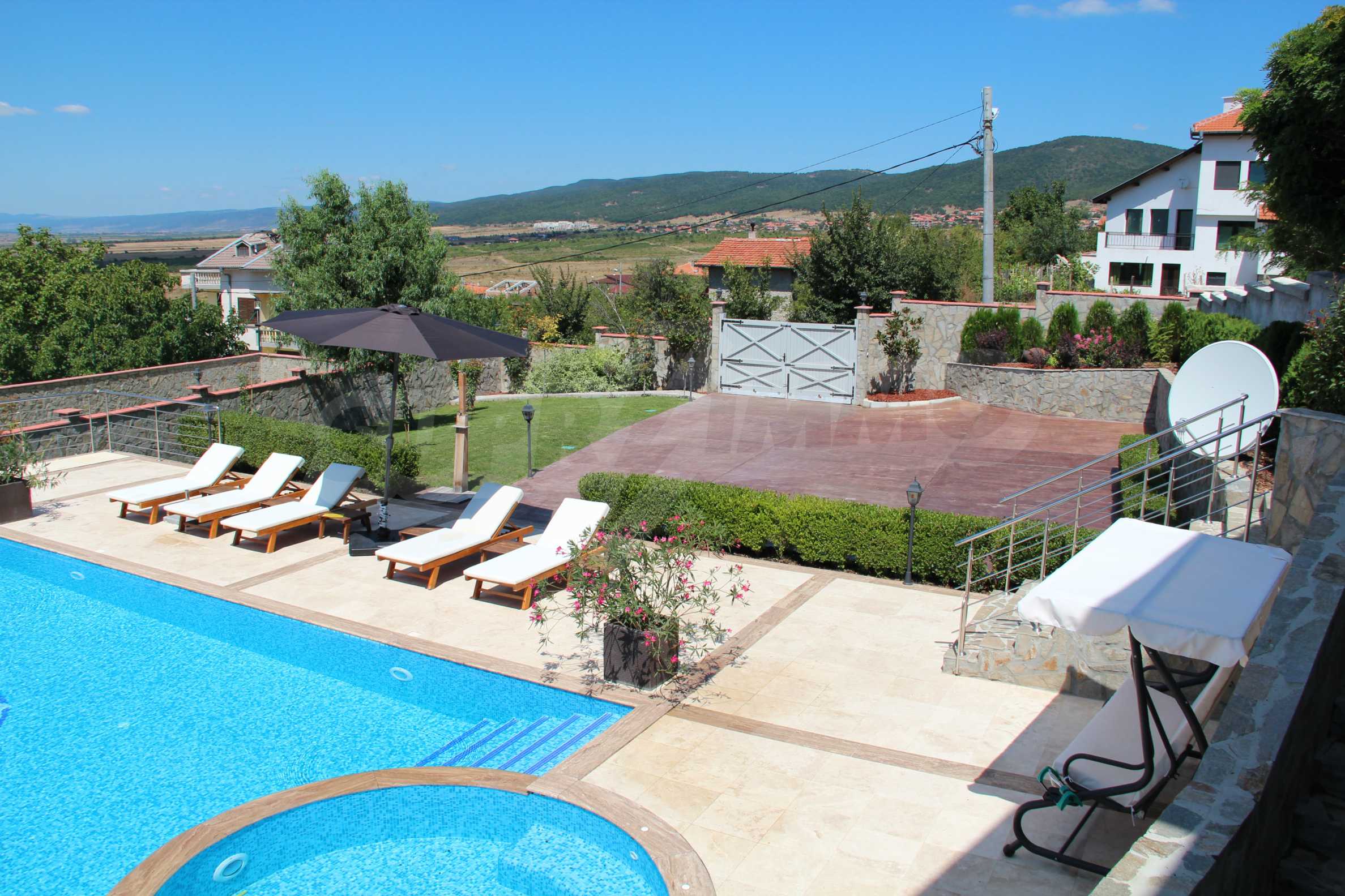 Дом состоит из кухни с гостиной, коридора, ванной комнаты с туалетом, веранды (на первом этаже), четырех спален, двух ванных комнат с туалетом и балконов ( на втором этаже). Недвижимость располагает двором (1000 кв.м.), где находятся: парковка на 5 машин, летняя кухня с барбекю, бассейн с подогревом и джакузи, теннисный корт и футбольное поле, много зелени и цветов в ухоженном саду. Отопление кондиционером. Ламинированный пол, межкомнатные двери, окна пвх, паркетный пол и терракотовый пол имеются в предлагаемой недвижимости. Недвижимость включает следующую мебель и оборудование: ванна, встроенная кухня, вытяжка, духовка, кондиционер, мебель, оборудованная ванная комната, телевизор, телефон и холодильник. Из основных коммуникаций обеспечены электричество, вода и центральная канализация. Заасфальтированная дорога, интернет Wi-Fi, кабельное телевидение, система охранной сигнализации и телефон имеются в наличии среди прочих указанных характеристик предлагаемого объекта, что обеспечит дополнительные удобства для пользования. Виды на бассейн, виды на внутренний двор и виды на горы открываются с недвижимости, раскрывая часть красот живописной Болгарии.