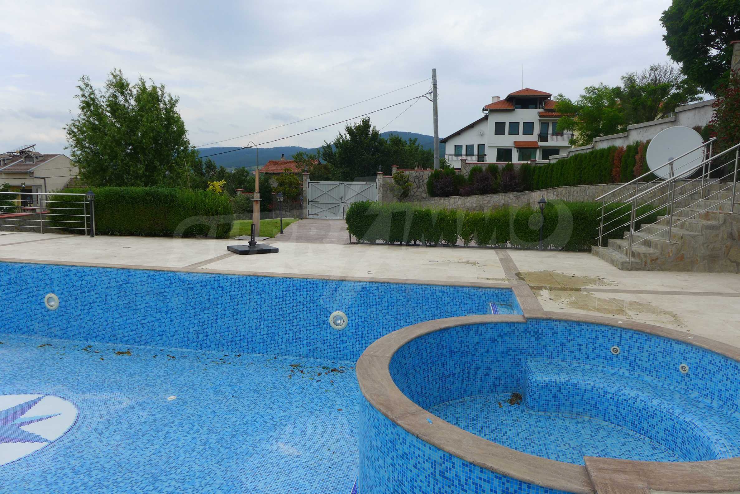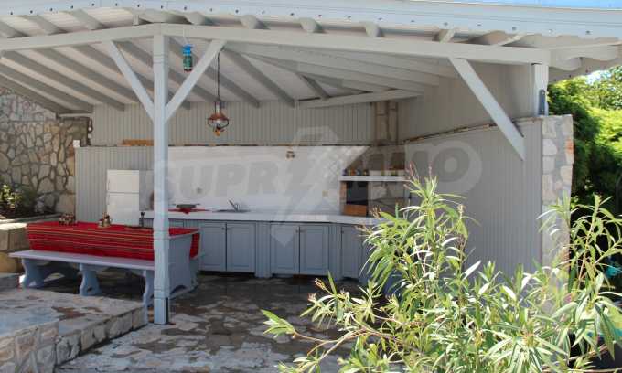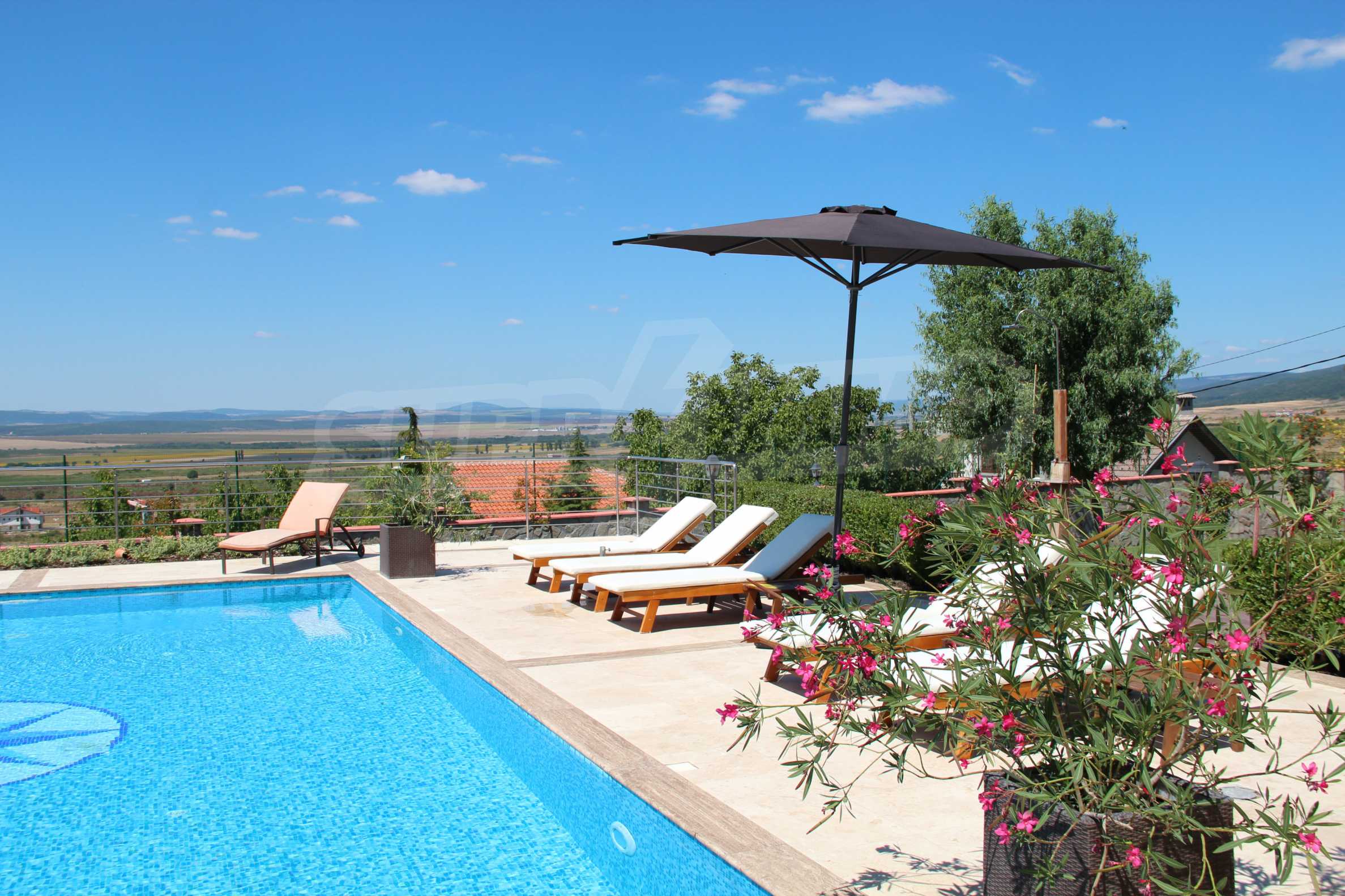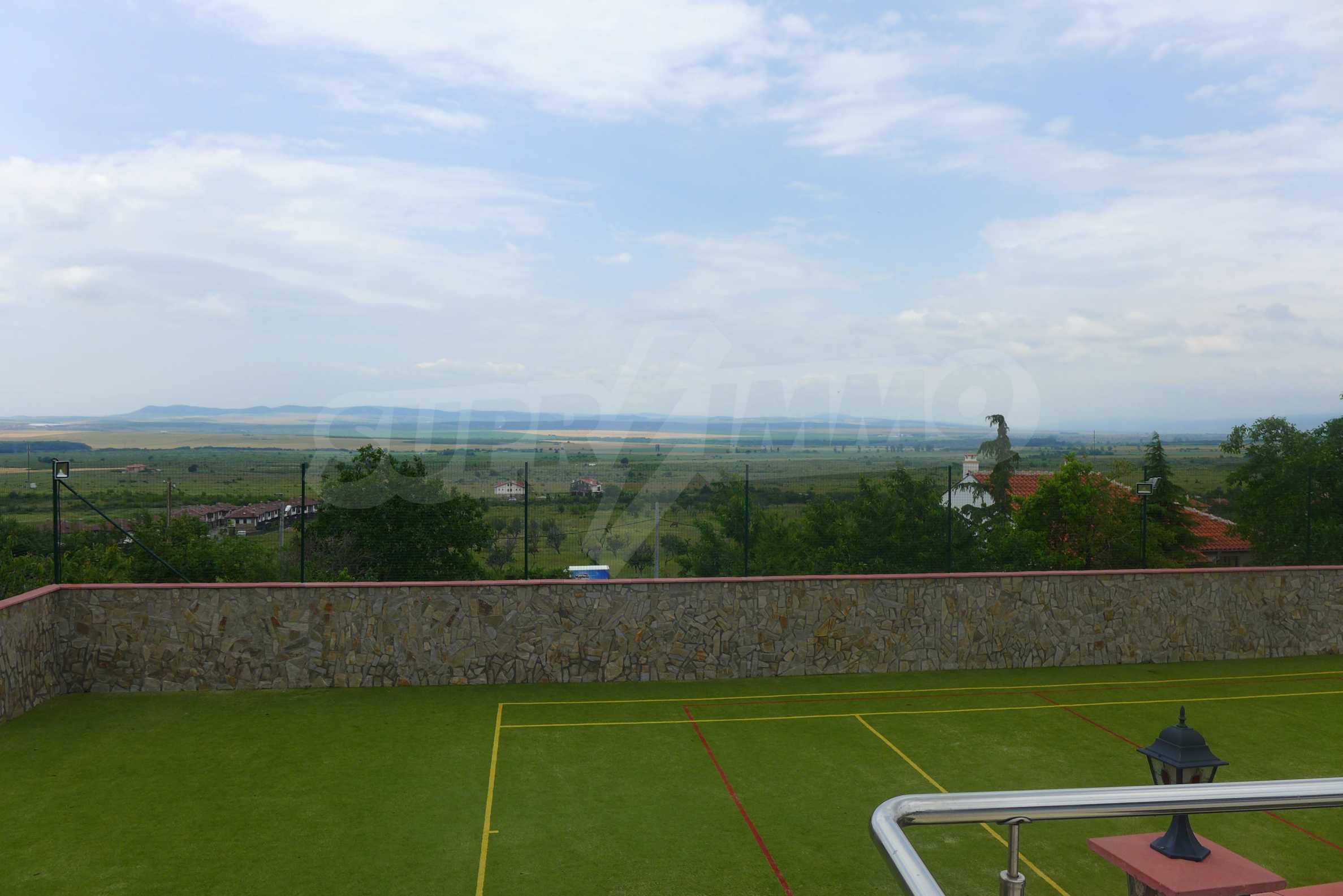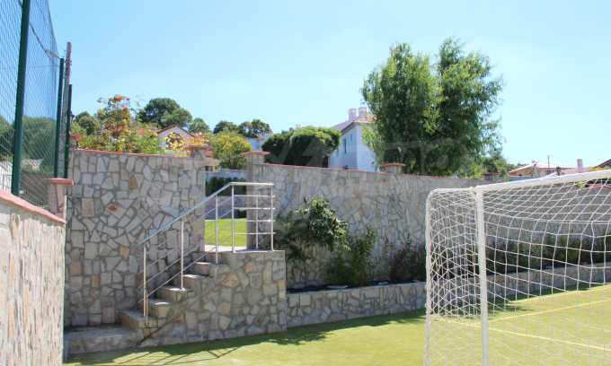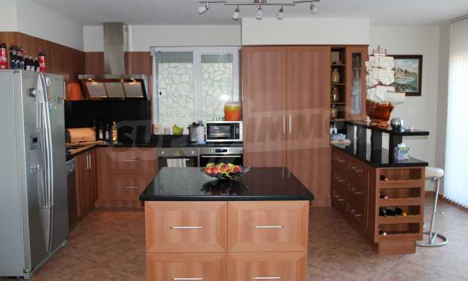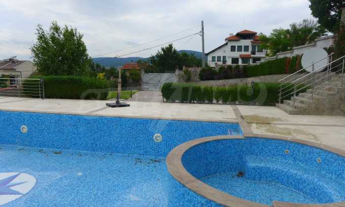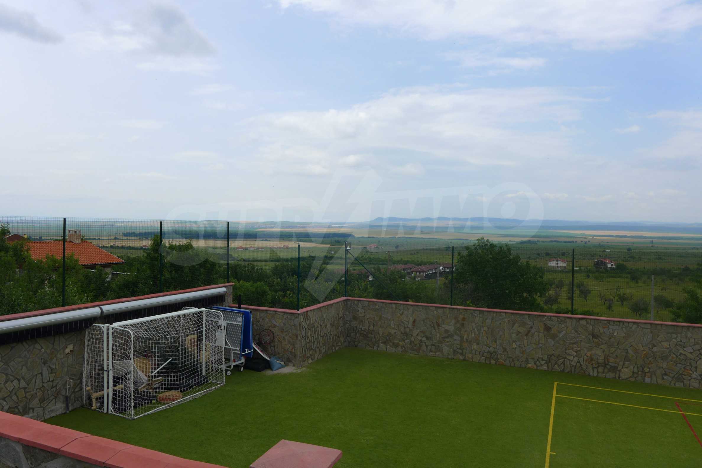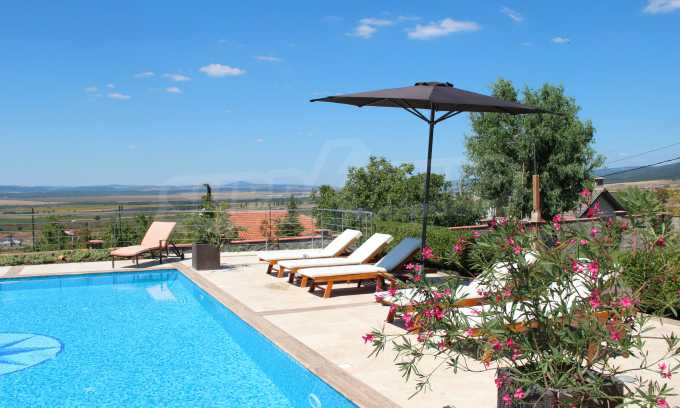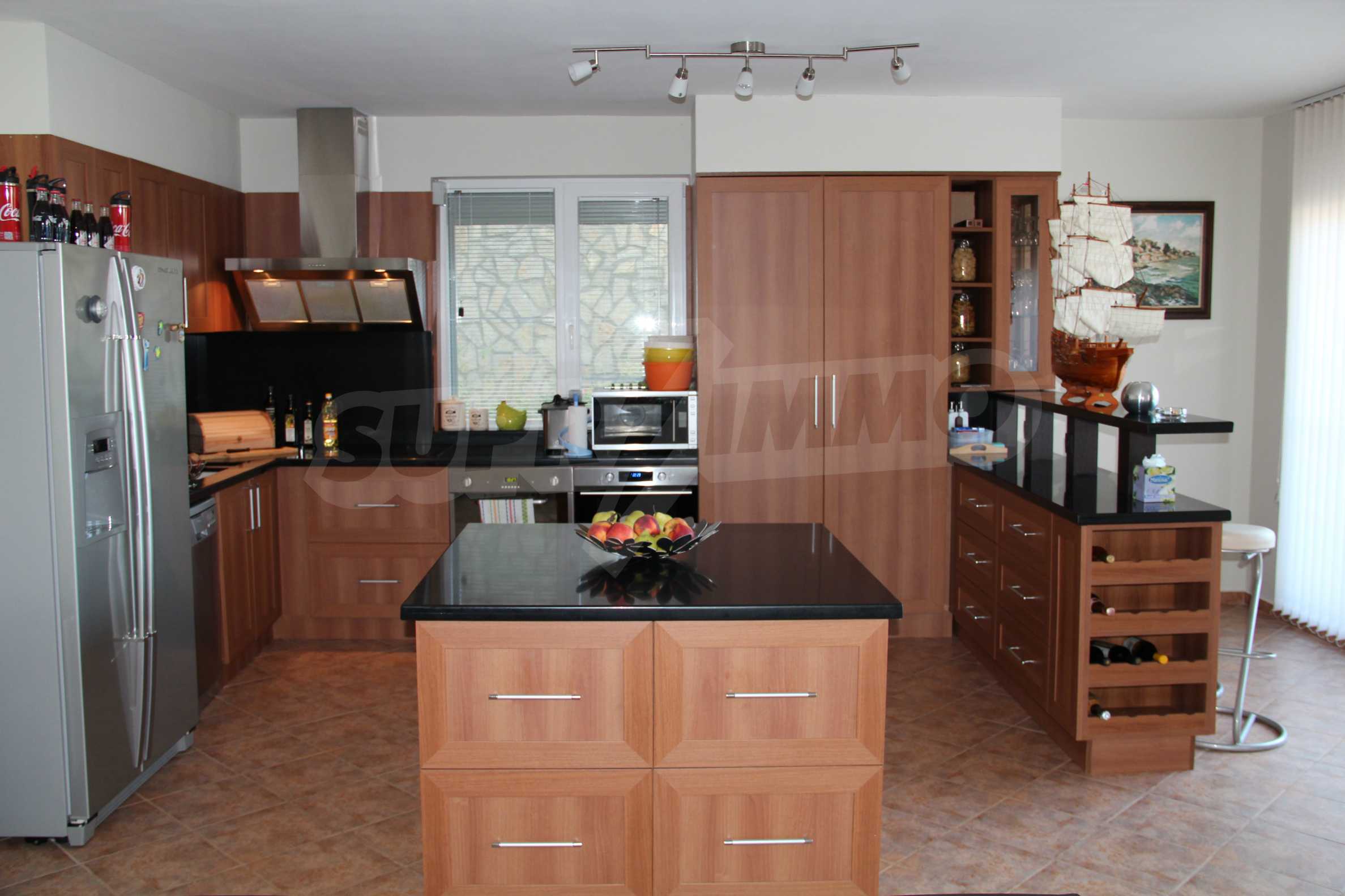 Дом состоит из кухни с гостиной, коридора, ванной комнаты с туалетом, веранды (на первом этаже), четырех спален, двух ванных комнат с туалетом и балконов ( на втором этаже). Недвижимость располагает двором (1000 кв.м.), где находятся: парковка на 5 машин, летняя кухня с барбекю, бассейн с подогревом и джакузи, теннисный корт и футбольное поле, много зелени и цветов в ухоженном саду. Отопление кондиционером. Ламинированный пол, межкомнатные двери, окна пвх, паркетный пол и терракотовый пол имеются в предлагаемой недвижимости. Недвижимость включает следующую мебель и оборудование: ванна, встроенная кухня, вытяжка, духовка, кондиционер, мебель, оборудованная ванная комната, телевизор, телефон и холодильник. Из основных коммуникаций обеспечены электричество, вода и центральная канализация. Заасфальтированная дорога, интернет Wi-Fi, кабельное телевидение, система охранной сигнализации и телефон имеются в наличии среди прочих указанных характеристик предлагаемого объекта, что обеспечит дополнительные удобства для пользования. Виды на бассейн, виды на внутренний двор и виды на горы открываются с недвижимости, раскрывая часть красот живописной Болгарии.