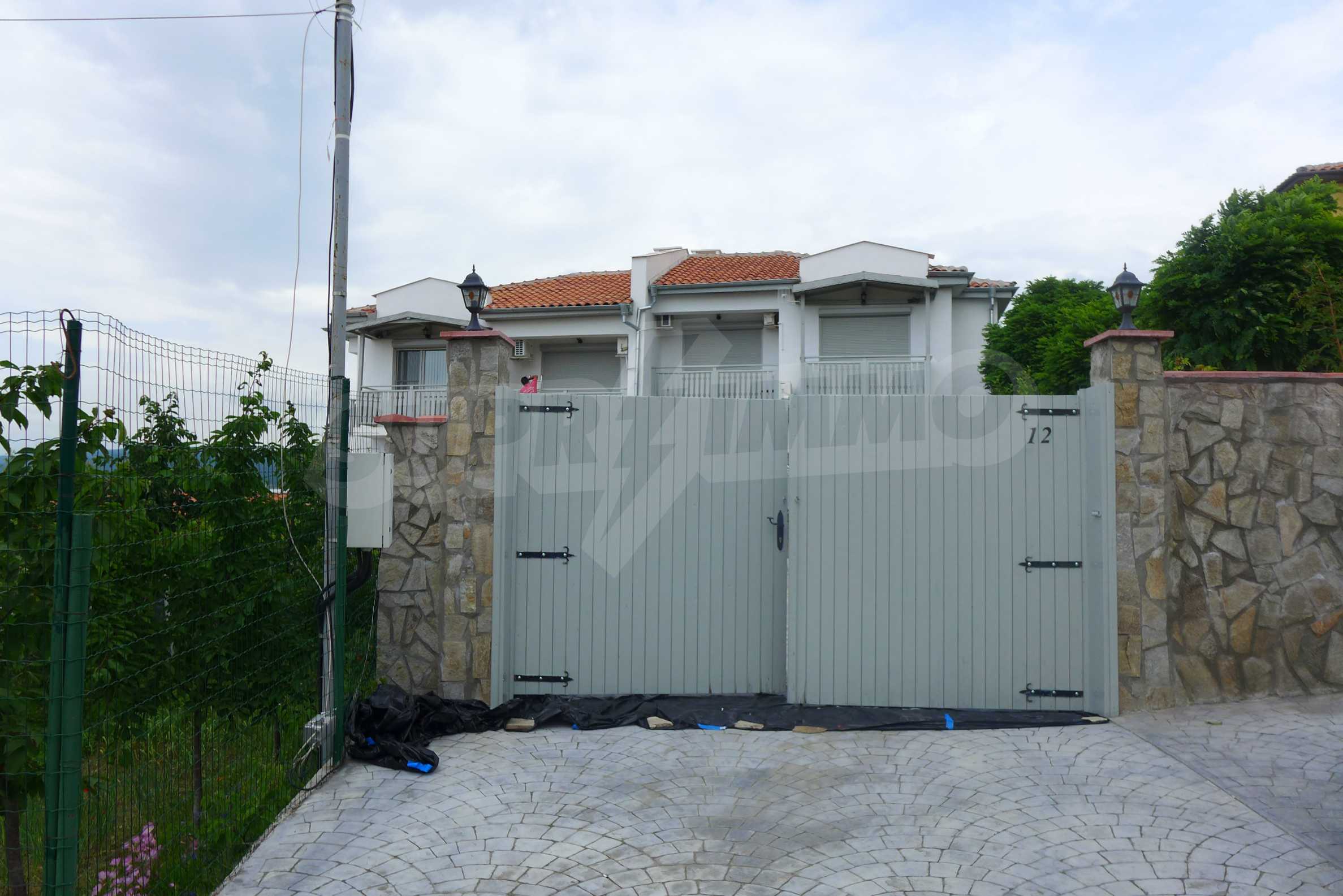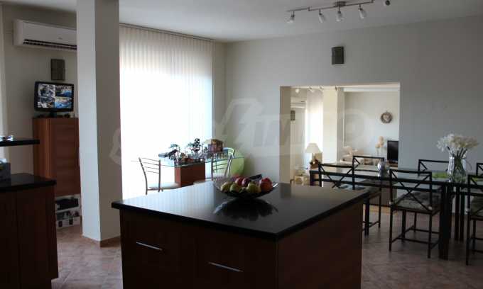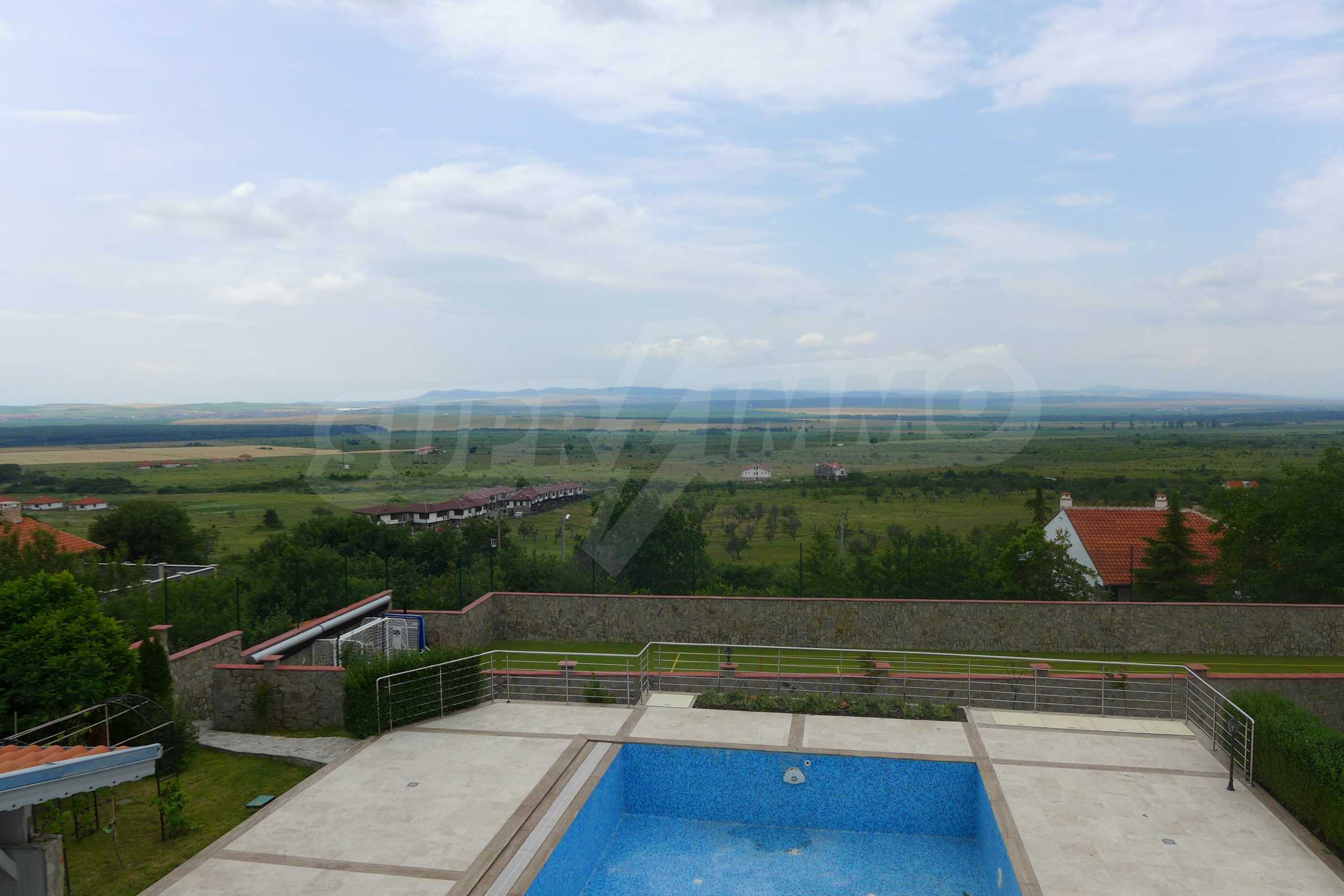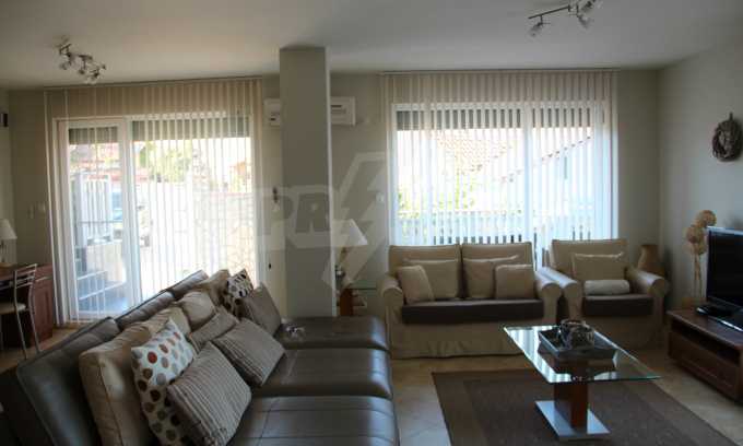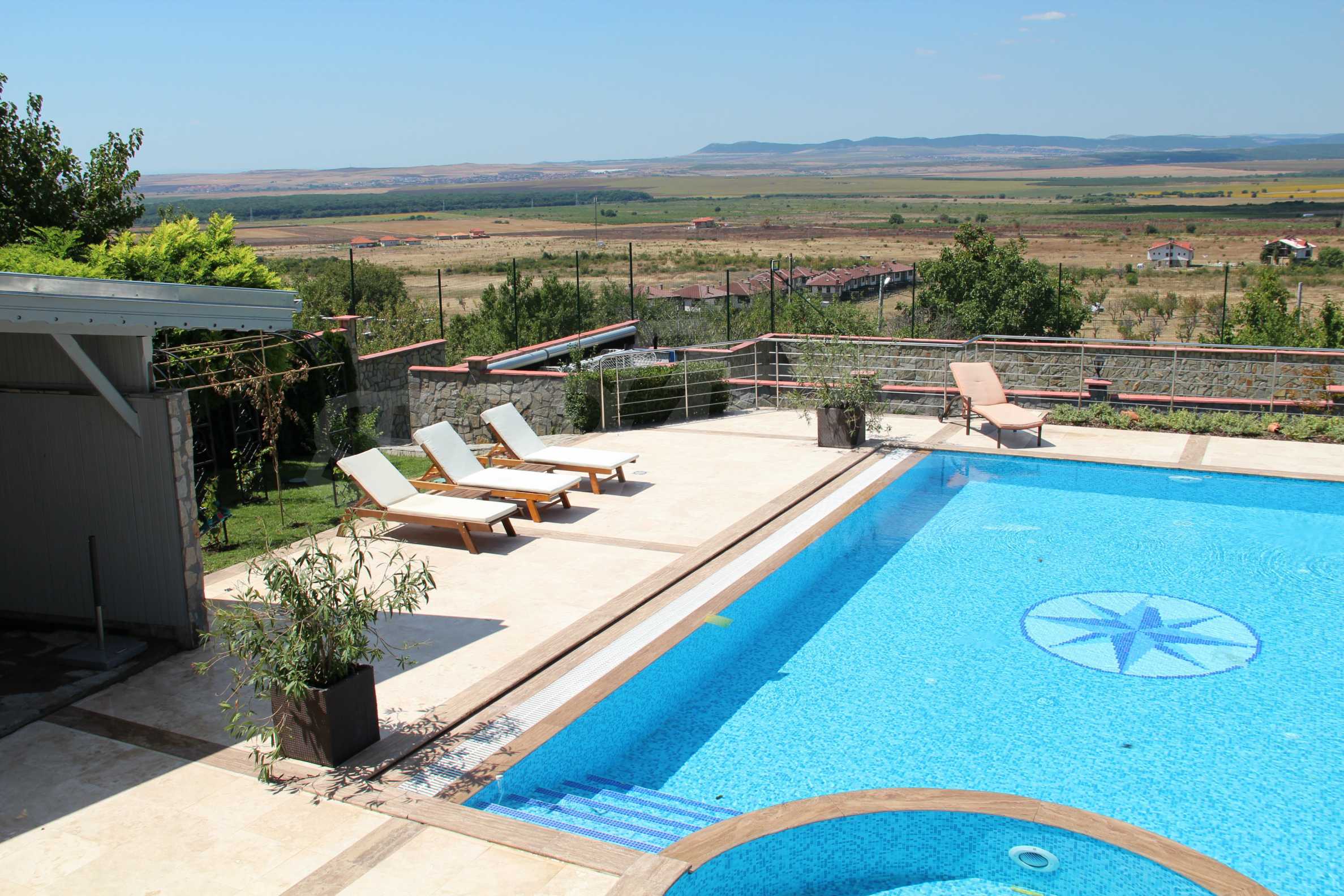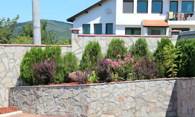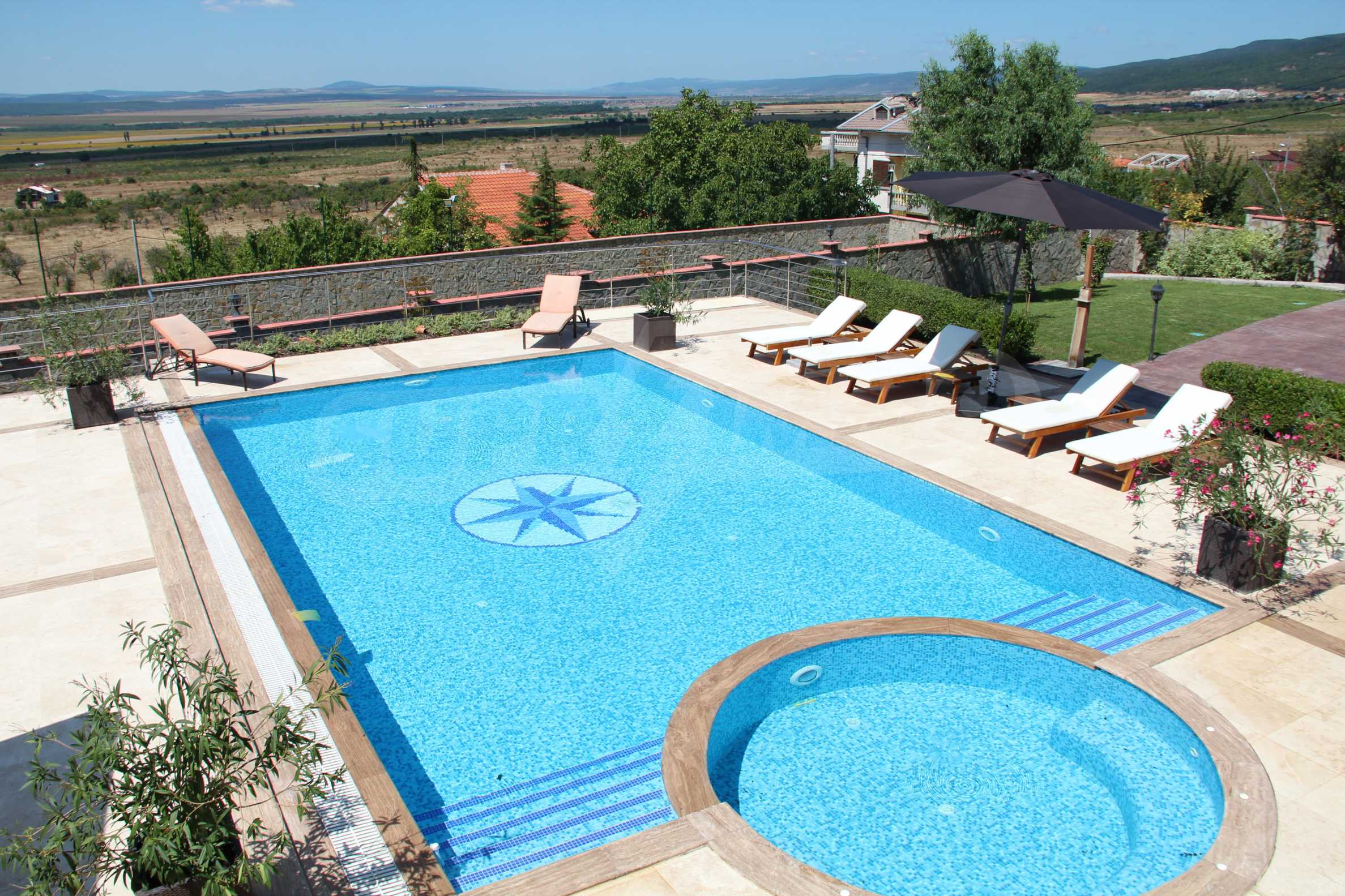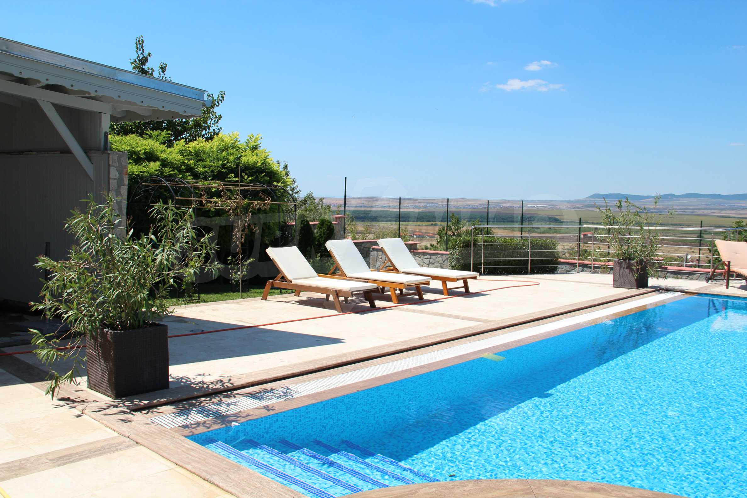 Дом состоит из кухни с гостиной, коридора, ванной комнаты с туалетом, веранды (на первом этаже), четырех спален, двух ванных комнат с туалетом и балконов ( на втором этаже). Недвижимость располагает двором (1000 кв.м.), где находятся: парковка на 5 машин, летняя кухня с барбекю, бассейн с подогревом и джакузи, теннисный корт и футбольное поле, много зелени и цветов в ухоженном саду. Отопление кондиционером. Ламинированный пол, межкомнатные двери, окна пвх, паркетный пол и терракотовый пол имеются в предлагаемой недвижимости. Недвижимость включает следующую мебель и оборудование: ванна, встроенная кухня, вытяжка, духовка, кондиционер, мебель, оборудованная ванная комната, телевизор, телефон и холодильник. Из основных коммуникаций обеспечены электричество, вода и центральная канализация. Заасфальтированная дорога, интернет Wi-Fi, кабельное телевидение, система охранной сигнализации и телефон имеются в наличии среди прочих указанных характеристик предлагаемого объекта, что обеспечит дополнительные удобства для пользования. Виды на бассейн, виды на внутренний двор и виды на горы открываются с недвижимости, раскрывая часть красот живописной Болгарии.
