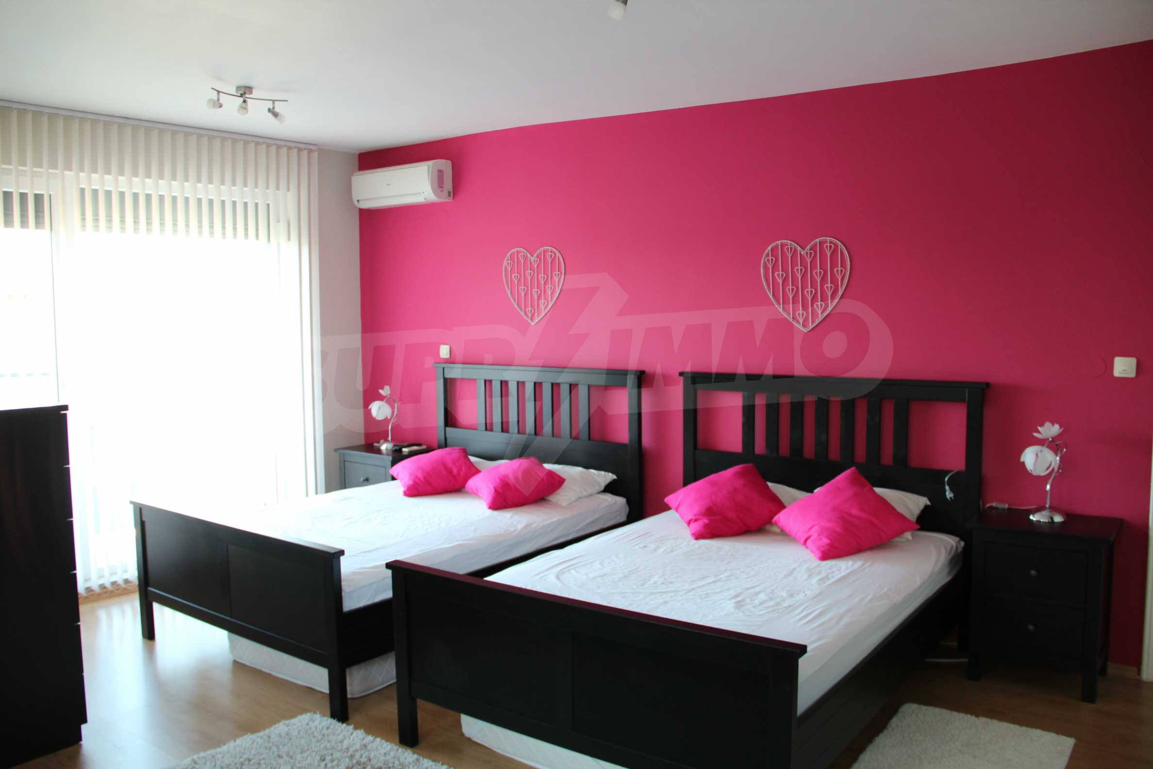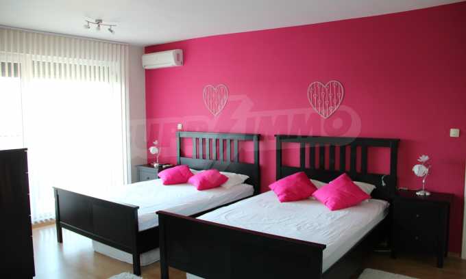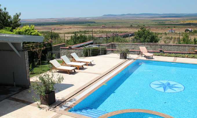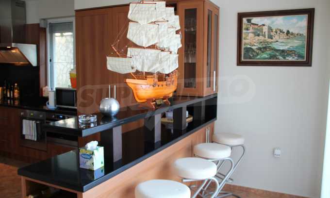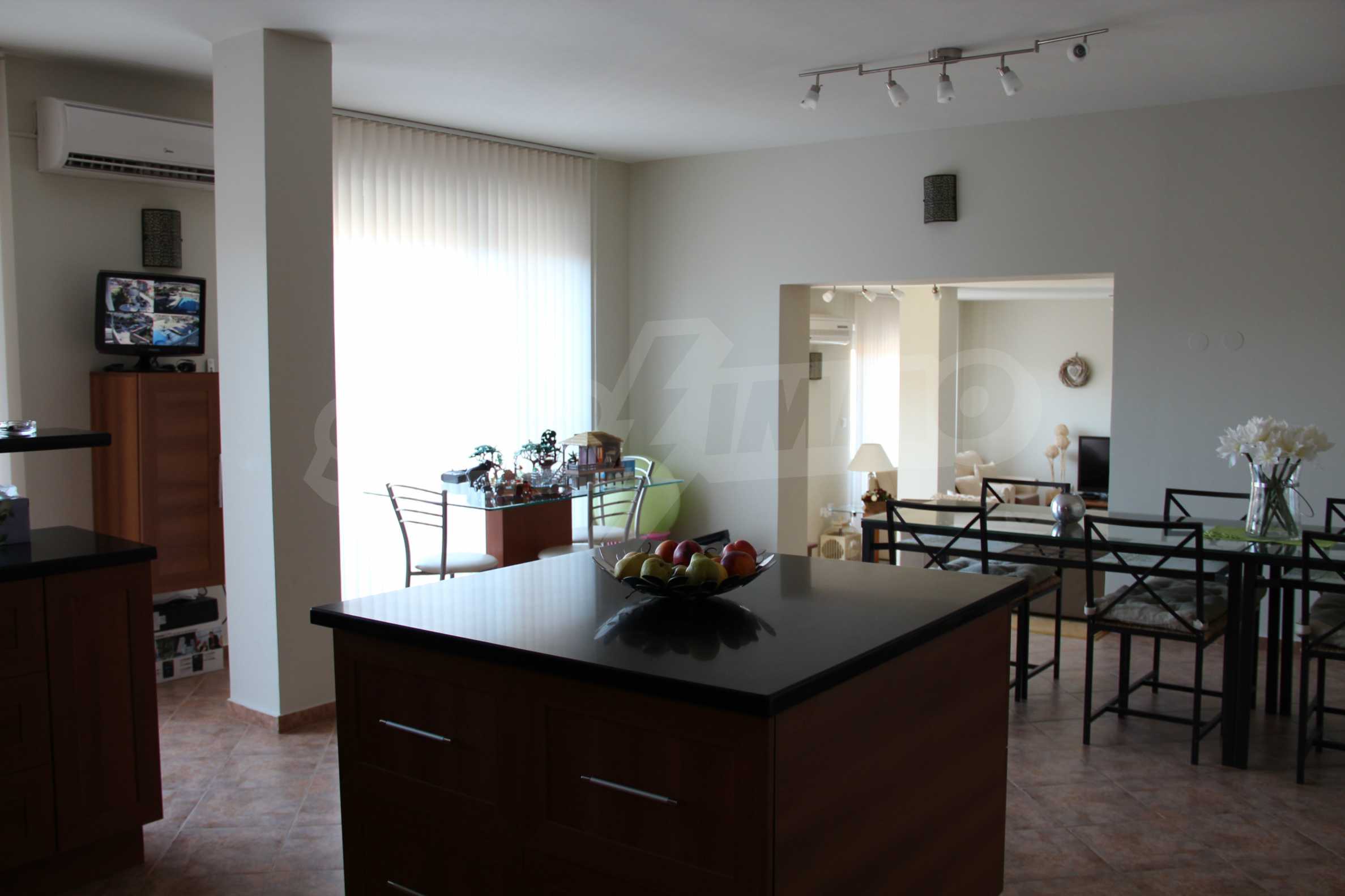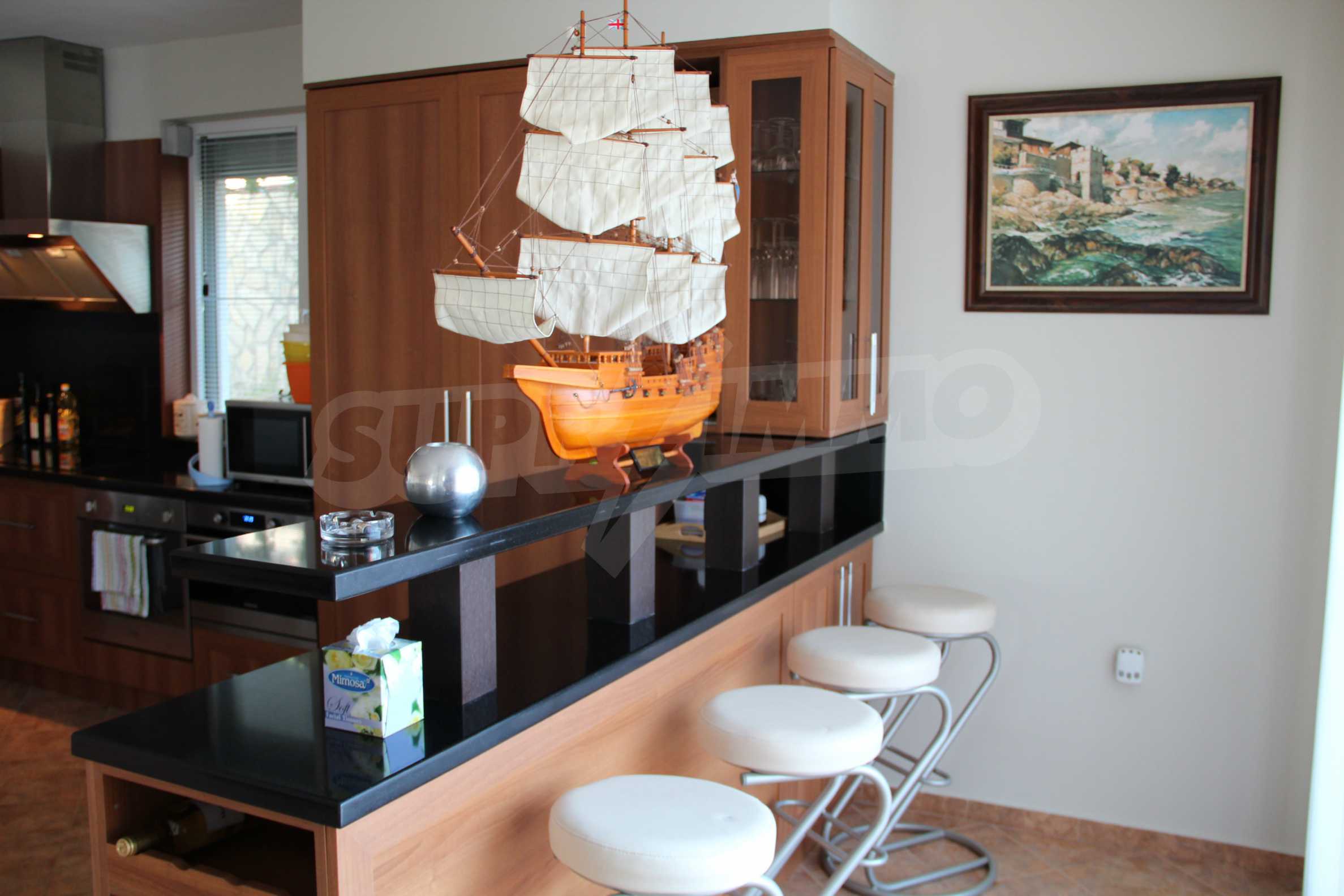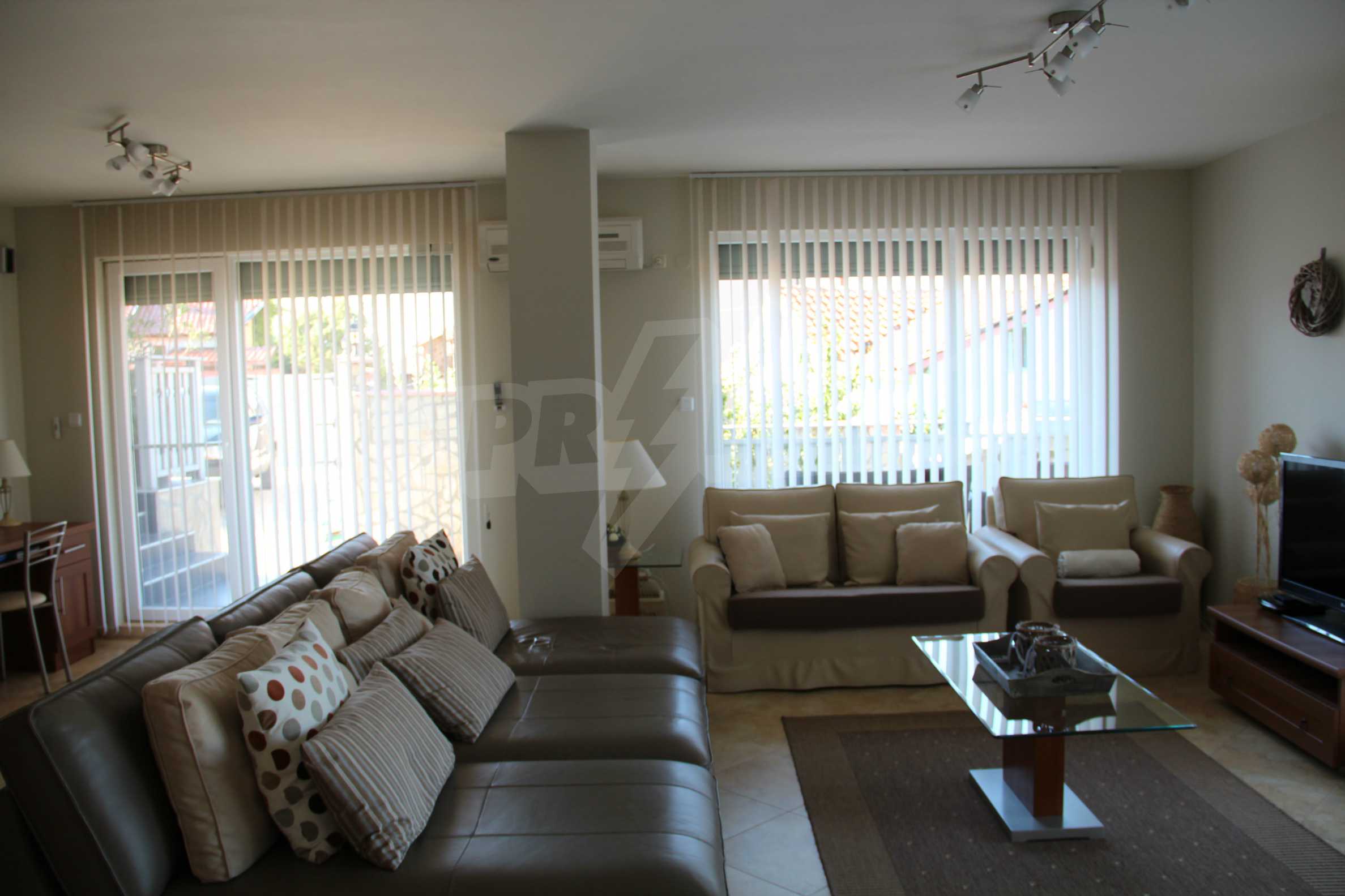 Дом состоит из кухни с гостиной, коридора, ванной комнаты с туалетом, веранды (на первом этаже), четырех спален, двух ванных комнат с туалетом и балконов ( на втором этаже). Недвижимость располагает двором (1000 кв.м.), где находятся: парковка на 5 машин, летняя кухня с барбекю, бассейн с подогревом и джакузи, теннисный корт и футбольное поле, много зелени и цветов в ухоженном саду. Отопление кондиционером. Ламинированный пол, межкомнатные двери, окна пвх, паркетный пол и терракотовый пол имеются в предлагаемой недвижимости. Недвижимость включает следующую мебель и оборудование: ванна, встроенная кухня, вытяжка, духовка, кондиционер, мебель, оборудованная ванная комната, телевизор, телефон и холодильник. Из основных коммуникаций обеспечены электричество, вода и центральная канализация. Заасфальтированная дорога, интернет Wi-Fi, кабельное телевидение, система охранной сигнализации и телефон имеются в наличии среди прочих указанных характеристик предлагаемого объекта, что обеспечит дополнительные удобства для пользования. Виды на бассейн, виды на внутренний двор и виды на горы открываются с недвижимости, раскрывая часть красот живописной Болгарии.