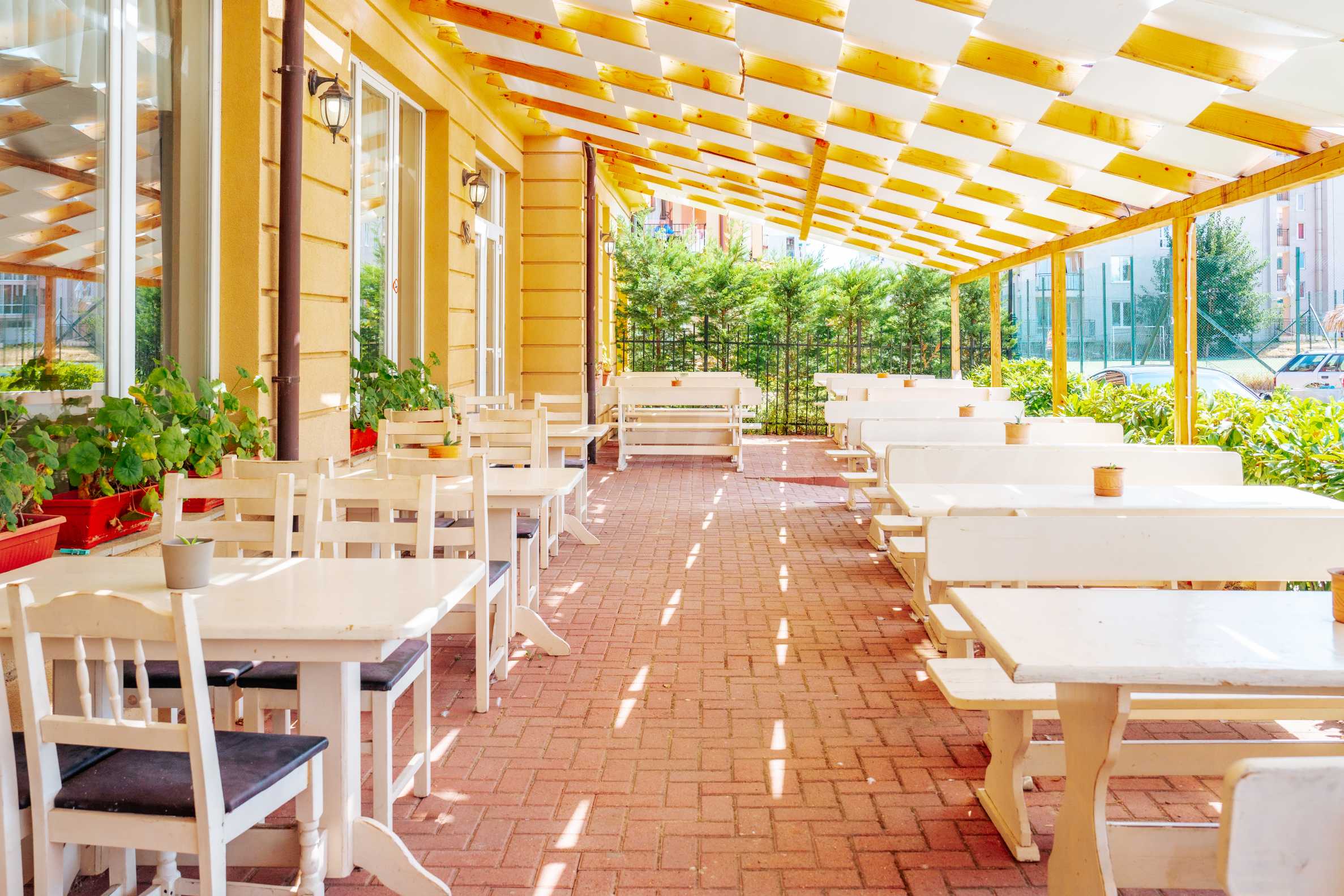 Он рассчитан на 200 мест, а кухня достаточно большая, чтобы накормить более 500 человек. На террасе имеются столы со скамейками и зонтиками.