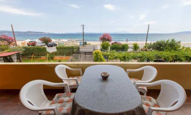 Продаются комплекс апартаментов с видом на море и горы. На первом этаже находится два апартамента площадью 50 и 60 кв.м. На втором этаже расположены апартаменты площадью 80 кв.м. Апартаменты полностью меблированные, комплекс имеет красивую ухоженную территорию. Апартаменты расположены вблизи от песчаного пляжа с прекрасным видом на гору Афон.