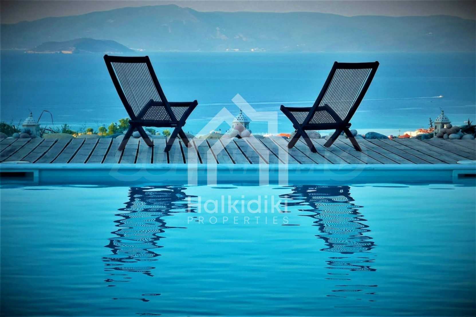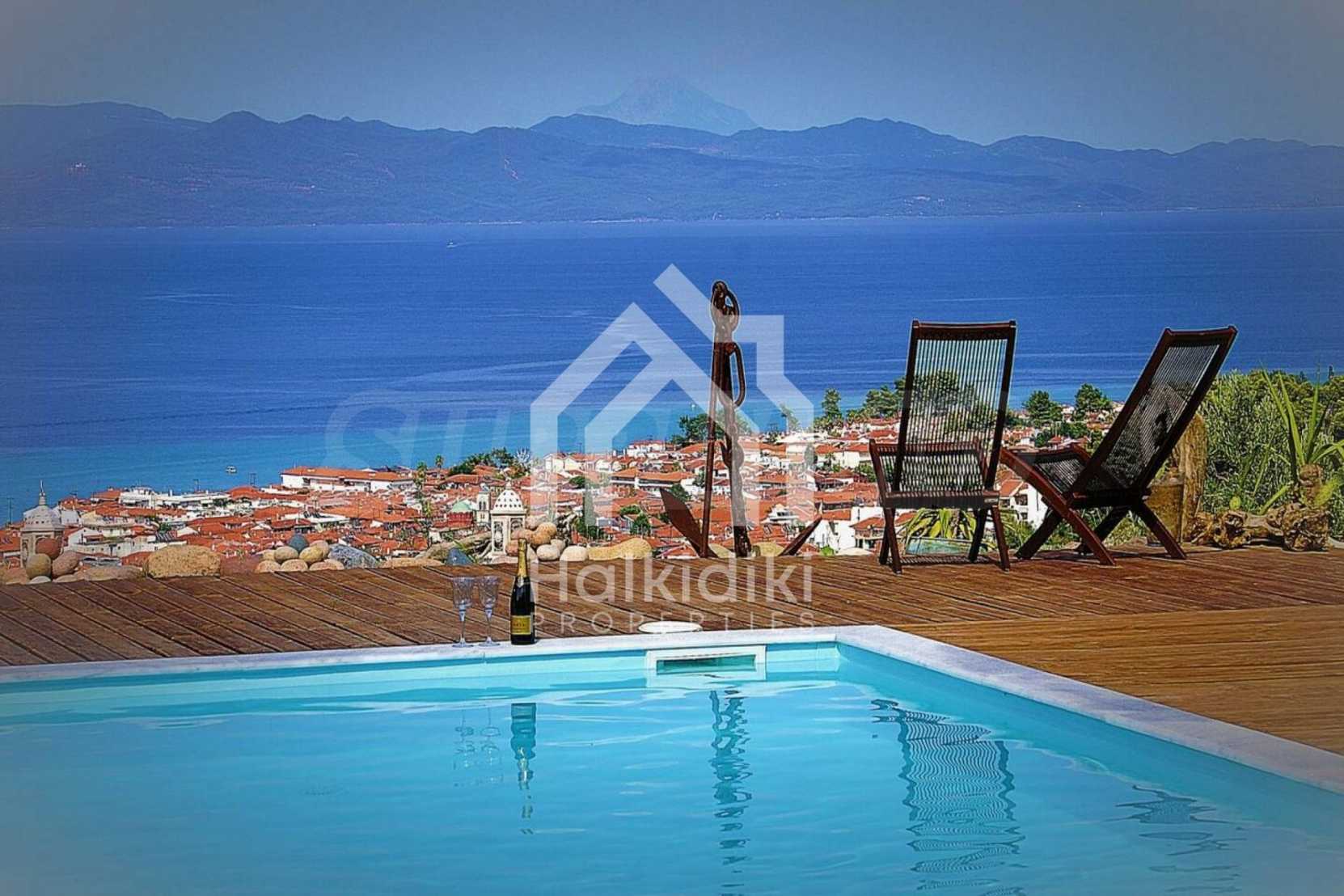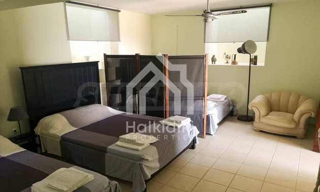 Предлагаем Вашему вниманию роскошную виллу площадью 260 кв. метров. Вилла расположена в живописном месте на холме, из дома открывается неограниченный вид на лазурное Эгейское море, сосновый лес и гору Афон. Из каждой комнаты есть выход на террасу с видом на залив. Удобное расположение виллы сочетает в себе уединение, столь необходимое для отдыха, большим преимуществом является небольшое расстояние от туристического городка с множеством магазинов, баров и ресторанов. Вилла состоит из главного и гостевого дома: главный дом площадью 185 кв. метров, на первом этаже находится гостиная с камином, кухня ALNO (Германия), оборудованная бытовой техникой MIELE (Германия) и wc. В гостиной с панорамными окнами Вы можете насладится прекрасным видом на побережье, на втором этаже находятся две спальни, каждая с собственной ванной комнатой и балконом. Из спален также открывается великолепный вид на море. На первом этаже также находятся комната, которую при желании можно использовать как дополнительную спальню или организовать тренажерный зал, ванная комната, офис, из окна которого открывается великолепный вид на море, также есть склад, прачечная, оборудована стиральной машиной, и гардероб. Гостевой домик общей площадью 75 кв. метров. состоит из трех однокомнатных апартаментов (студио) с отдельными входами. В каждом апартаменте есть спальня, балкон с прекрасным видом на море, ванная комната и небольшая кухня, так что ваши гости могут расслабиться, не стесняя хозяев. Вокруг дома есть огромная площадь приусадебного участка 10000 кв. метров, который условно поделен на две части - 5500 кв. метров и 4500 кв. метров. Существует возможность строительства комплекса из 4 коттеджей на первой линии, и ещё 2 коттеджей на второй. На территории виллы есть летняя кухня, укомплектована бытовой техникой, барбекю, экзотические пальмы, фруктовые деревья, 170 оливковых деревьев с плодовыми крупными маслинами, зеленый газон оснащен системой автоматического полива. В доме есть кондиционеры, бойлер, бак дизельного топлива BUDERUS (Германия). Кроме того, в доме есть кладовка площадью 12 кв. метров, которая может использоваться как еще одна прачечная. Вилла расположена на расстоянии 1000 м от песчаного пляжа.
