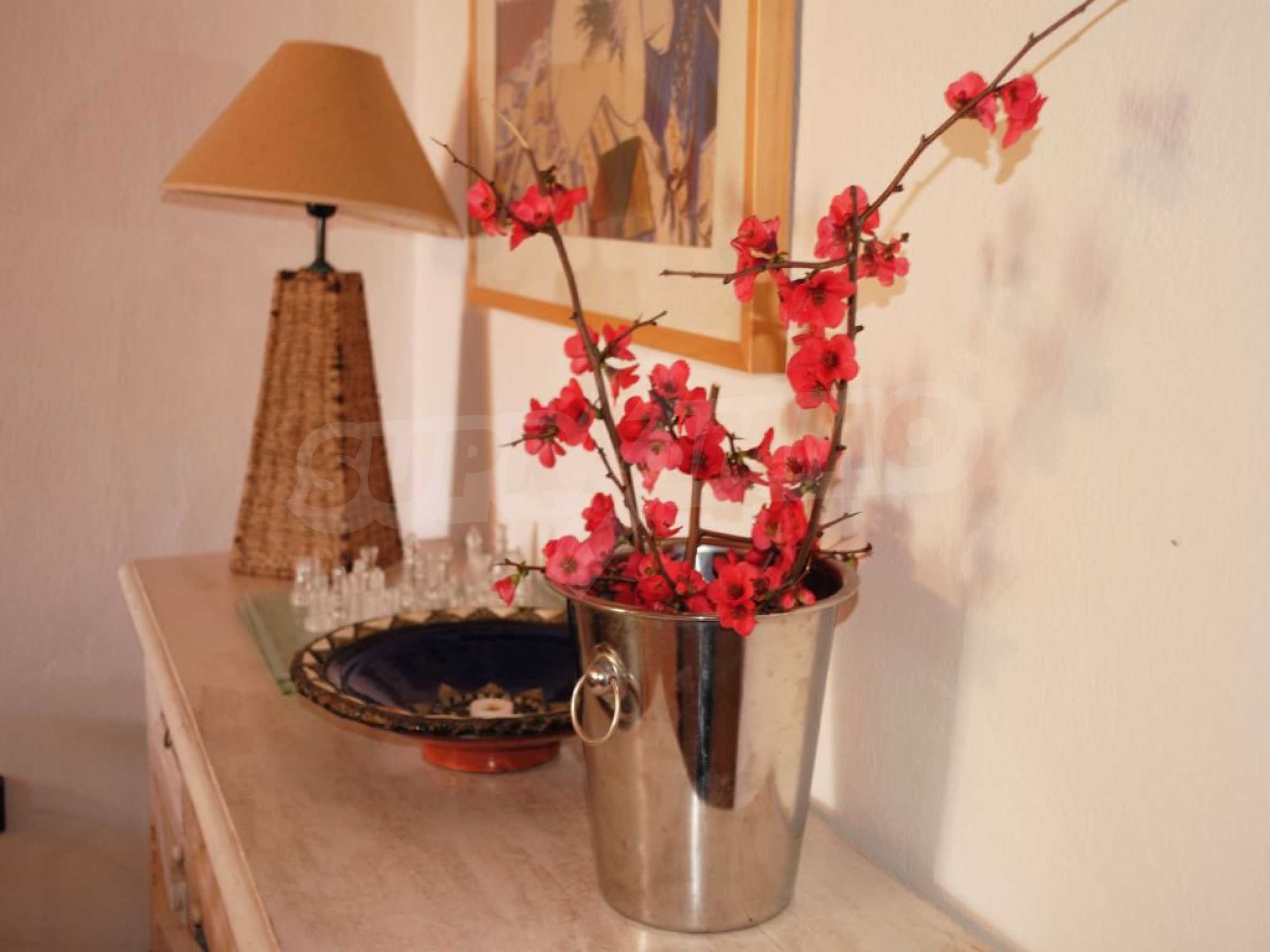 Дом площадью 103 кв.м. Предлагаемая недвижимость построена в 2007. Камин и локальное отопление. Обеспечено кондиционирование следующего типа: система кондиционирования. Армированная входная дверь имеются в предлагаемой недвижимости. Недвижимость включает следующую меблировку и оснащение: встроенная кухня, кондиционер и меблировку. Из основных коммуникаций обеспечены септическая яма. Ванная комната с туалетом, кладовая, обозначенная стоянка, терраса, бассейн, заасфальтированная дорога и система охранной сигнализации имеются в наличии среди прочих отличительных характеристик предлагаемого объекта, что обеспечит дополнительный комфорт для пользования. Виды на море открываются с недвижимости, раскрывая часть красот живописной Болгарии.