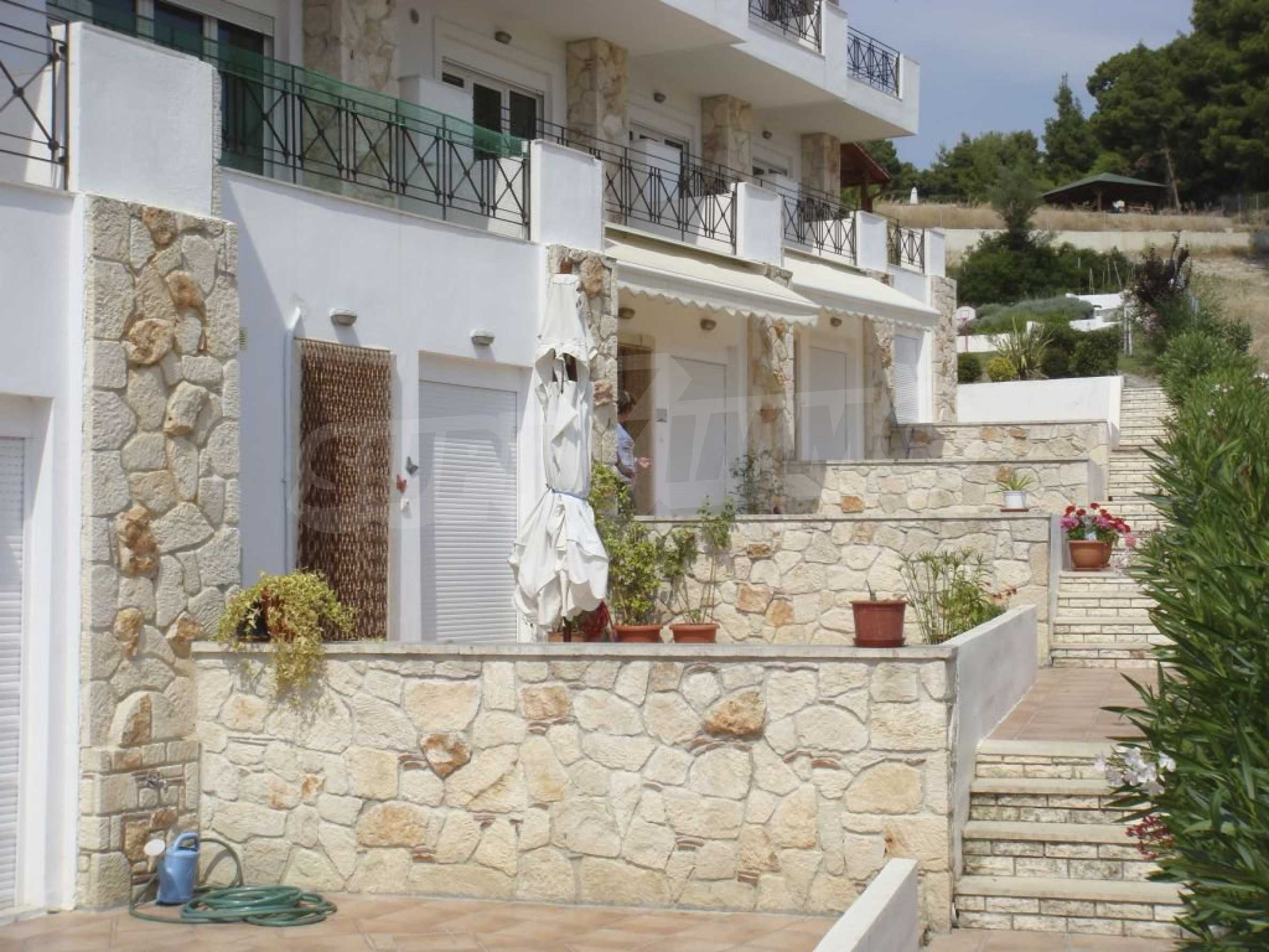 Апартаменты, Кассандра, 65 m, Вид на море, Беспрепятственный вид, Открытый вид, За пределами деревни, Вид на море, Близко к морю, Панорамный вид, Огражденный участок, Светлое помещение, Автоматический полив, Общий бассейн, Бронированная дверь, Без НДС, Современная постройка