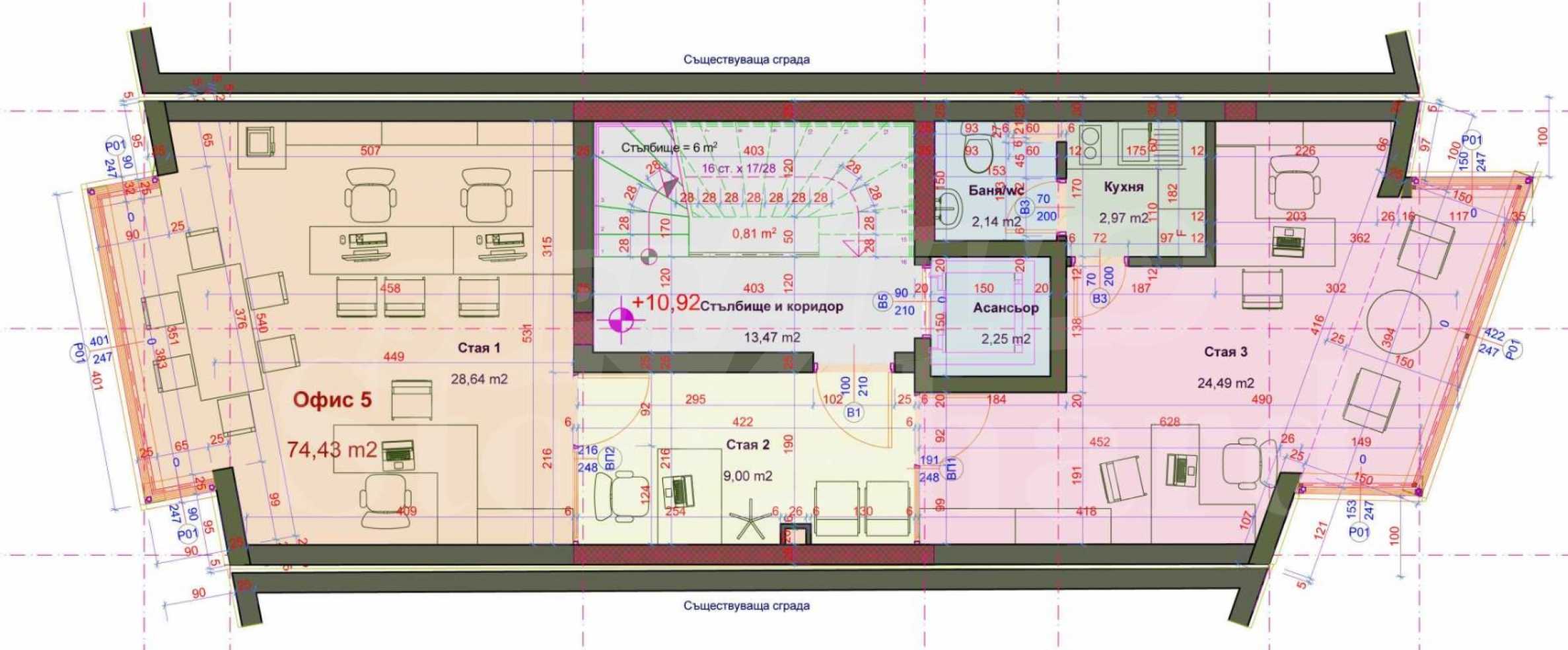 Здание состоит из партера и 4 этажей. Оно оснащено современным гидравлическим лифтом, совершенно новым и очень тихим.