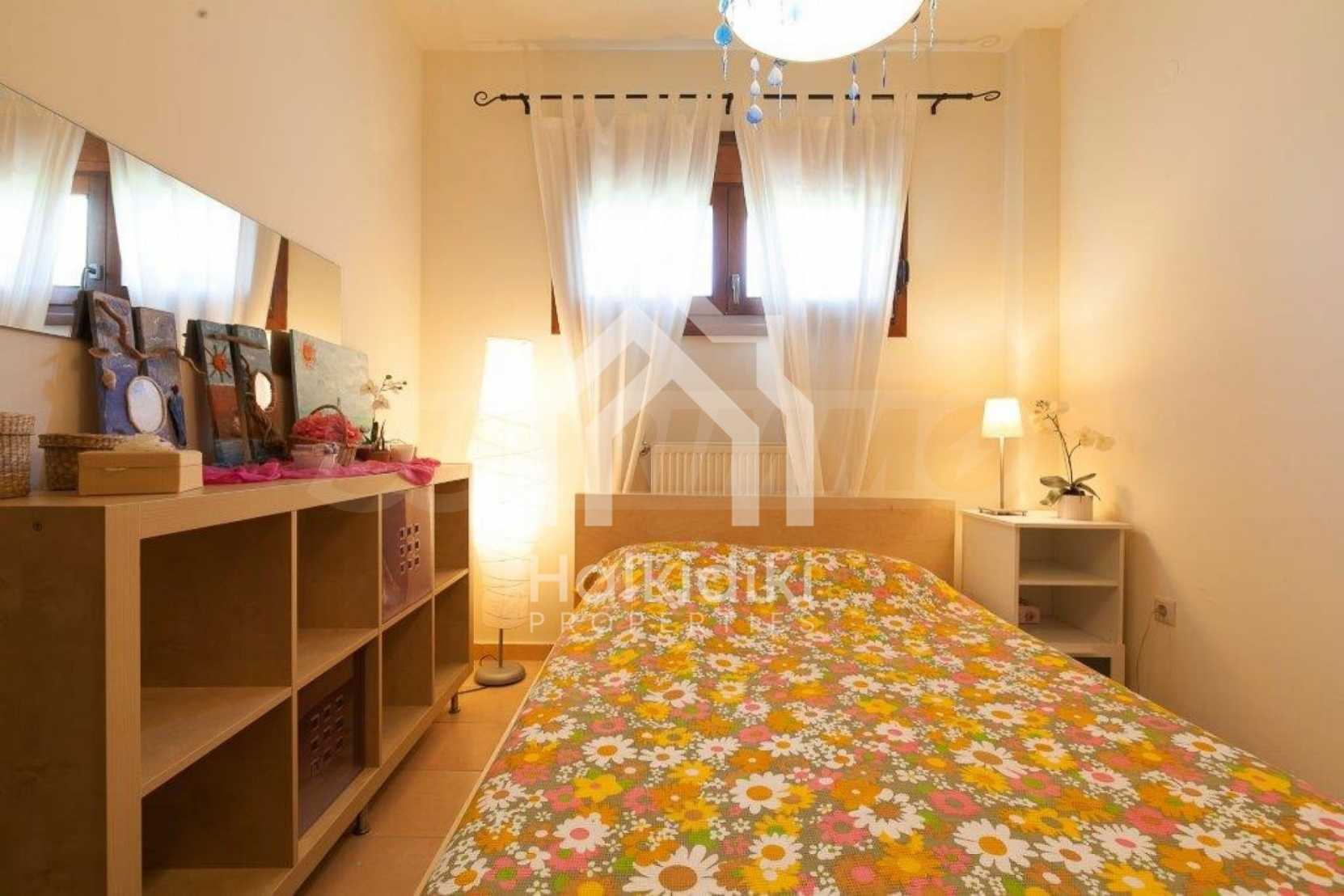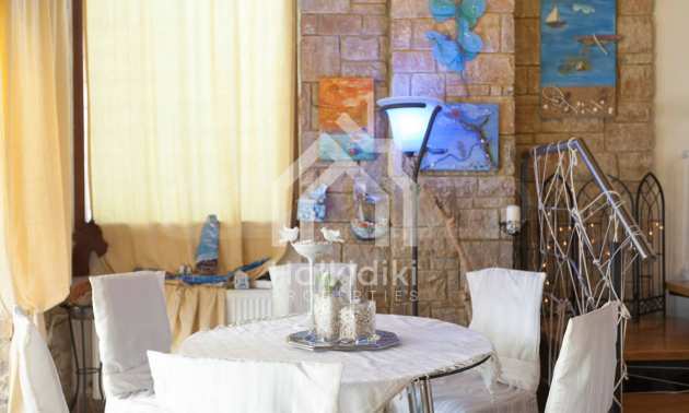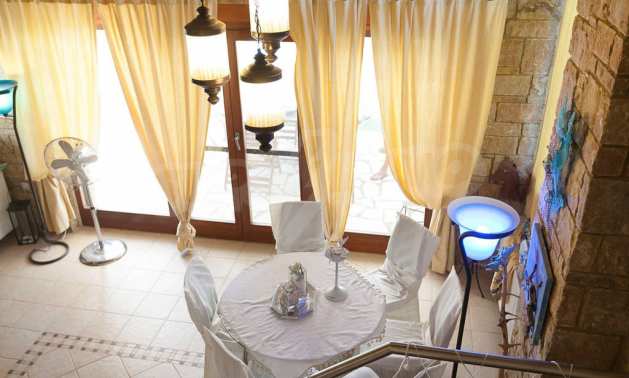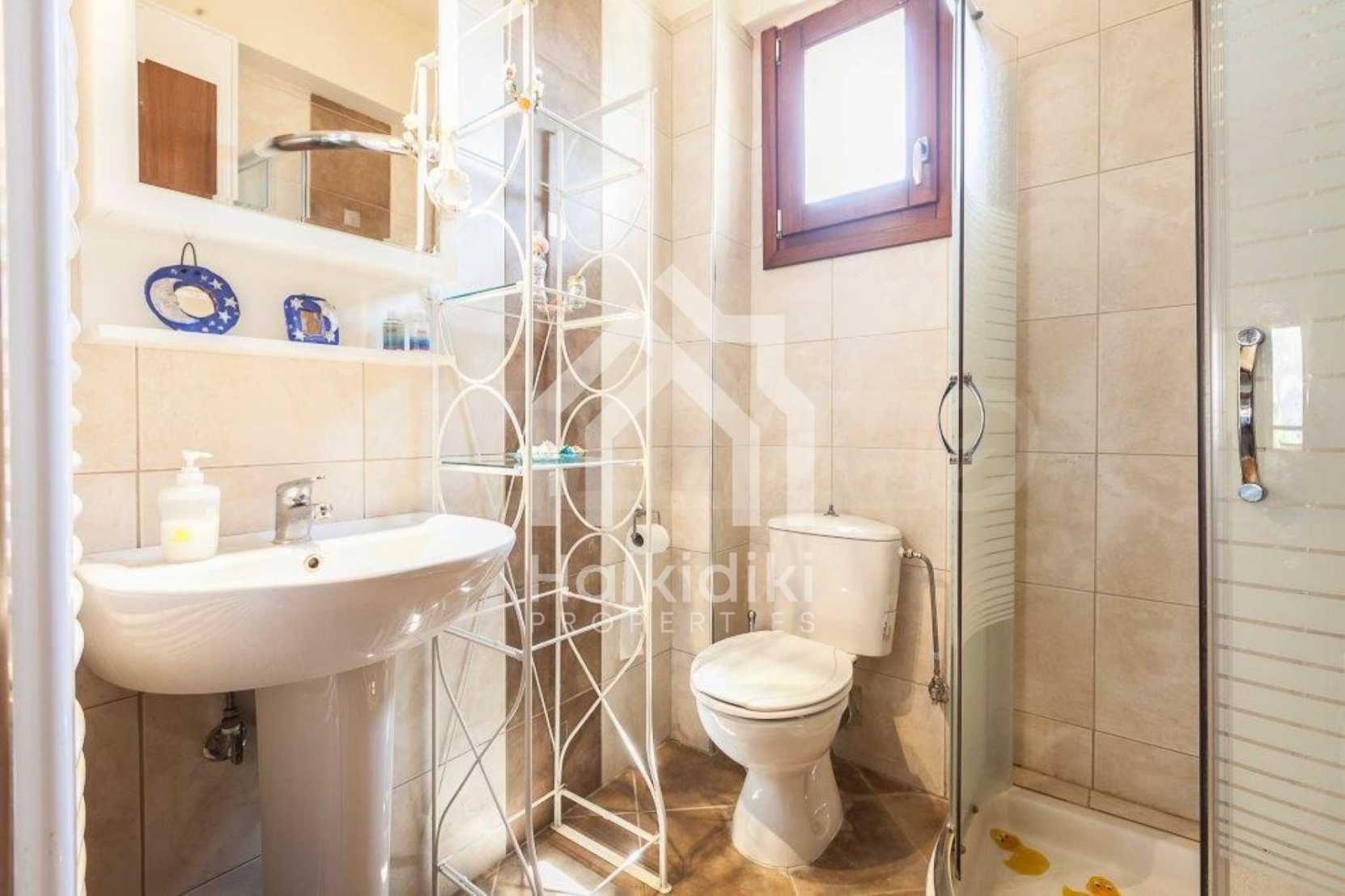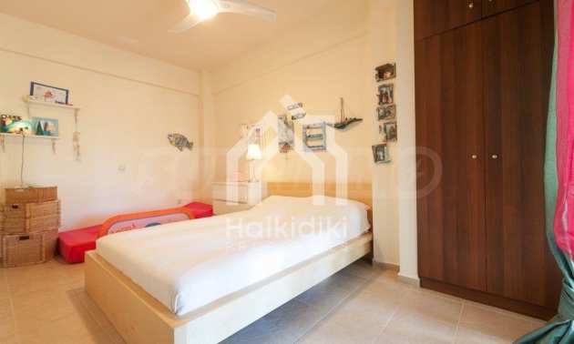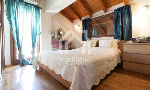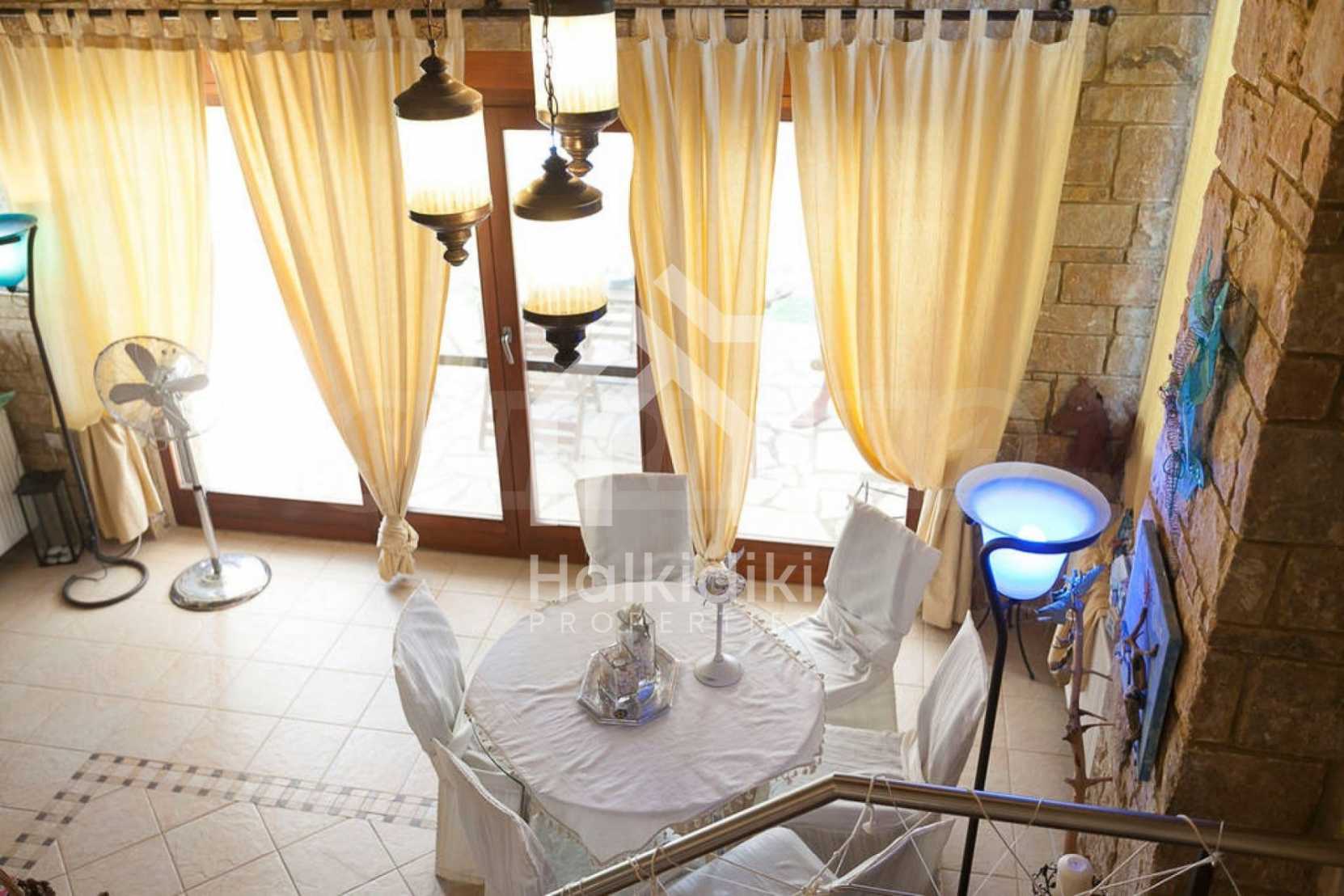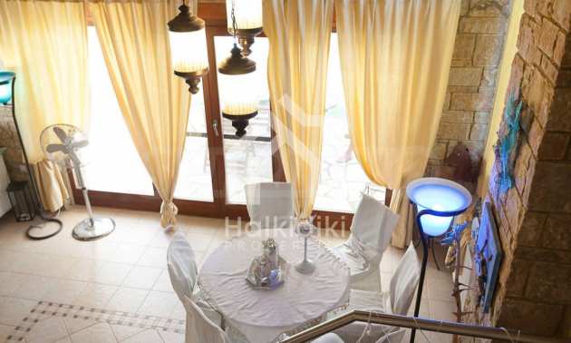 Продается роскошная трехэтажная вилла на полуострове Кассандра площадью 117 кв. метров. Комплекс состоит из 4-х частных вилл и общего бассейна. Дом состоит из трех уровней площадью 40 кв. метров. На цокольном этаже находится большая гостевая комната с двумя диванами и шкафом, где смогут расположится четыре человека, котельни и кладовой. На первом этаже находится спальня с двуспальной кроватью, гостиная, кухня, столовая, камин, телевизор, посудомоечная машина, все кухонные приборы, посуда и т.д. На втором этаже есть еще одна комната с двуспальной кроватью. В каждой комнате установлены кондиционеры и телевизор, на каждом этаже есть ванная комната с душевой кабиной. На веранде есть обеденный уголок со столом для шести человек. В доме есть wifi. В саду есть барбекю, четыре шезлонга и навес для бассейна. Размеры бассейна составляют 5x12м и глубиной 0,90 - 2,20 м. Существует парковка для двух машин.