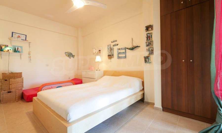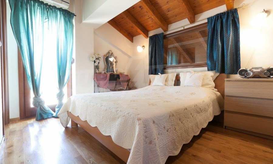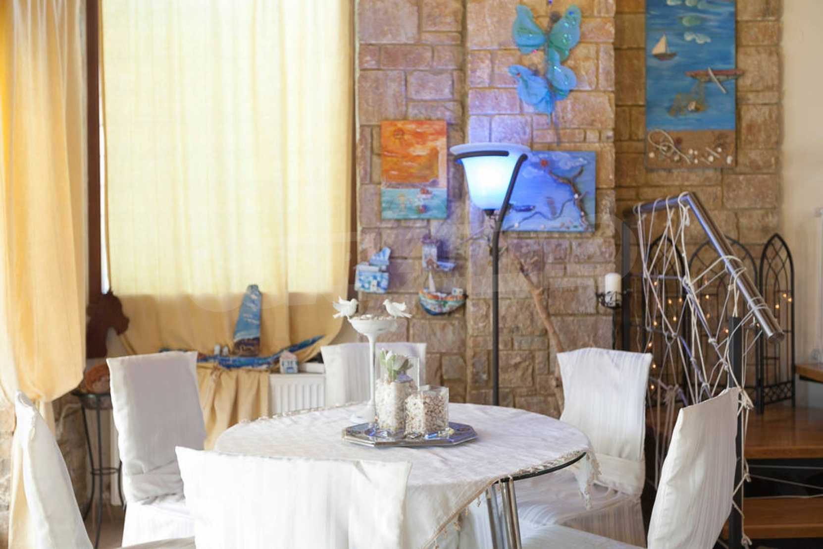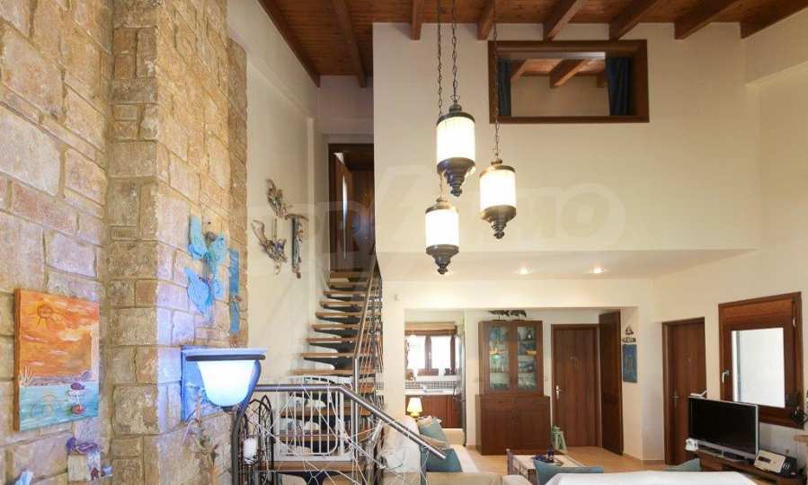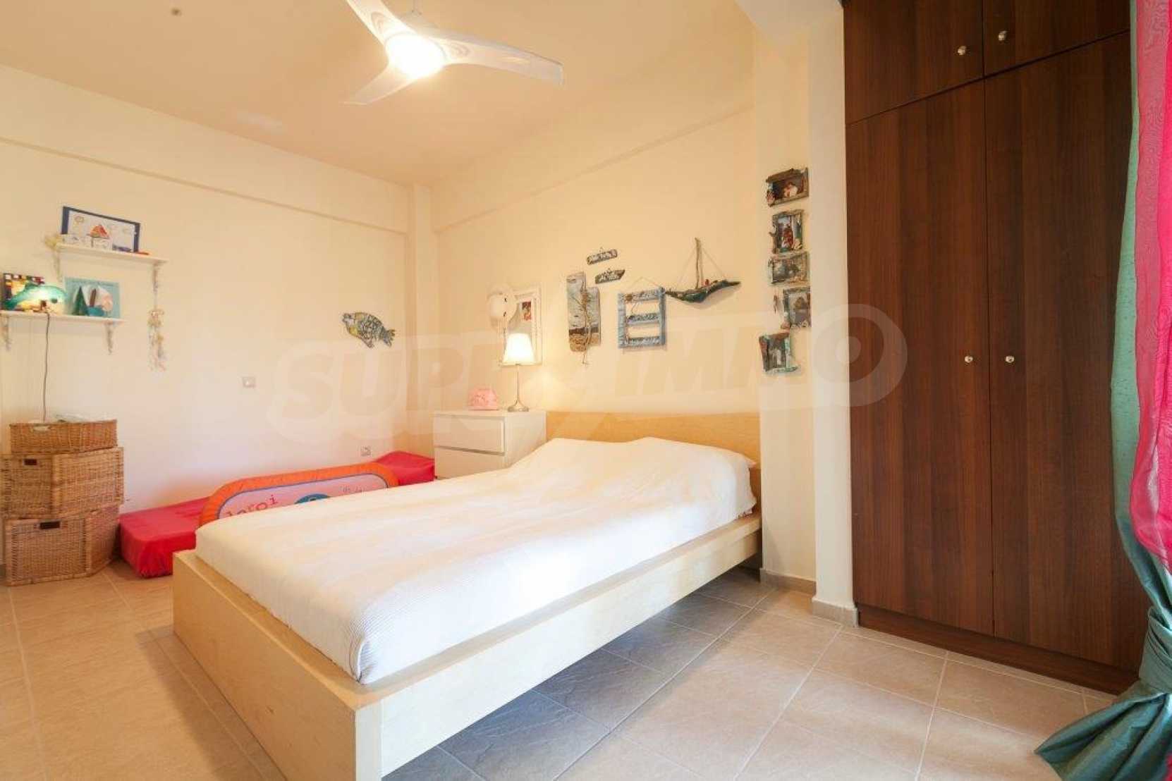 Продается роскошная трехэтажная вилла на полуострове Кассандра площадью 117 кв. метров. Комплекс состоит из 4-х частных вилл и общего бассейна. Дом состоит из трех уровней площадью 40 кв. метров. На цокольном этаже находится большая гостевая комната с двумя диванами и шкафом, где смогут расположится четыре человека, котельни и кладовой. На первом этаже находится спальня с двуспальной кроватью, гостиная, кухня, столовая, камин, телевизор, посудомоечная машина, все кухонные приборы, посуда и т.д. На втором этаже есть еще одна комната с двуспальной кроватью. В каждой комнате установлены кондиционеры и телевизор, на каждом этаже есть ванная комната с душевой кабиной. На веранде есть обеденный уголок со столом для шести человек. В доме есть wifi. В саду есть барбекю, четыре шезлонга и навес для бассейна. Размеры бассейна составляют 5x12м и глубиной 0,90 - 2,20 м. Существует парковка для двух машин.