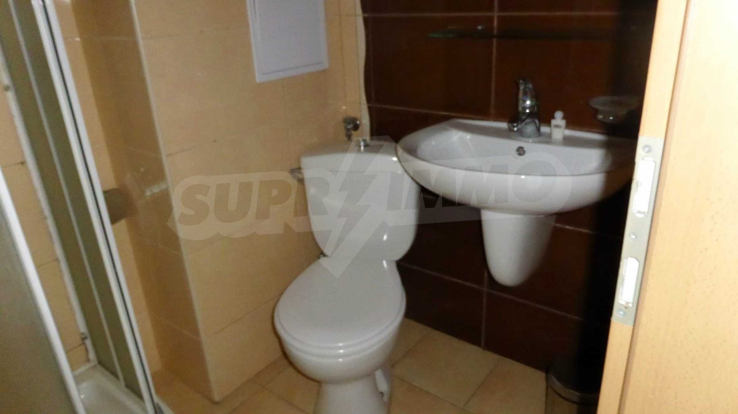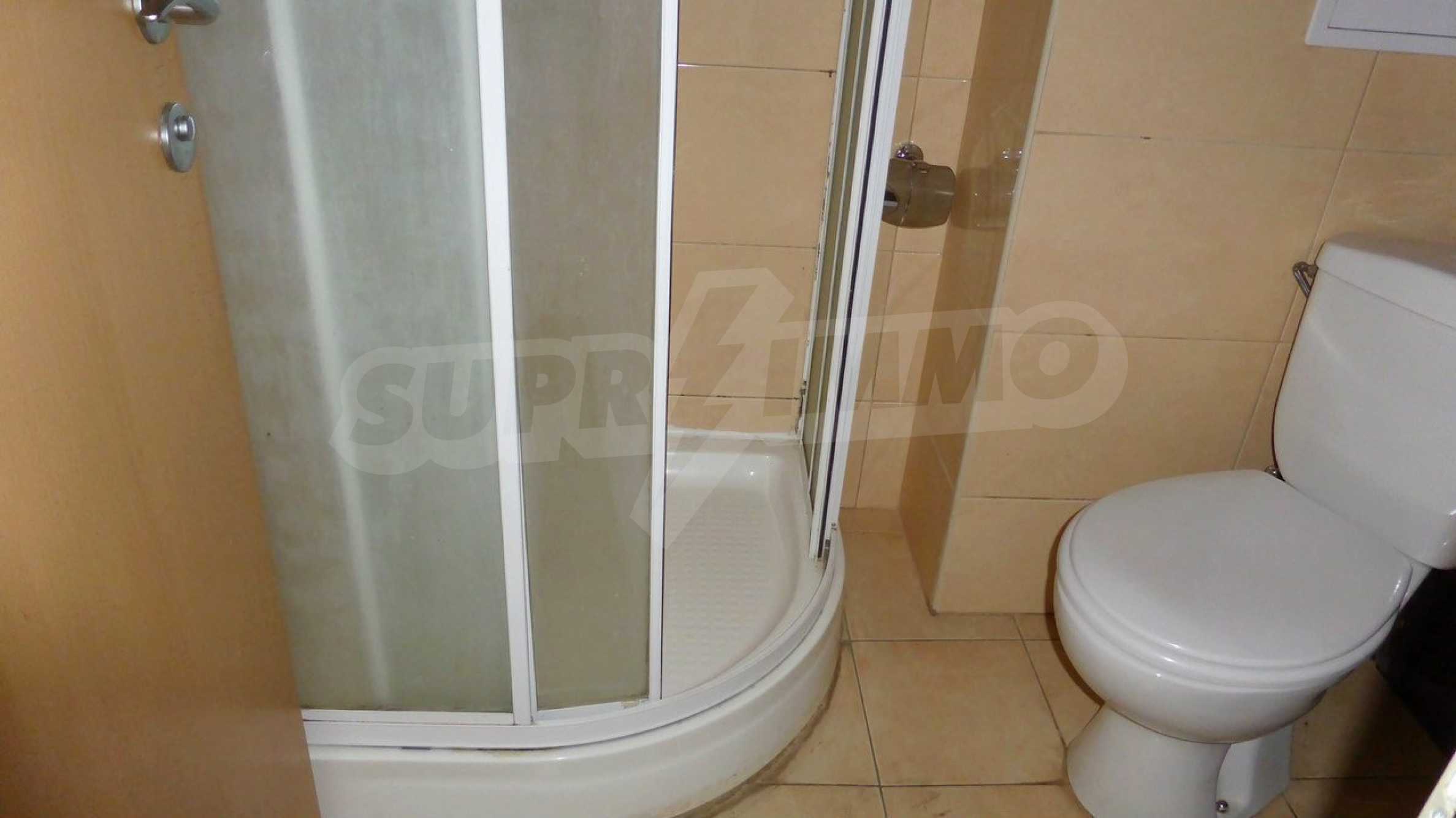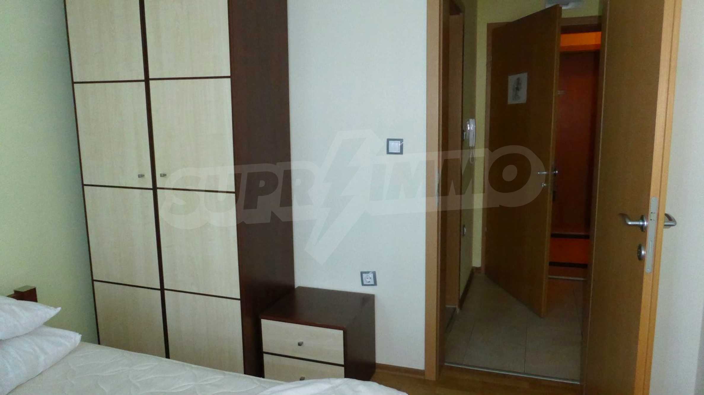 Двухкомнатная квартира площадью 49 кв. метров. Отопление кондиционером. Обеспечено кондиционирование следующего типа: стандартные кондиционеры. Двойной стеклопакет, ламинированный пол, межкомнатные двери, окна пвх, стены покрашенные латексной краской и терракотовый пол имеются в предлагаемой недвижимости. Недвижимость включает следующую меблировку и оснащение: бойлер электрический, встроенная кухня, вытяжка, духовка, душевая, кондиционер, меблировку, оборудованная ванная комната, телевизор и холодильник. Из основных коммуникаций обеспечены электричество, центральное водоснабжение и центральная канализация. Балконы, ванная комната с туалетом, подземная стоянка, стоянка, бассейн, джакузи, комплекс закрытого типа, консьерж, лифт, сауна, тренажерный зал, заасфальтированная дорога, интернет, интернет Wi-Fi, кабельное телевидение, система охранной сигнализации и телефон имеются в наличии среди прочих указанных обозначенных упомянутых характеристик предлагаемого объекта, что обеспечит дополнительный комфорт для пользования. Виды на бассейн открываются с недвижимости, раскрывая часть красот живописной Болгарии.