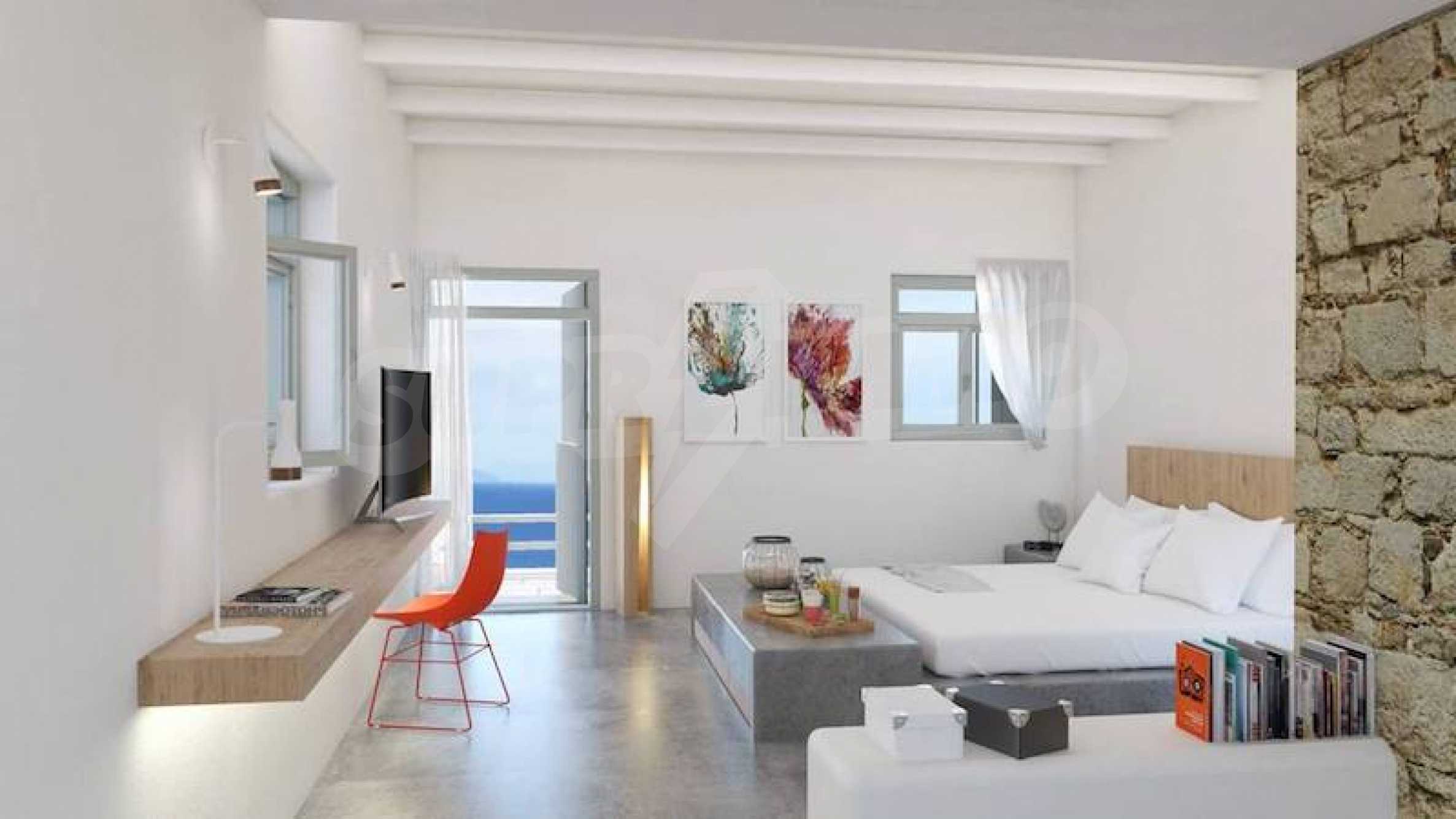 Использование сочетания минималистской архитектуры и традиционного кикладского видения, а также чистых материалов являются ключом к конечному результату этого проекта. Стильный и гостеприимный, этот отель приветствует прочную связь с природой и прекрасной зоной отдыха у бассейна.