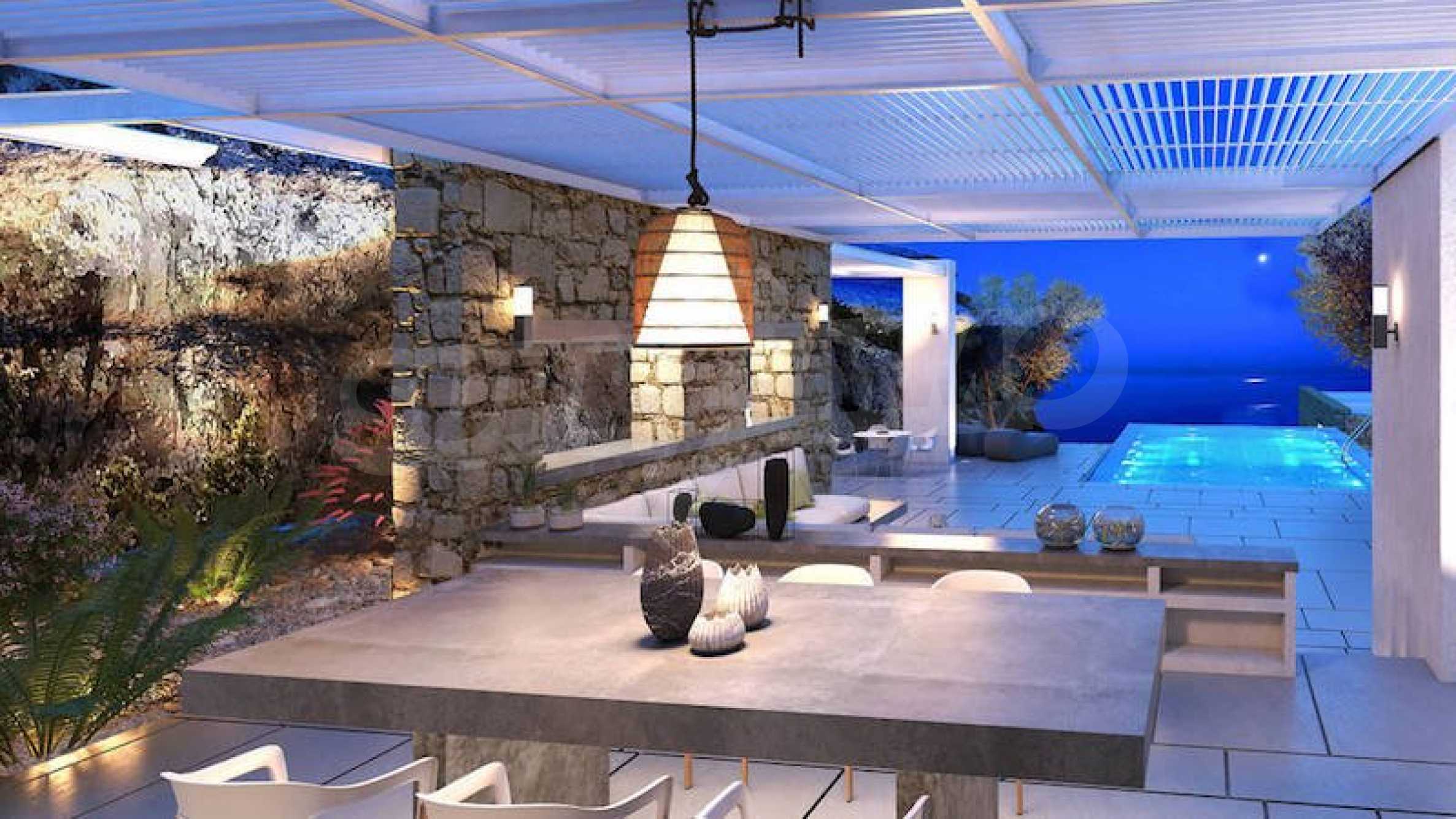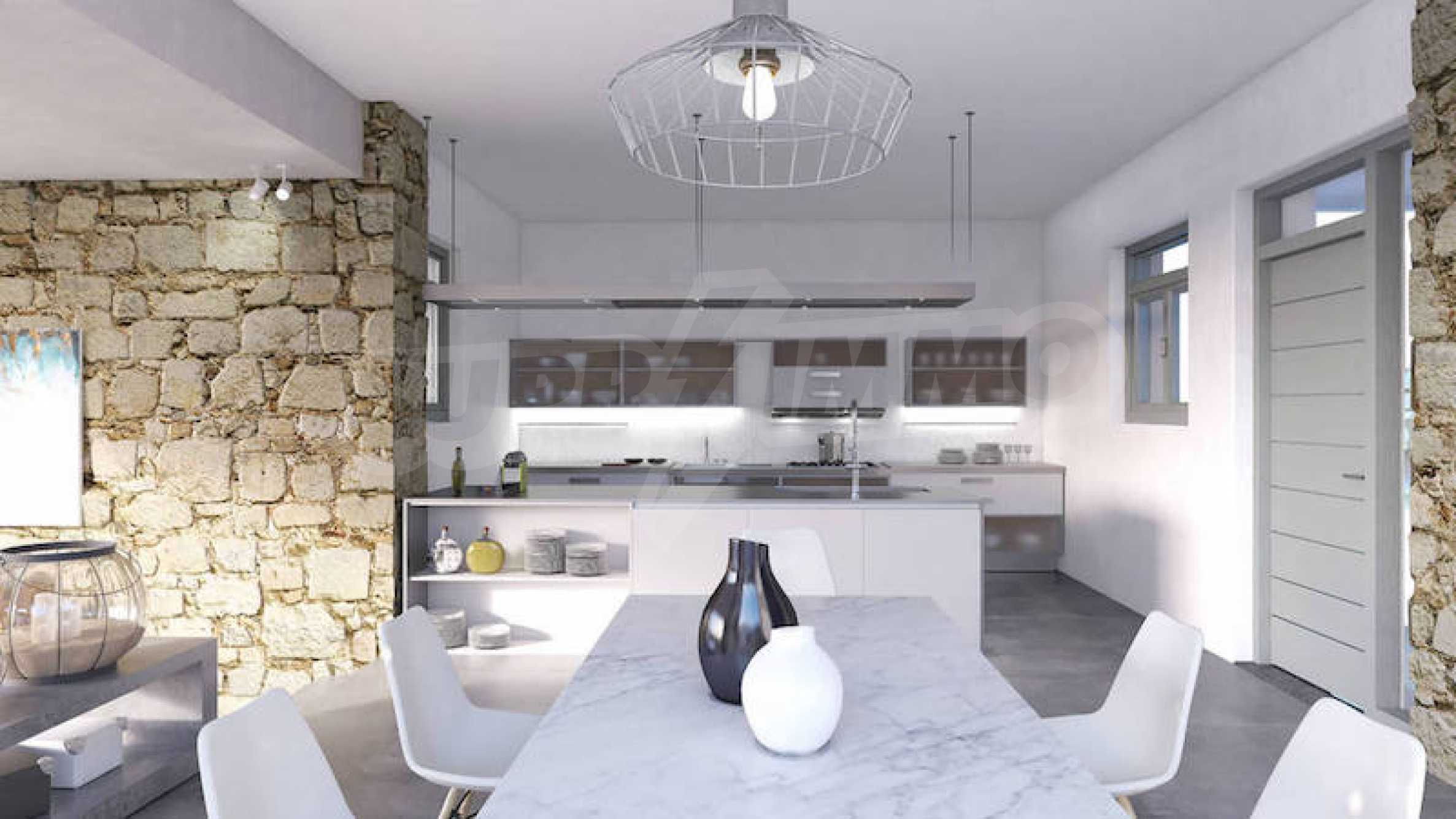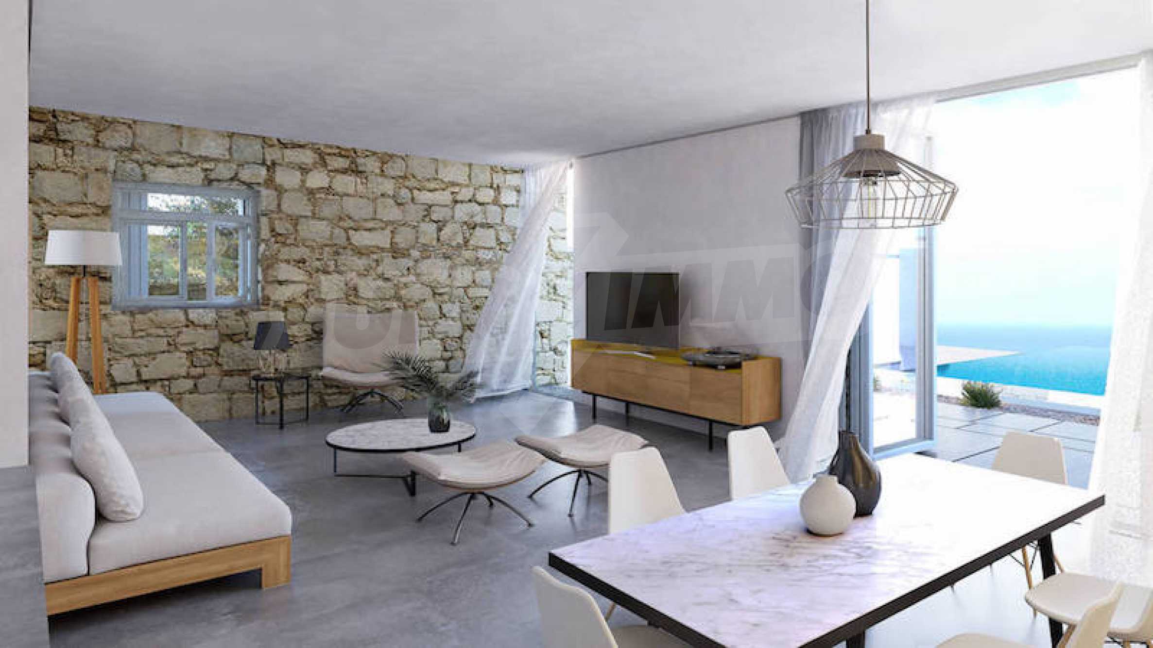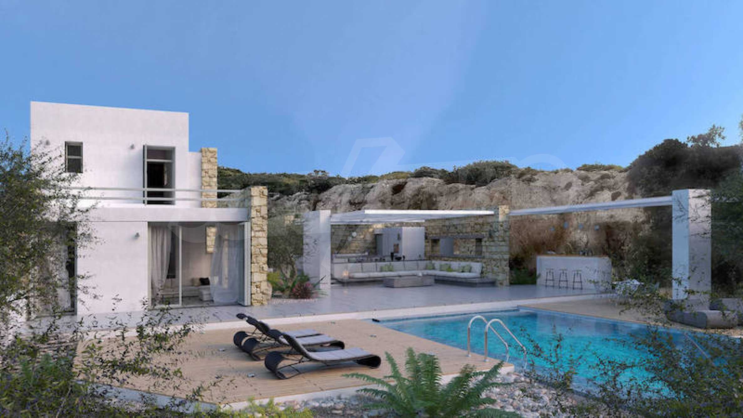 Проект состоит из двух вилл с гостевыми зонами и наружными удобствами с видом на море и острова Фонис, Овриокастро и Курониси, а также горизонт соседнего острова Наксос. Террасные дворы и широкие открытые пространства ведут к исключительно умело используемым крытым и обширным площадкам для отдыха на открытом воздухе. Расположение бассейна и вилл на участке составлено таким образом, чтобы можно было наслаждаться амфитеатром.