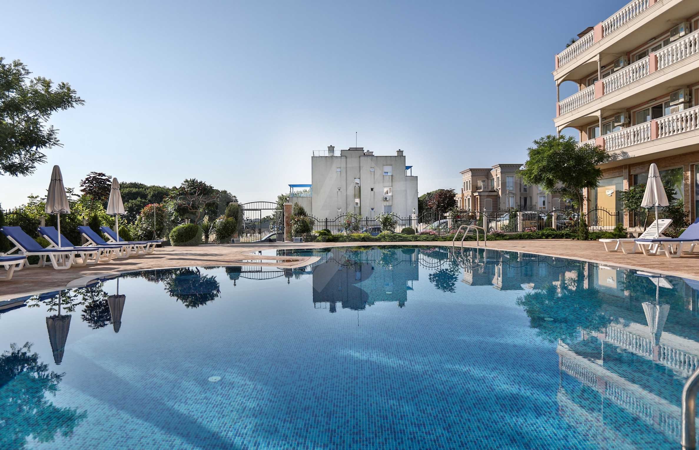 Здание с изысканной и элегантной архитектурой, с просторными террасами с балясинами, ориентировано к пляжу и предлагает красивый вид на море. Здесь есть все необходимые удобства для приятного отдыха: удобная доступность, бассейн, подземная парковка и ресторан, охрана, видеонаблюдение и ресепшен, всего метры от песчаного пляжа.