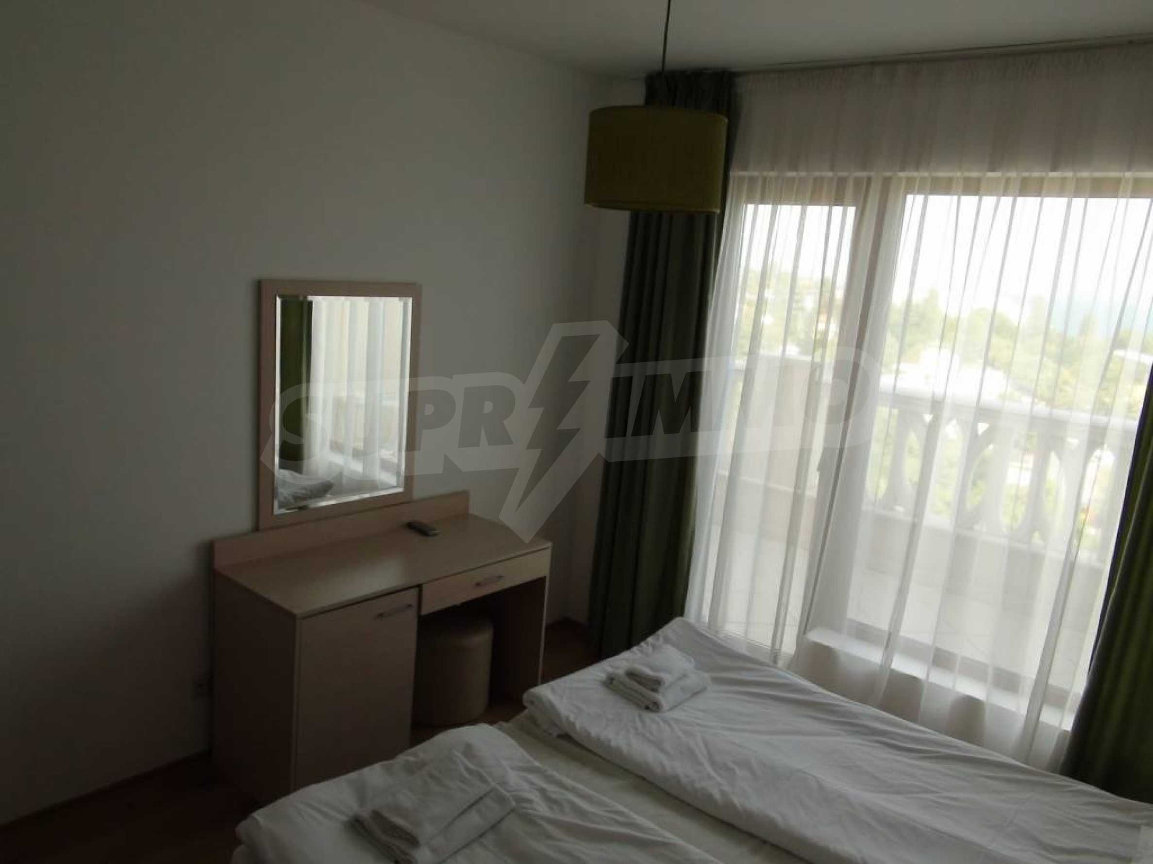 Квартира расположена на восьмом этаже с полностью ориентированными комнатами на море. Она состоит из гостиной с кухней, двух спален, ванной комнаты с туалетом, передней террасы с видом на море и задней террасы для барбекю. Полностью меблирована.