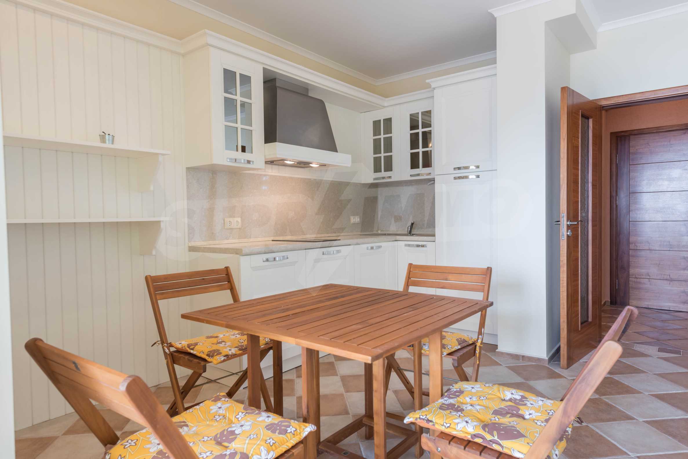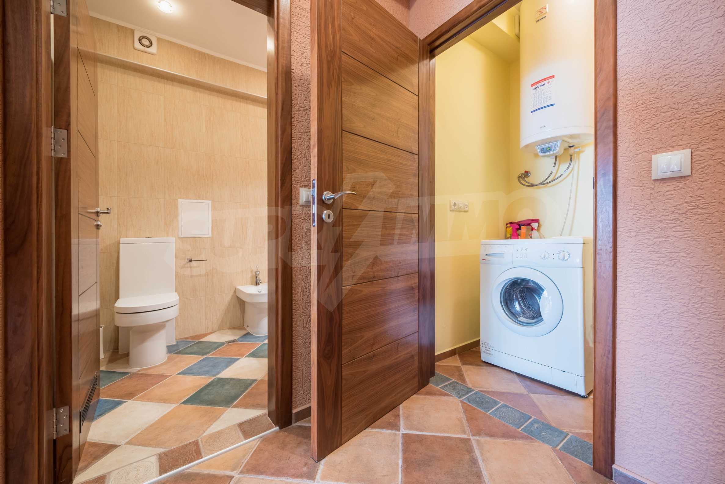 На чистой жилой площади 93,70 м2. расположены: прихожая, гостиная с кухней, спальня, гардеробная, ванная комната с туалетом, отдельный туалет, прачечная и терраса с видом на двор и бассейн.