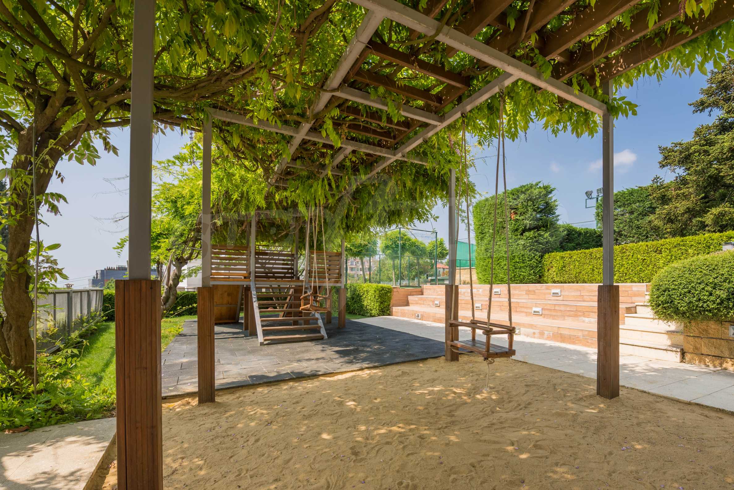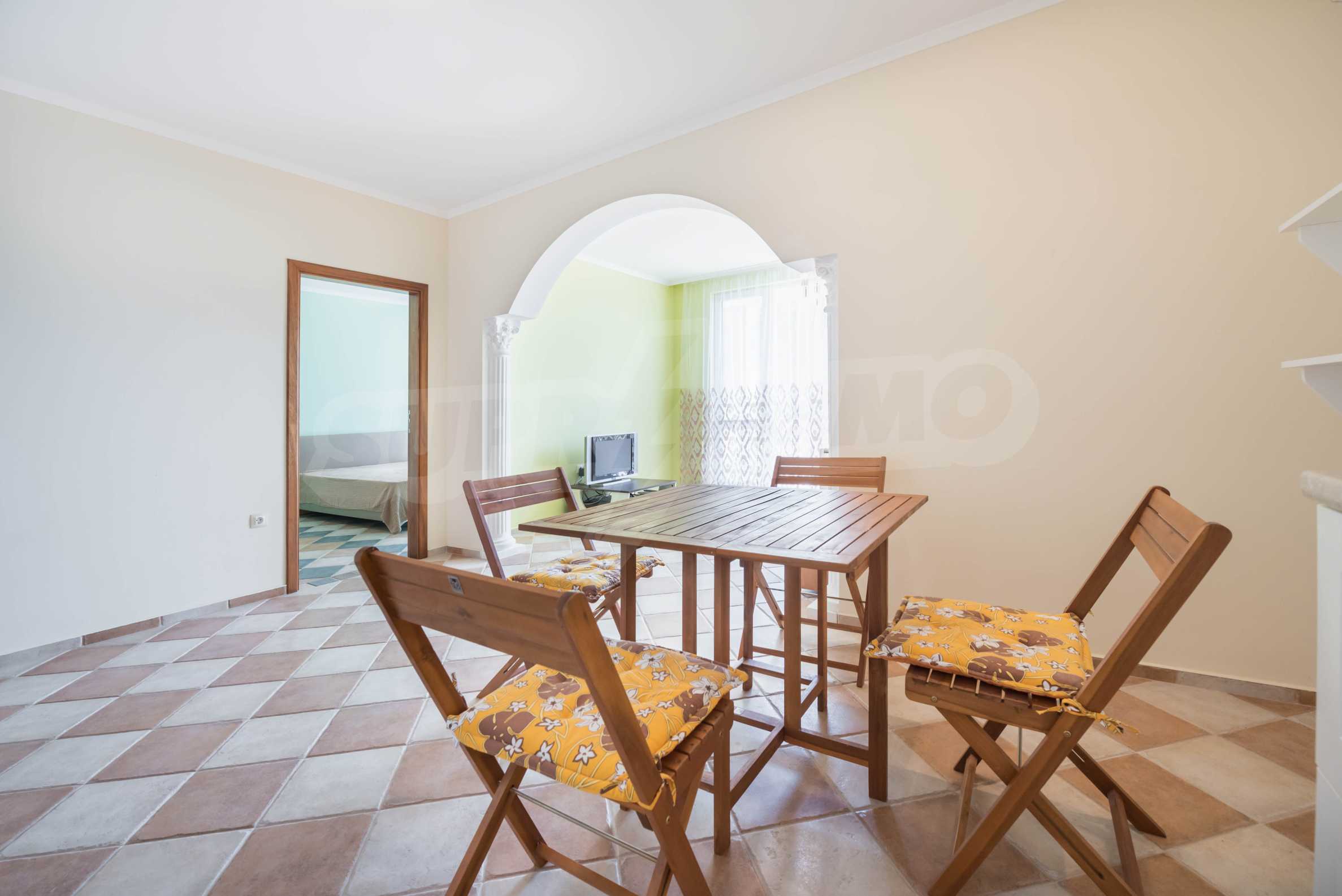 Квартира расположена на первом этаже и имеет прямой доступ к ухоженному саду комплекса. Квартира очень тихая, предлагая комфорт и спокойствие для своих жителей.