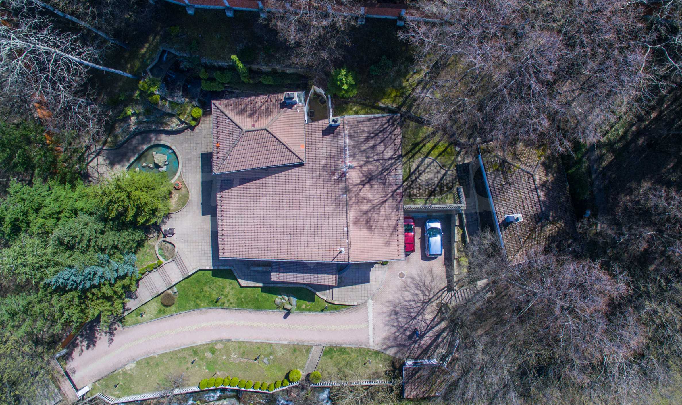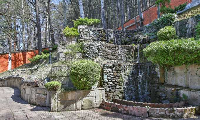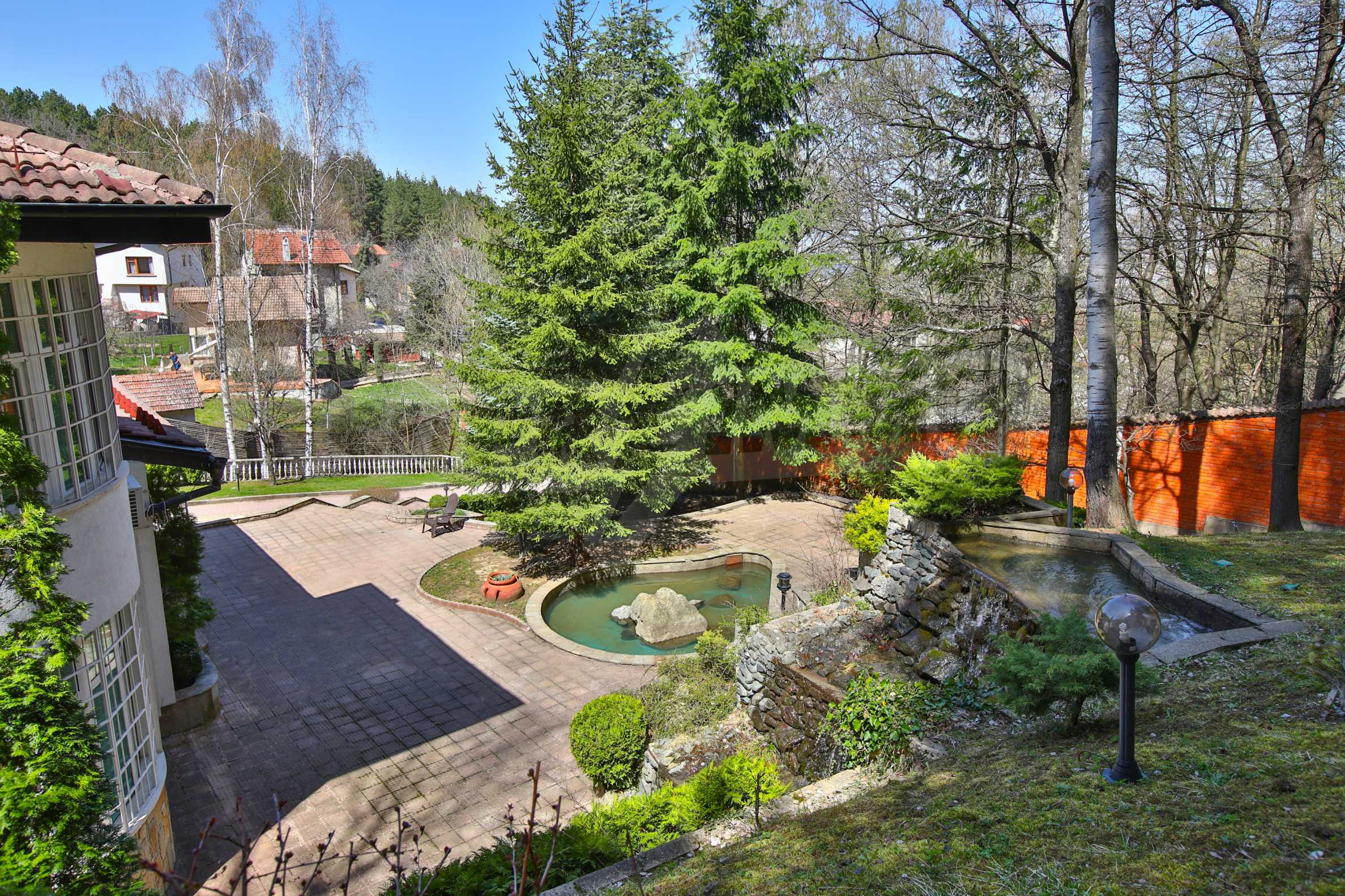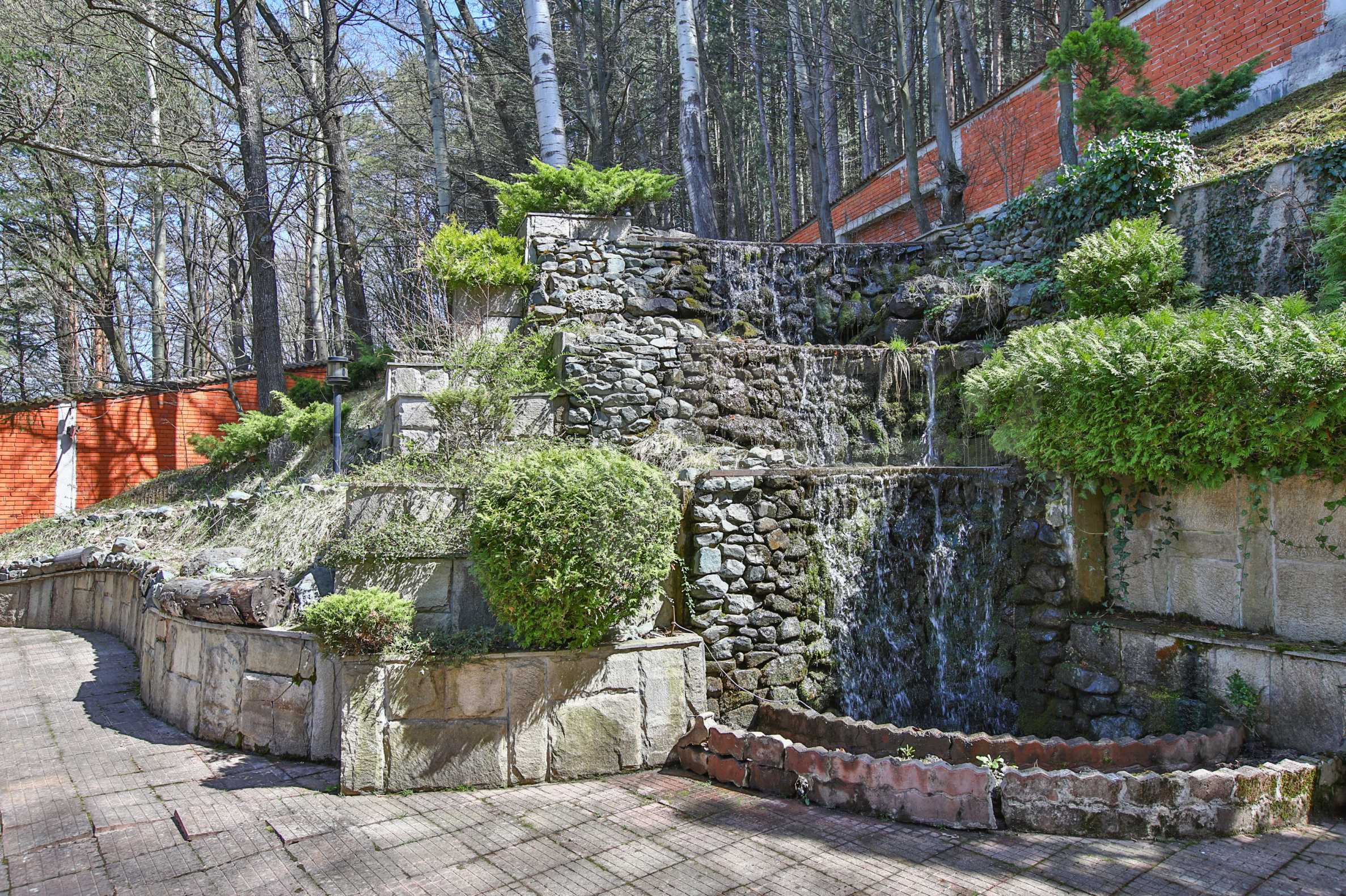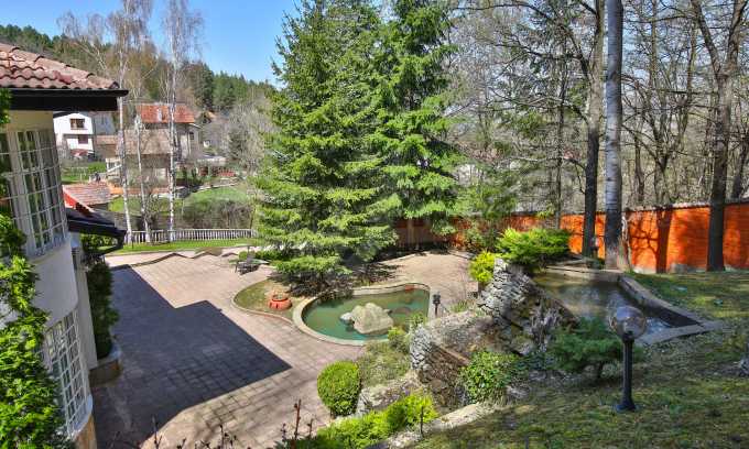 В доме есть большой и уникальный двор, через который проходит река, есть искусственный водопад, небольшой бассейн и богатый хвойный лес, а само имущество имеет следующее распределение: