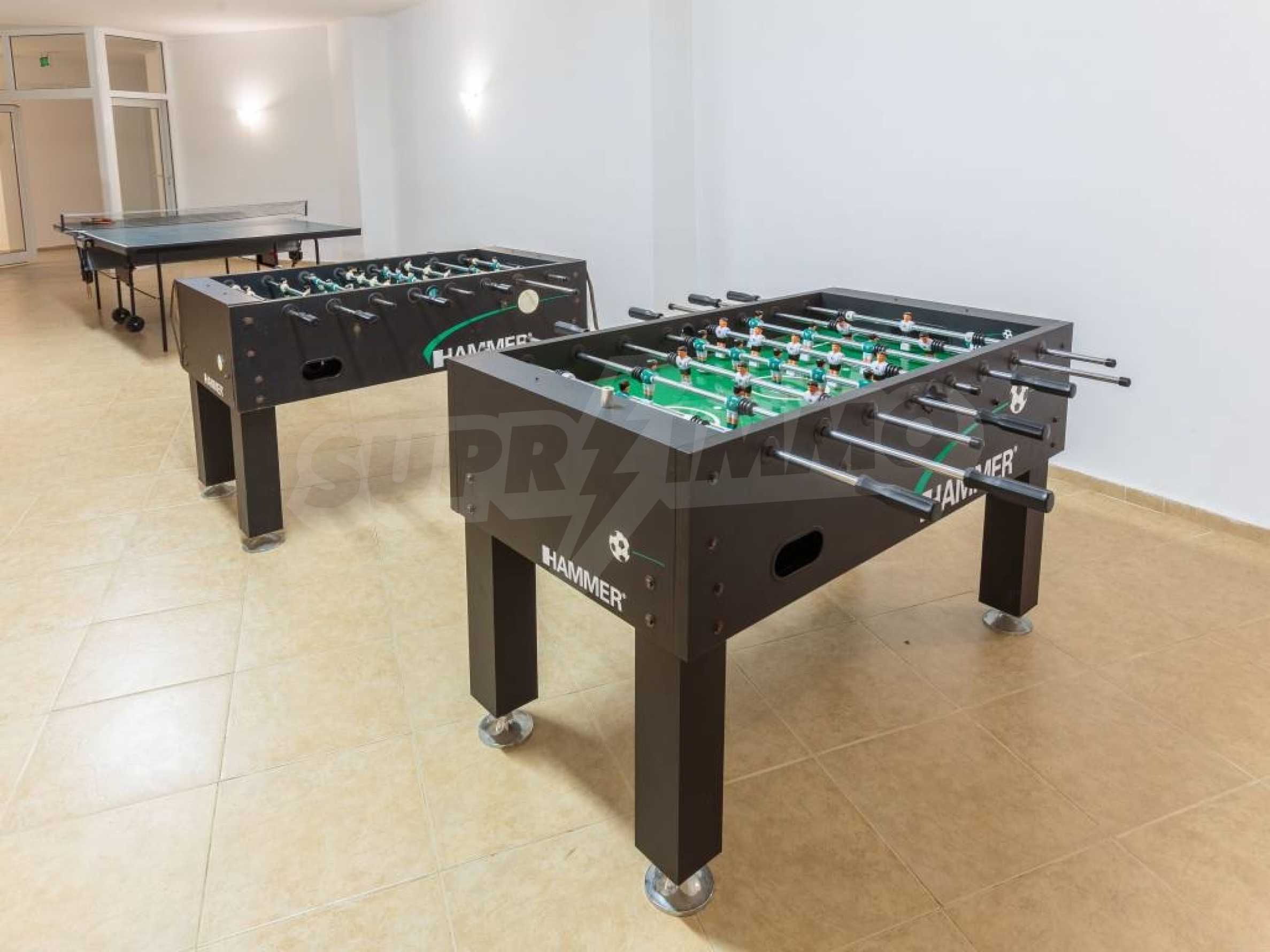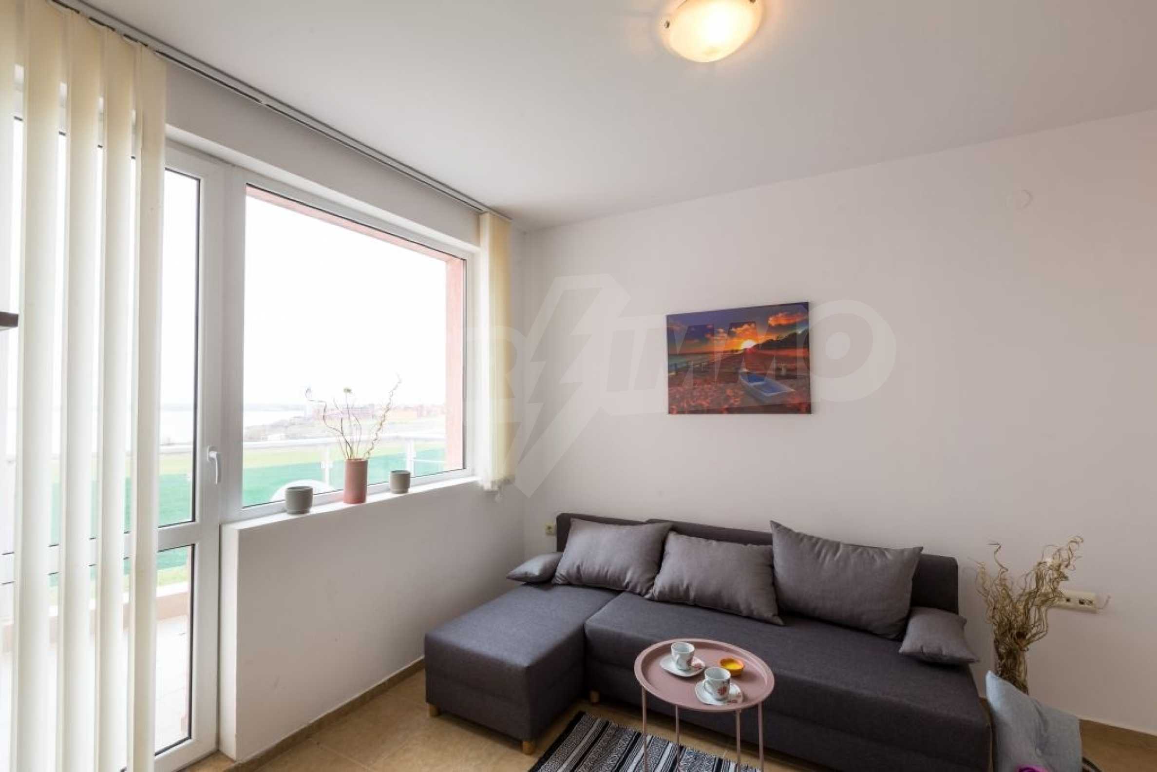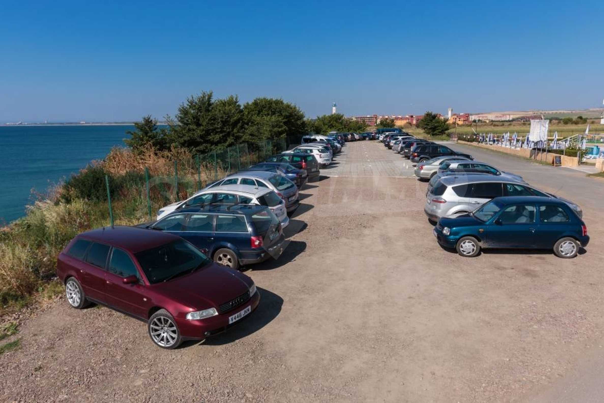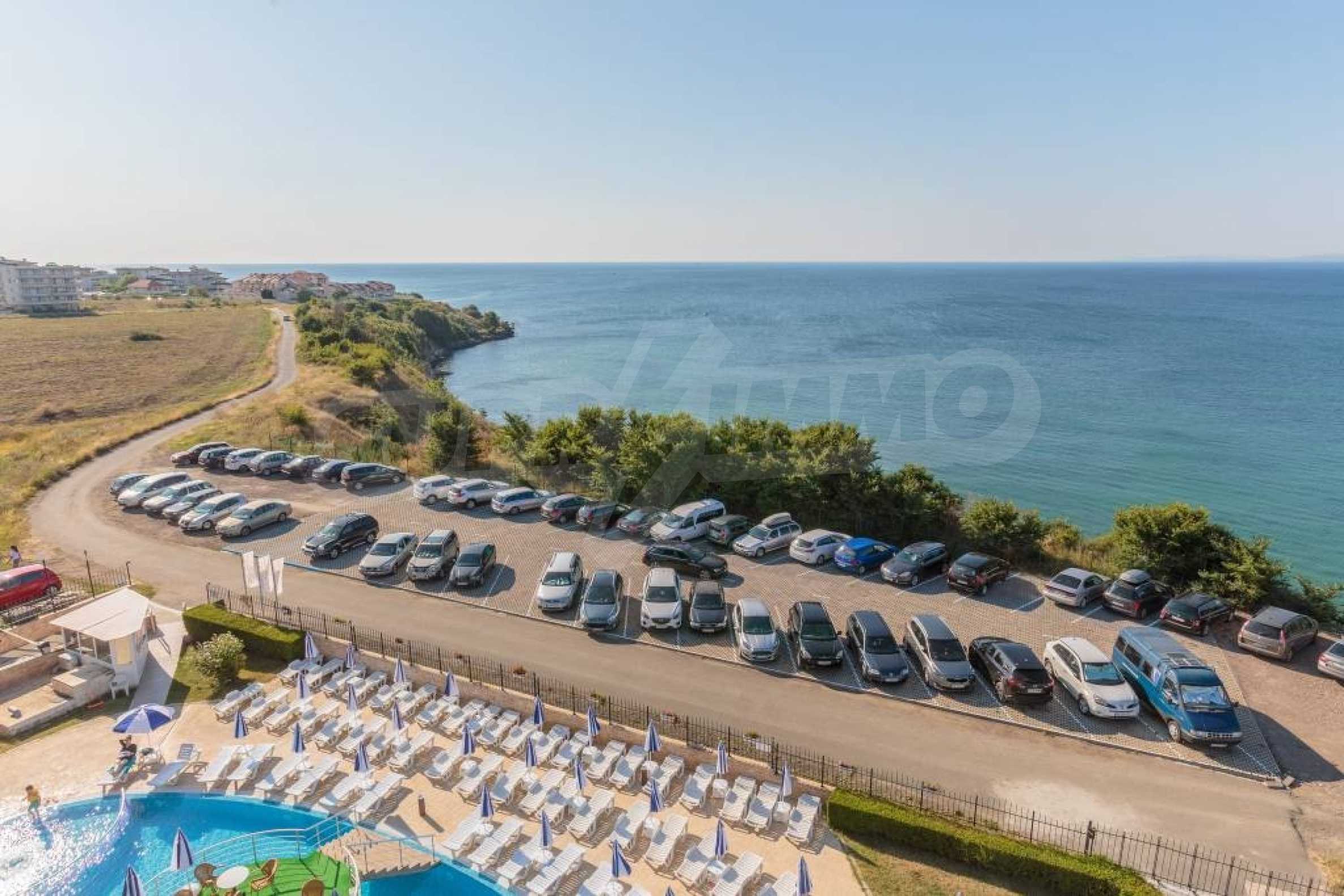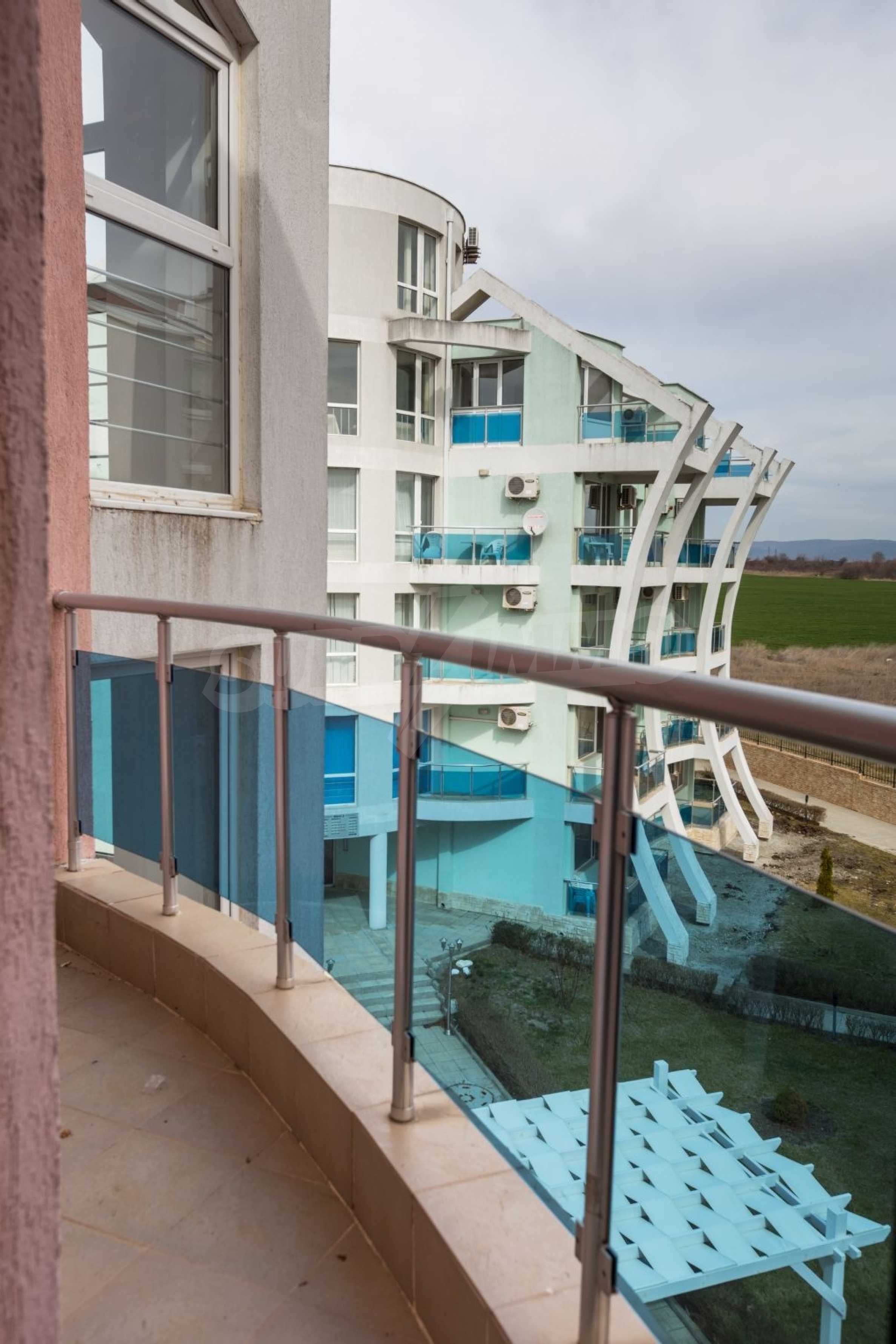 CОСТА CALMA, въпреки, че попада в землището на гр. Ахелой се намира на съвсем близко разстояние до центъра на гр. Равда, където летуващите имат възможност да се потопят в местната атмосфера. Ресторанти и кафенета, малки магазинчета за дрехи и сувенири очакват летовниците. По- дълга разходка би отвела желаещите до LIDL Равда. Съществуват удобни връзки с гр. Несебър, Сл. бряг и Бургас., Организирани са видеонаблюдение и целогодишна охрана. Басейн и паркинг са също на разположение на гостите. През летните месеци/ от м. май до м. октомври/ работи рецепция, фитнес зала, wifi. На разположение на гостите и собствениците са игрална/ билярдна зала/ детски кът, библиотека., Архитектурното решение на комплекса привлича с разчупените си, но и изчистени линии. Трите блока са разположени така, че от апартаментите се разкрива красива морска панорама., Имотите ( едноспални и студия) се предлагат напълно обзаведени. Кухните са оборудвани с котлони, фурни, големи хладилници, аспиратори, шкафове и мивки. Продават се с маси за хранене и столове, телевизори. Спалните са оборудвани с легла и гардероби; в студията, в зависимост от квадратурата са разположени разтегатлени дивани или двойни легла. Всички санитарни възли са оборудвани с душ- кабини и бойлери, както и с всички необходими аксесоари.