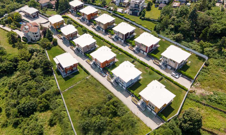 Комплекс построен из высококачественного массива финской ели, сочетающего в себе экологичность, энергоэффективность и природную красоту. Запланировано три типа домов: тип А (3 дома), тип В (9 домов) и тип С (1 дом), каждый с собственным участком и возможностью строительства собственного бассейна.