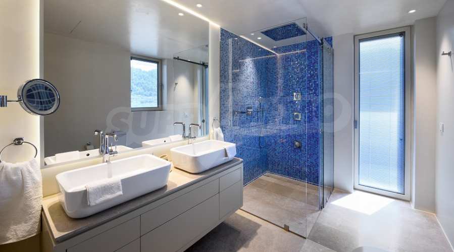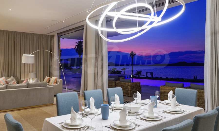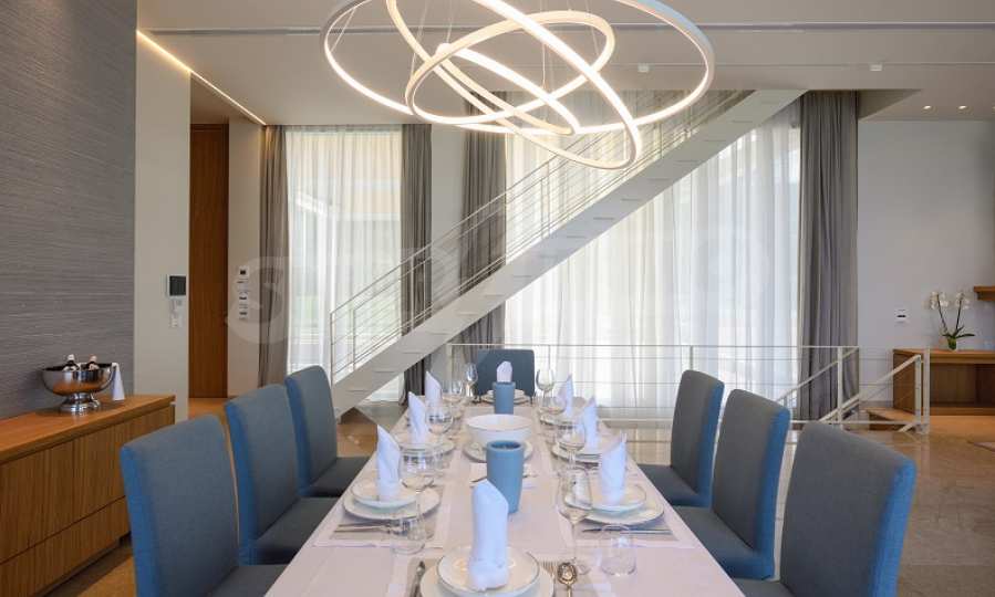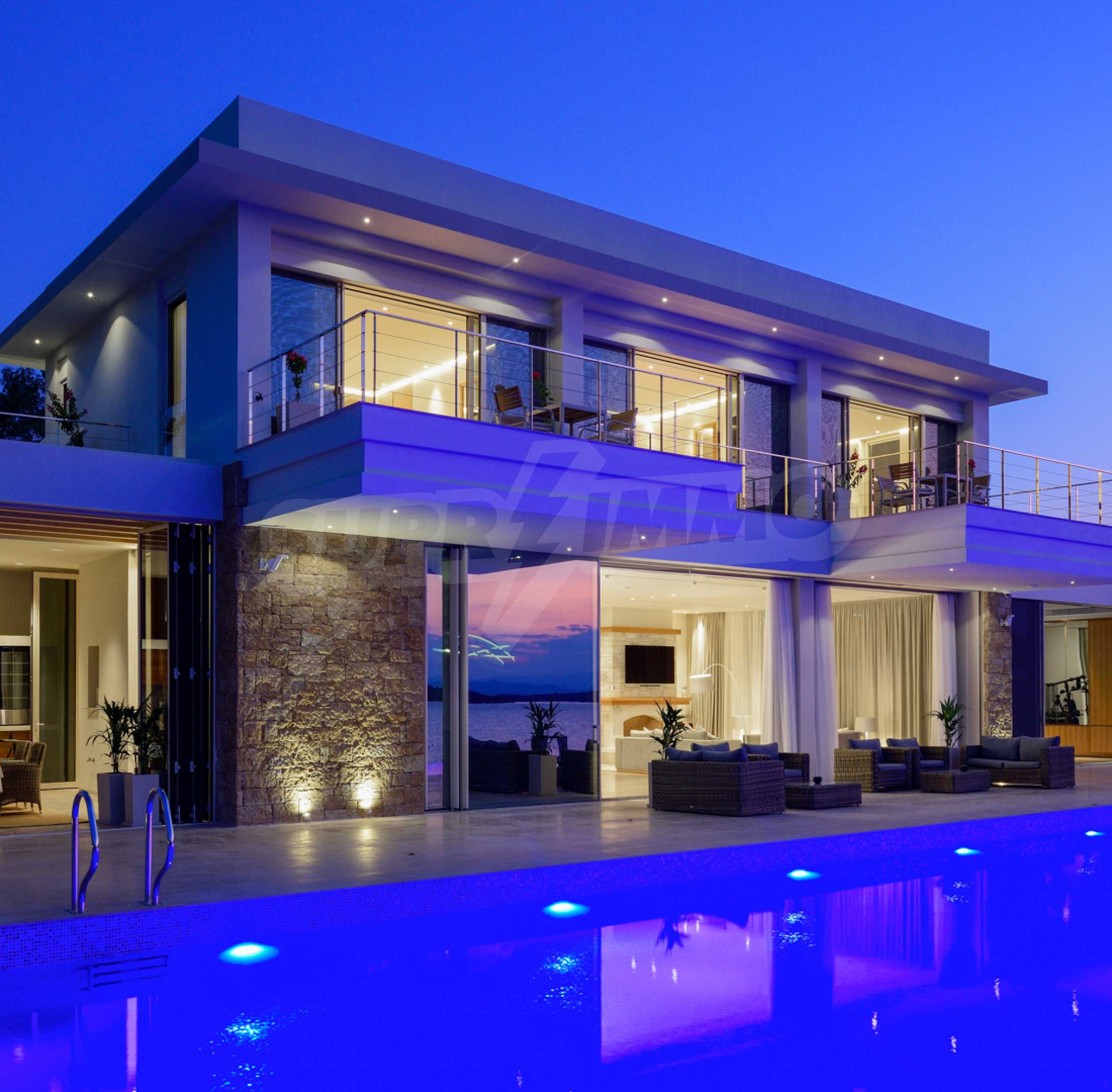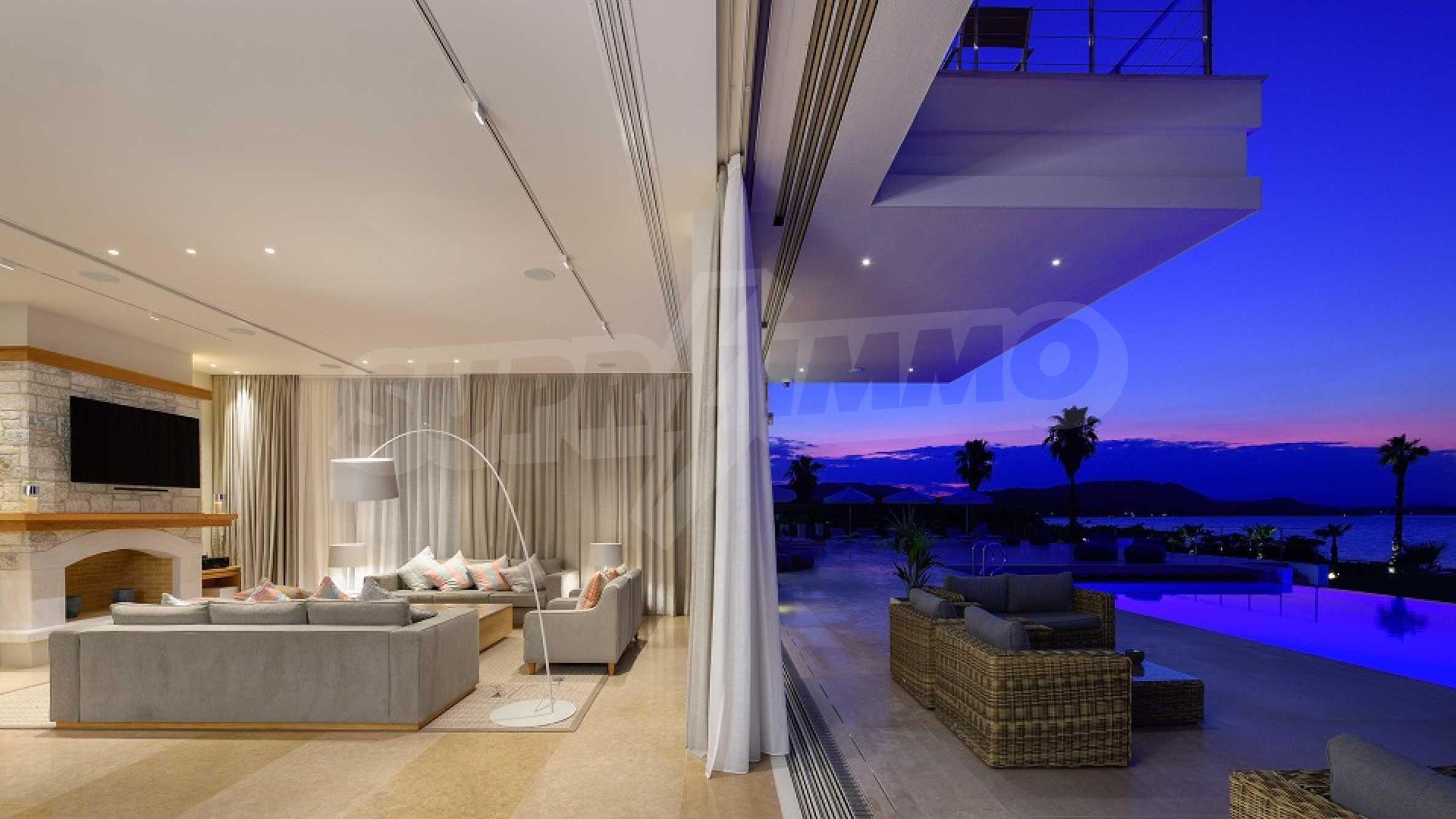 Вилла «Наталия» включает в себя полный спектр современных удобств, предлагаемых с помощью iPad, который управляет инновационным программным обеспечением для автоматизации системы «умный дом» KNX, сочетающим в себе роскошь и самые современные технологии. Одним касанием вы управляете температурой, влажностью, музыкой, освещением, телевизором, затемнением, жалюзи и многим другим. Все восемь спален имеют собственные ванные комнаты, жилые зоны спроектированы таким образом, чтобы вместить всю компанию, но есть несколько четко очерченных маленьких уголков, которые при желании могут легко обеспечить конфиденциальность. Потрясающий вид с виллы Наталия на море, горы и остров Диапорос не имеет себе равных. Терраса виллы с захватывающим видом на море приглашает вас провести вдохновляющие дни и вечера под греческим небом.