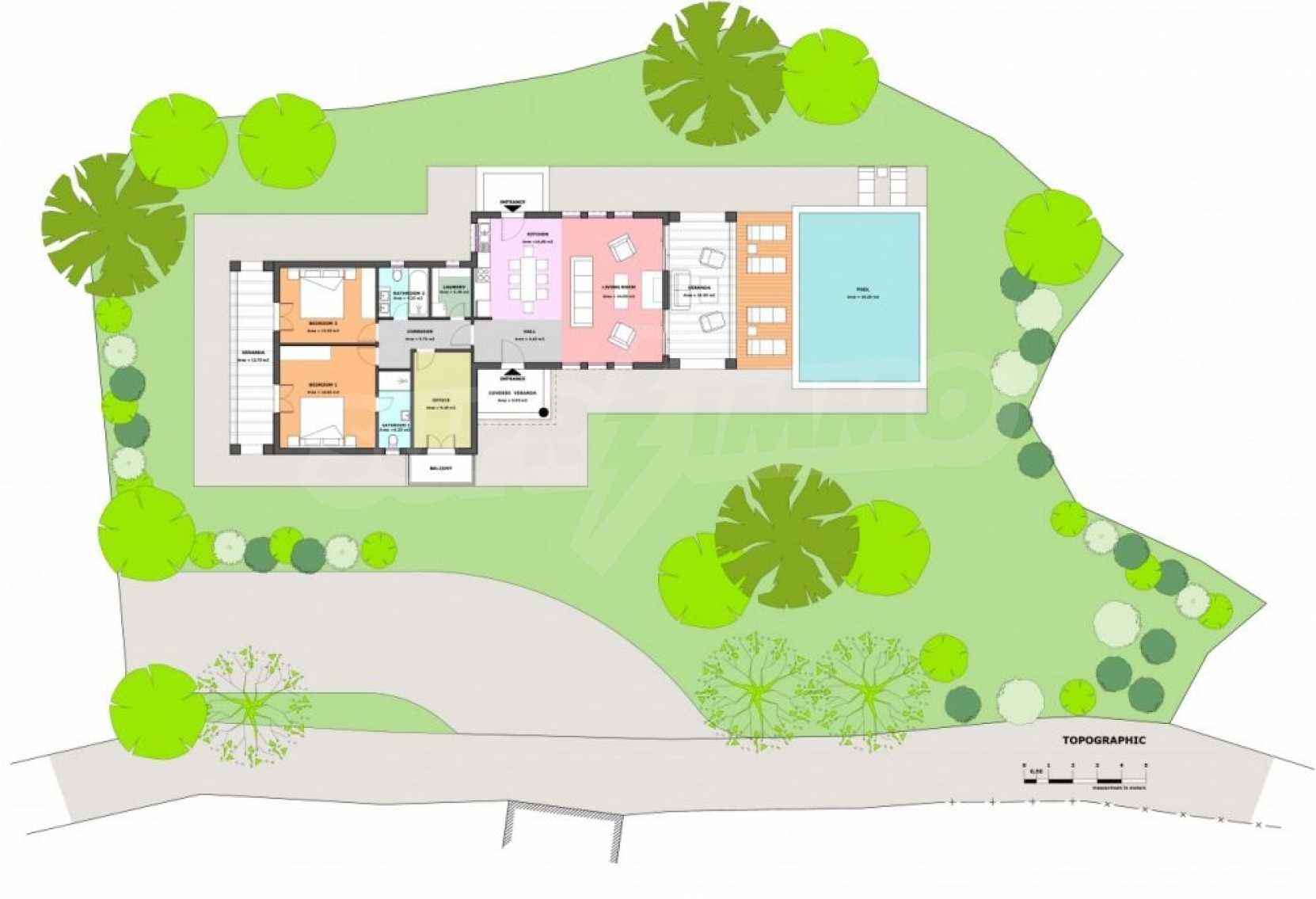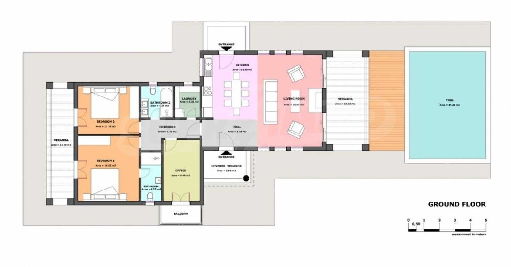 В доме будет кухня объединённая со столовой, гостиная с верандой с видом на бассейн площадью 35 кв.м, просторная ванная комната и прачечная. А также две просторные спальни, одна из которых будет с личной ванной. Кроме того, там будет еще одна небольшая комната, которую можно использовать как офис или еще одну спальню.