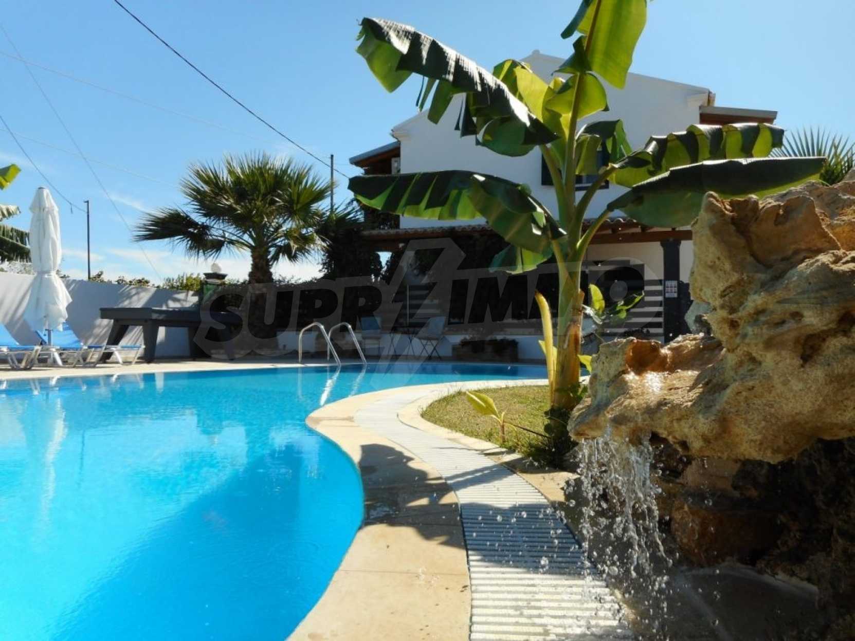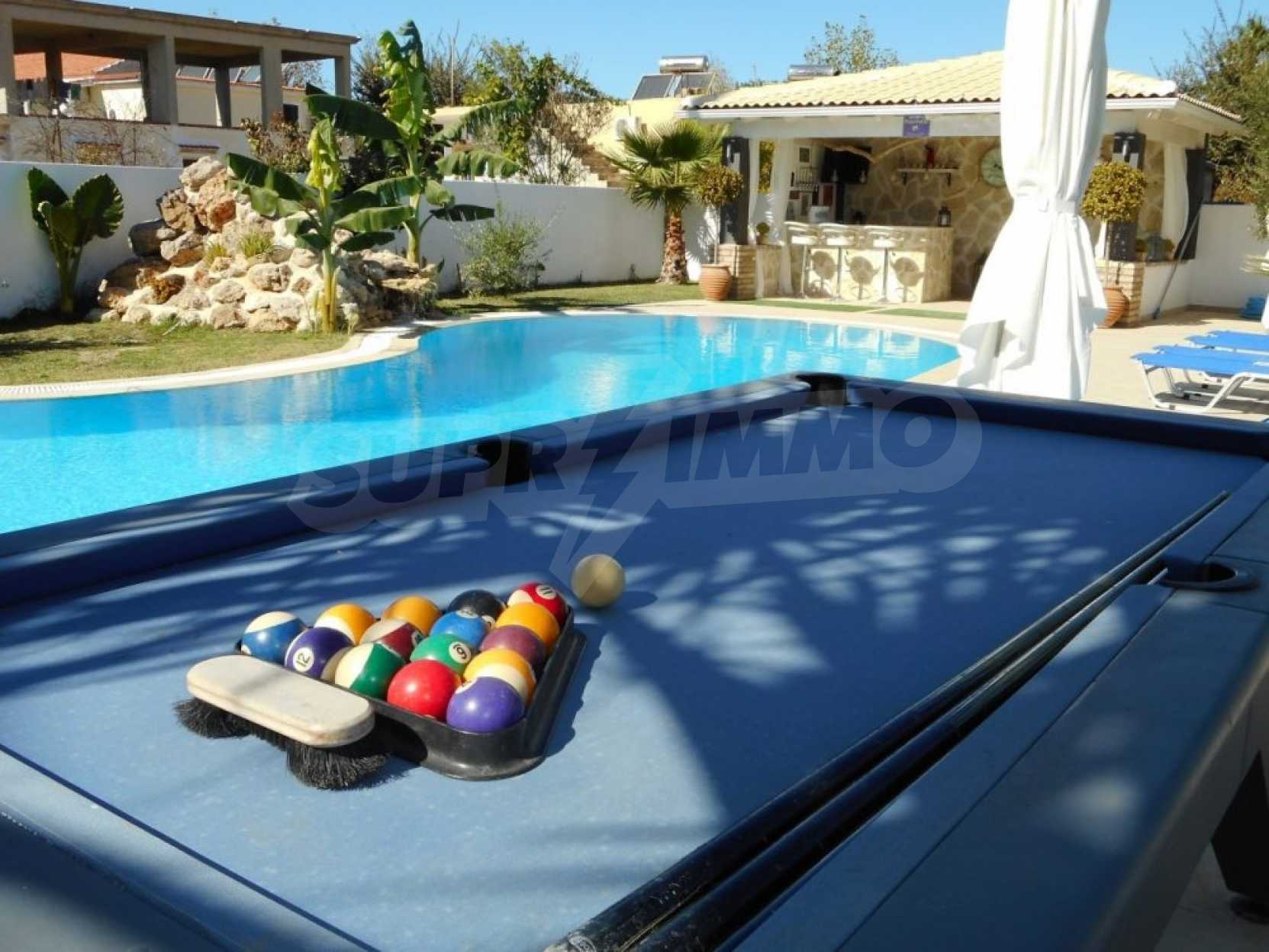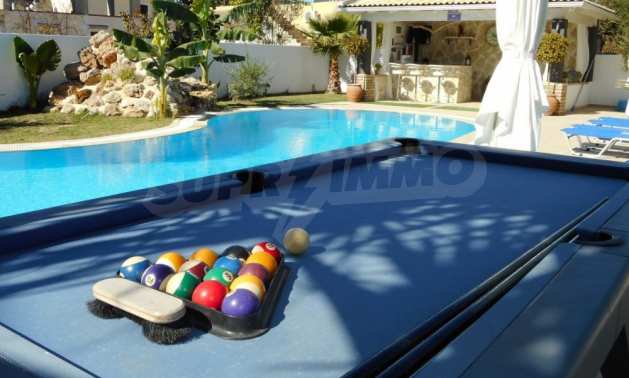 Отдельный голубой бассейн с тихим водопадом, два каменных душа, бильярдный уголок и стильный каменный бар.