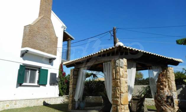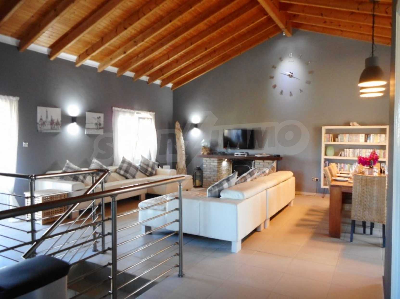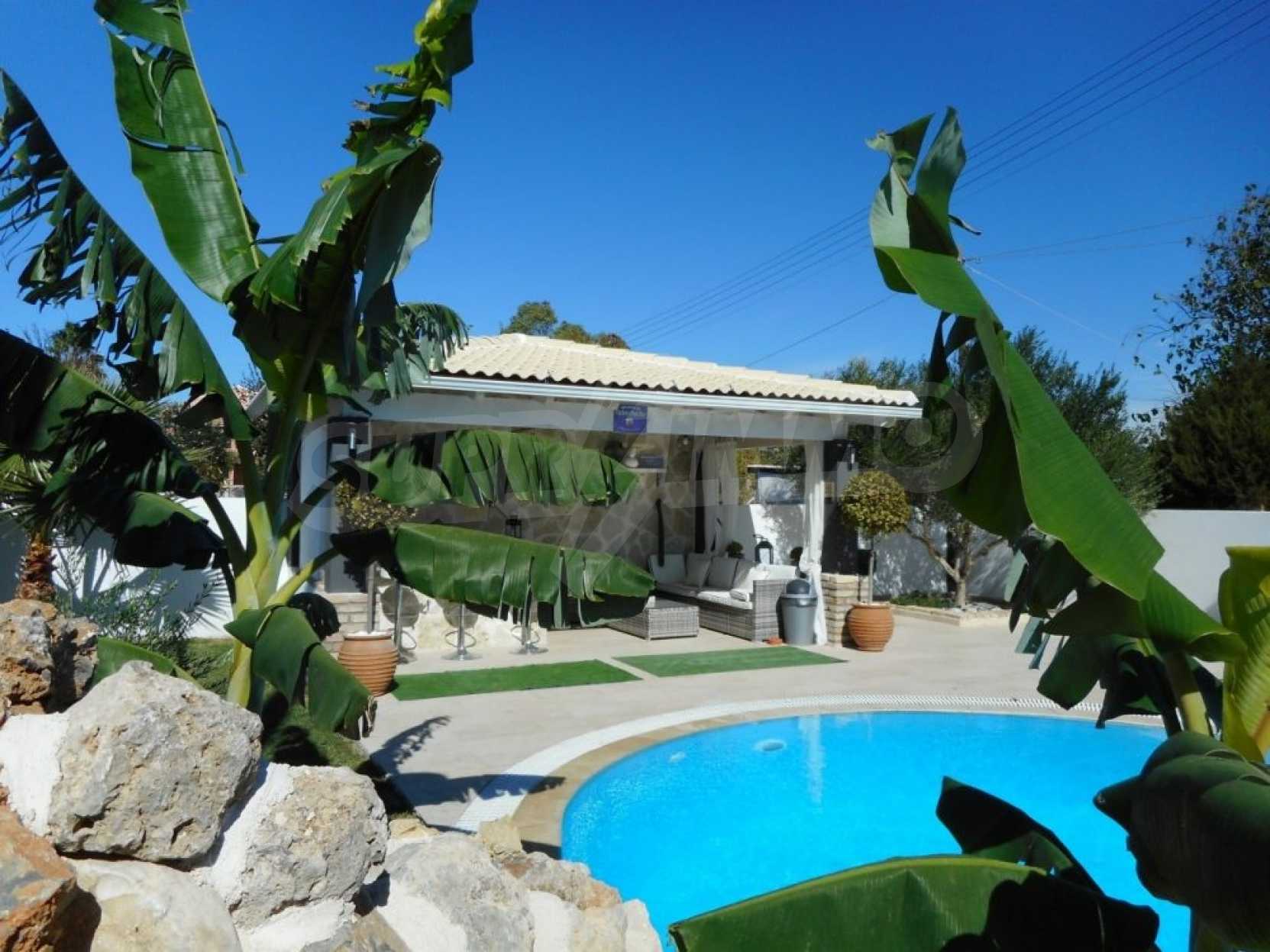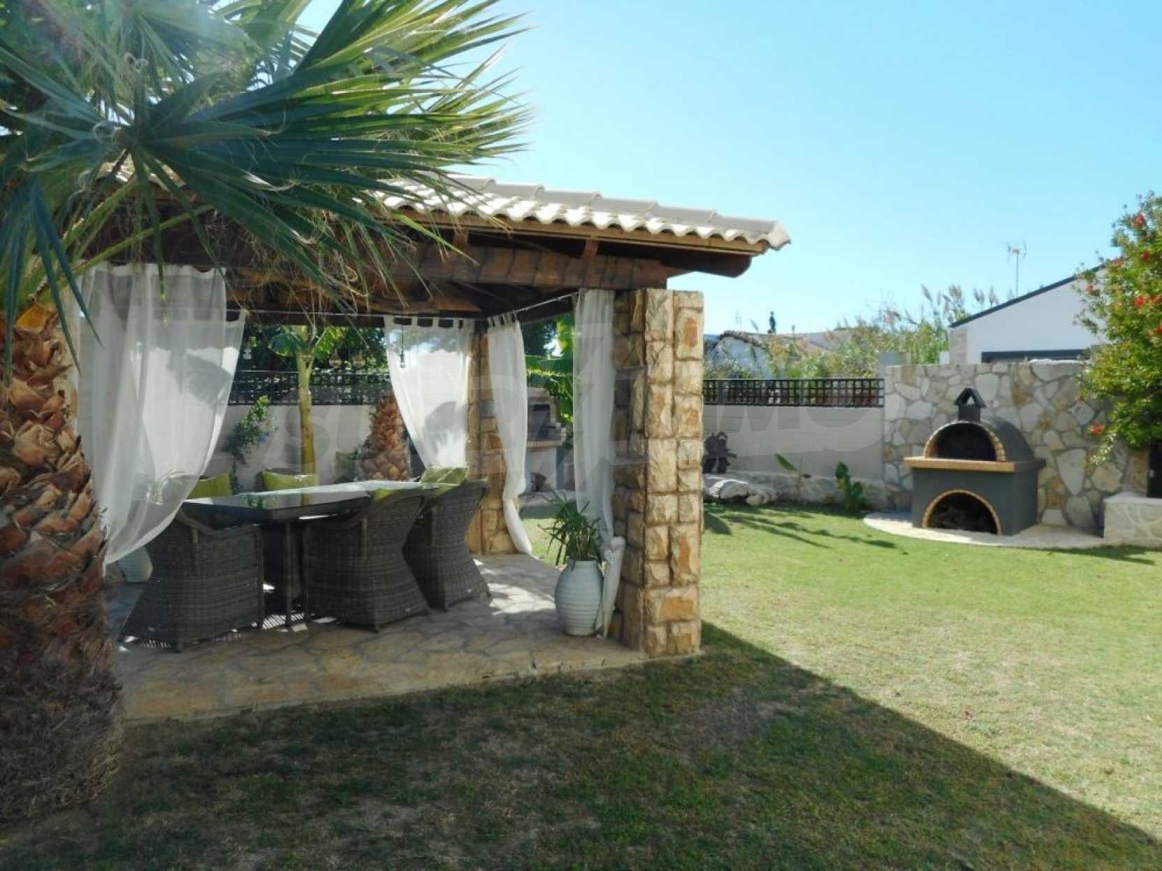 Большая и светлая гостиная с камином и столовой, функциональная кухня, пять спален и две ванных комнаты. Сад с мощеными дорожками, цветами, деревьями и растениями, крытая столовая зона для барбекю слева.