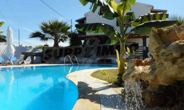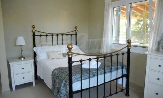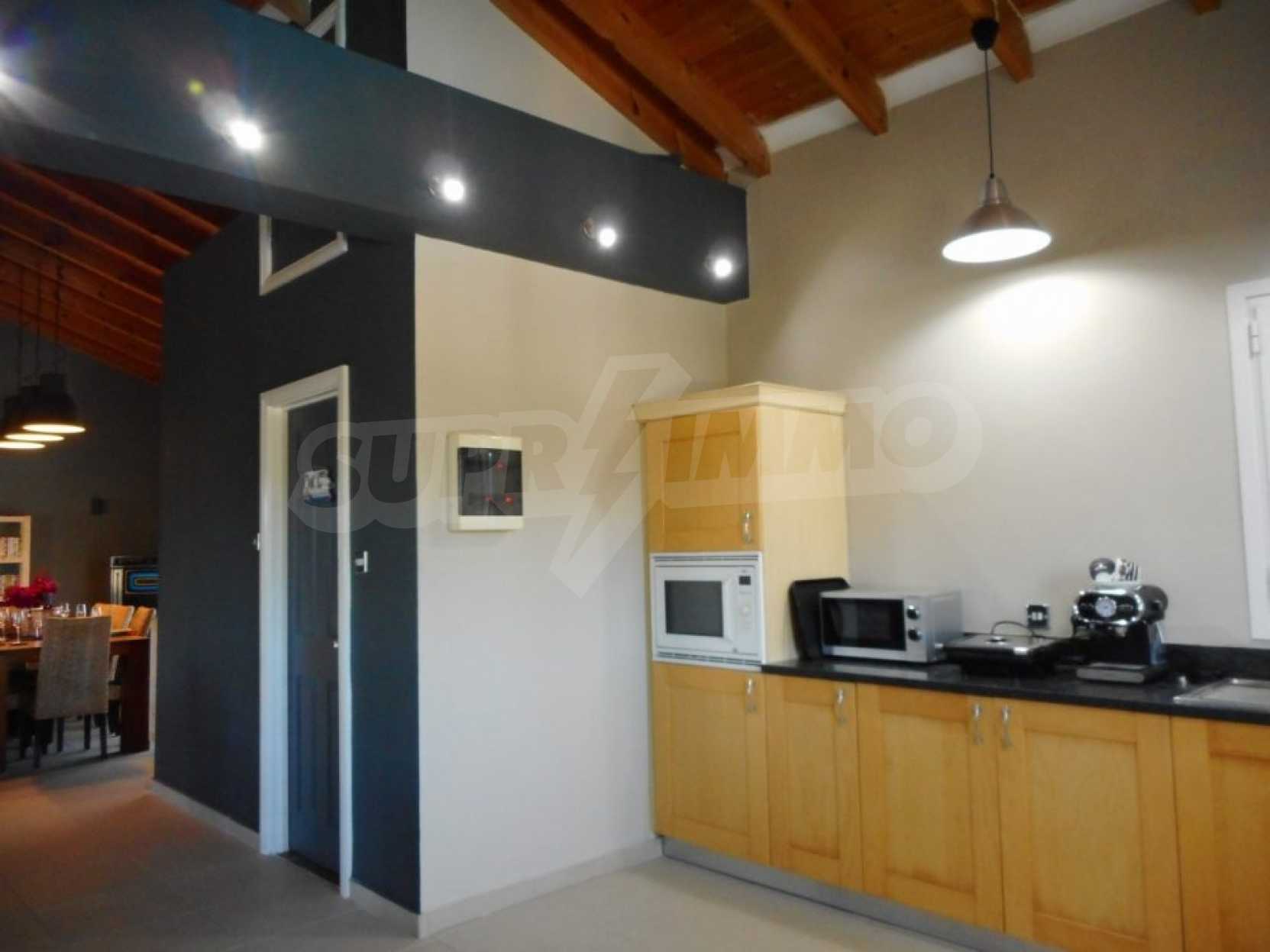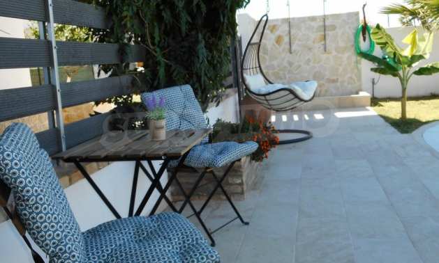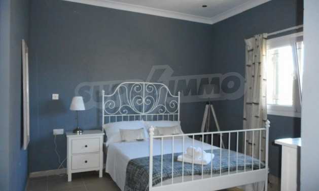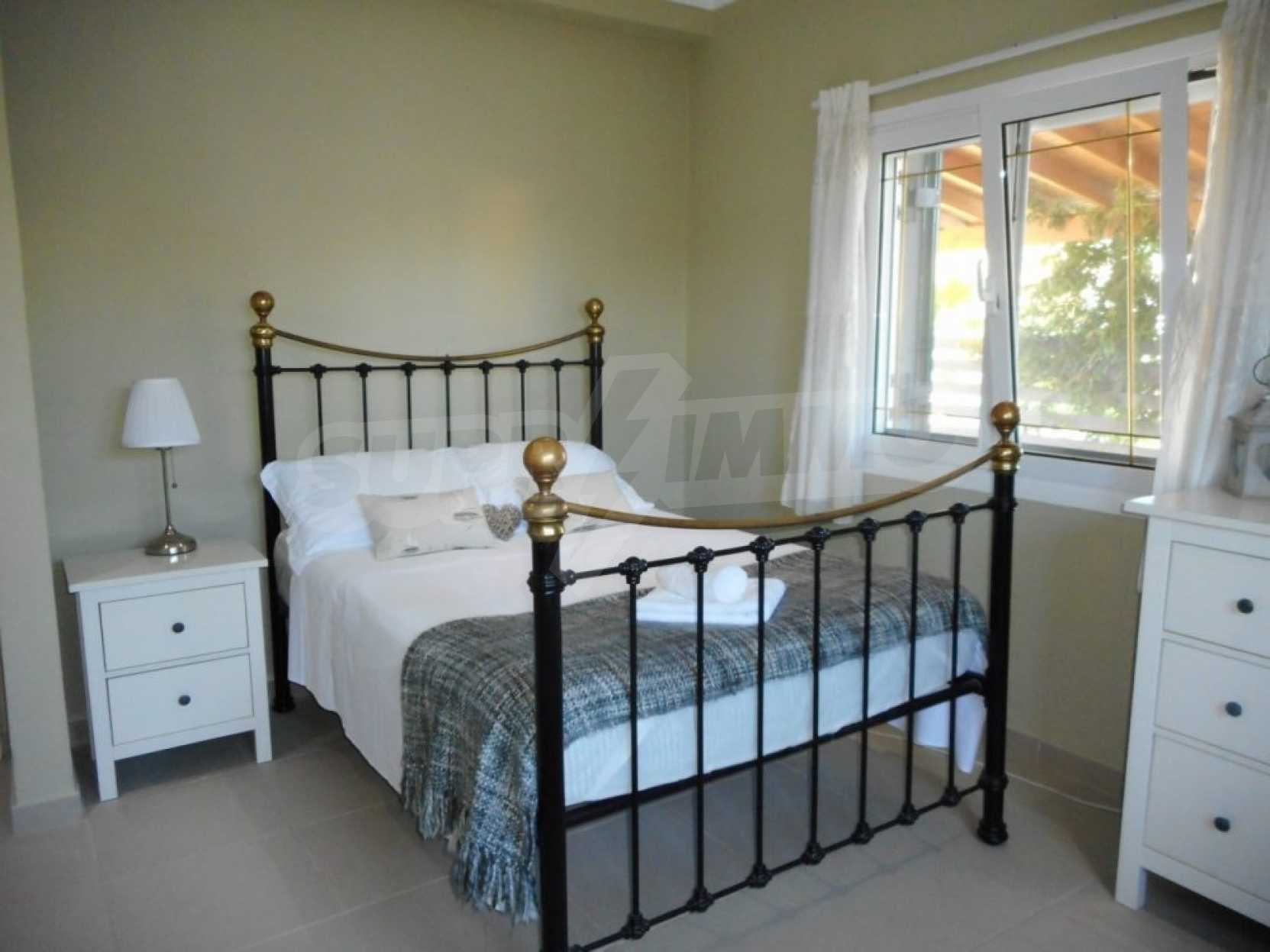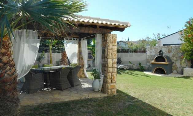 Большая и светлая гостиная с камином и столовой, функциональная кухня, пять спален и две ванных комнаты. Сад с мощеными дорожками, цветами, деревьями и растениями, крытая столовая зона для барбекю слева.