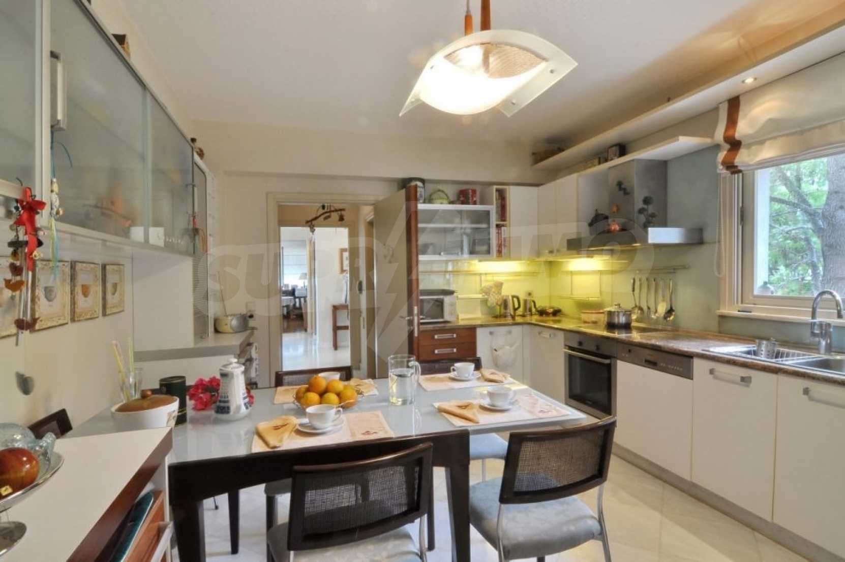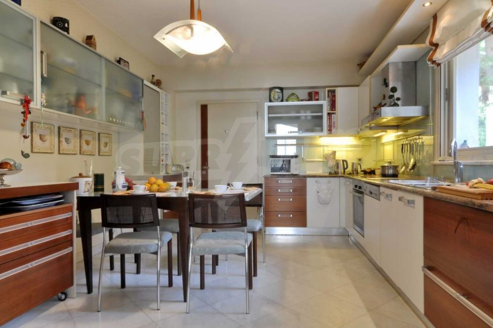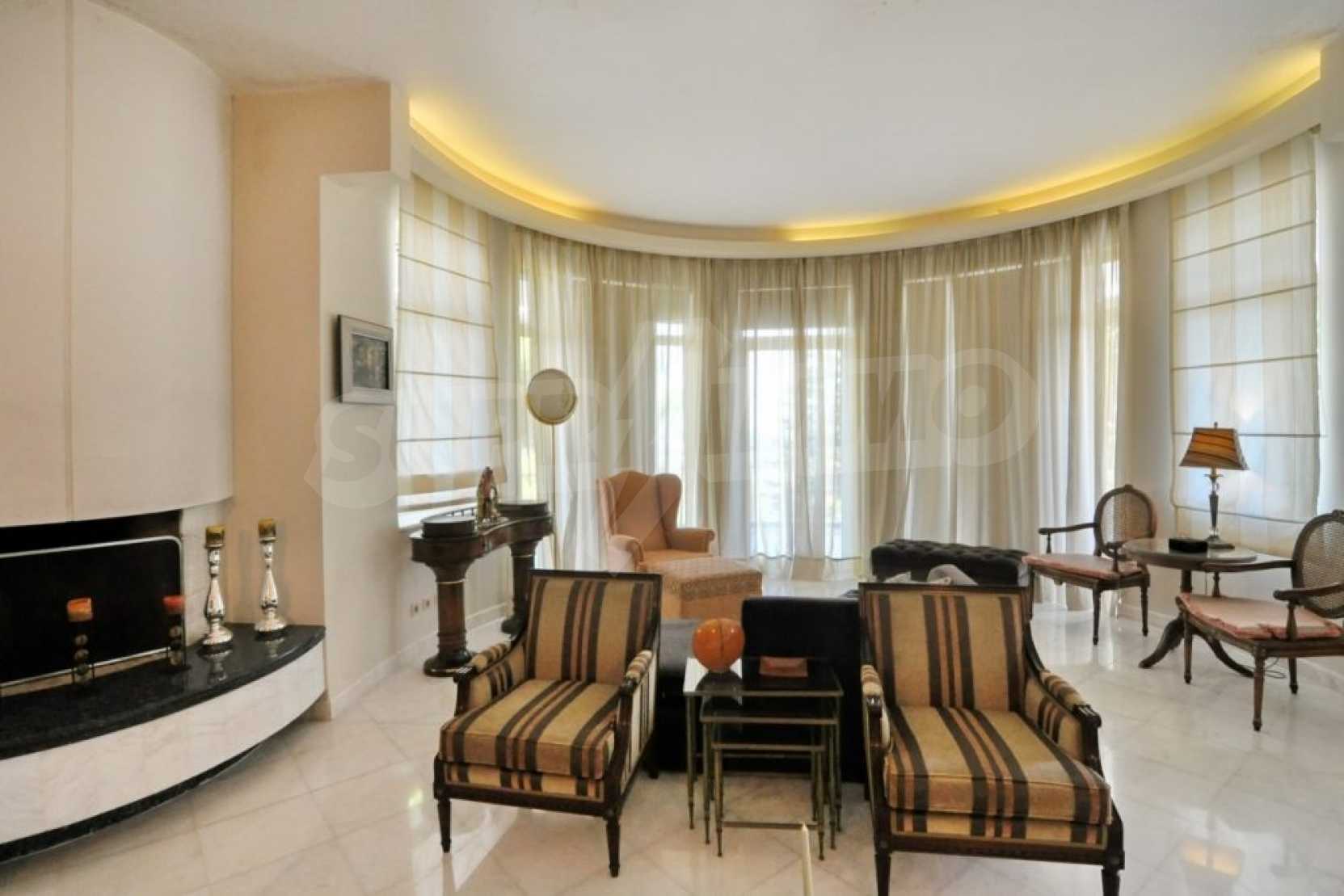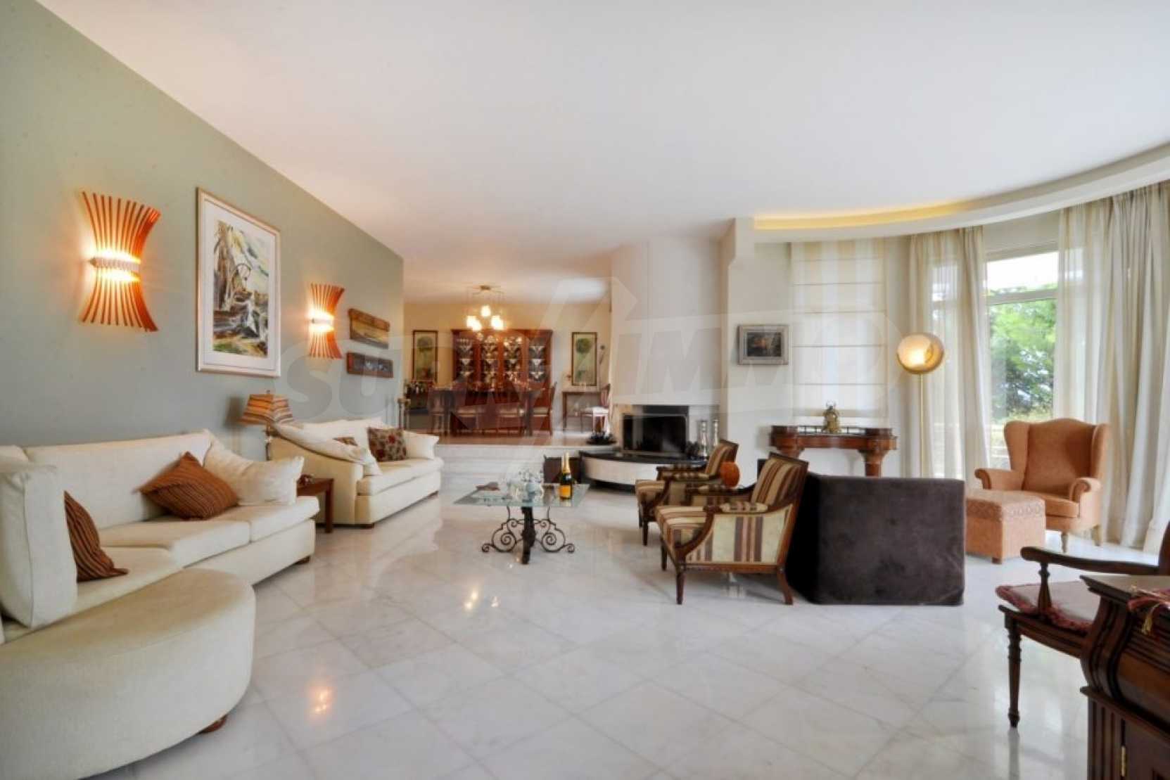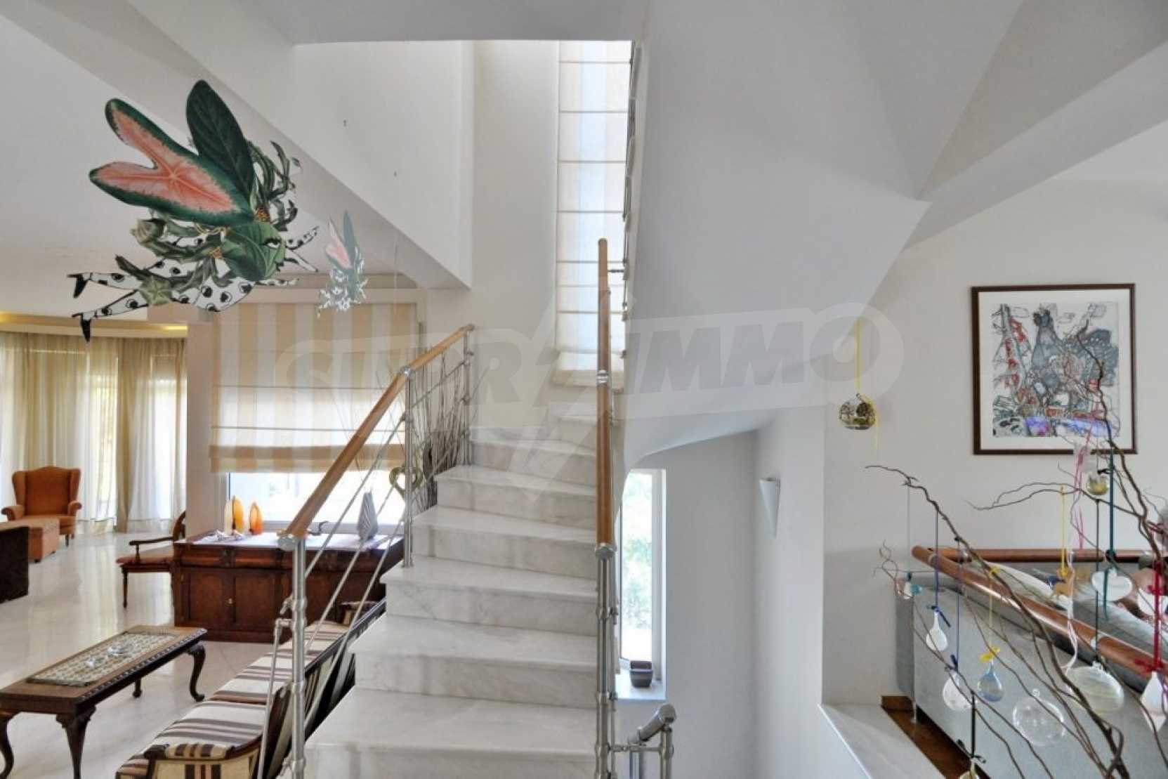 Есть частная дорога и автоматические ворота, которые ведут в сад и к главному входу дома. Дизайн дома современный, полы выложены из белого мрамора и высококачественного дуба. В доме установлена