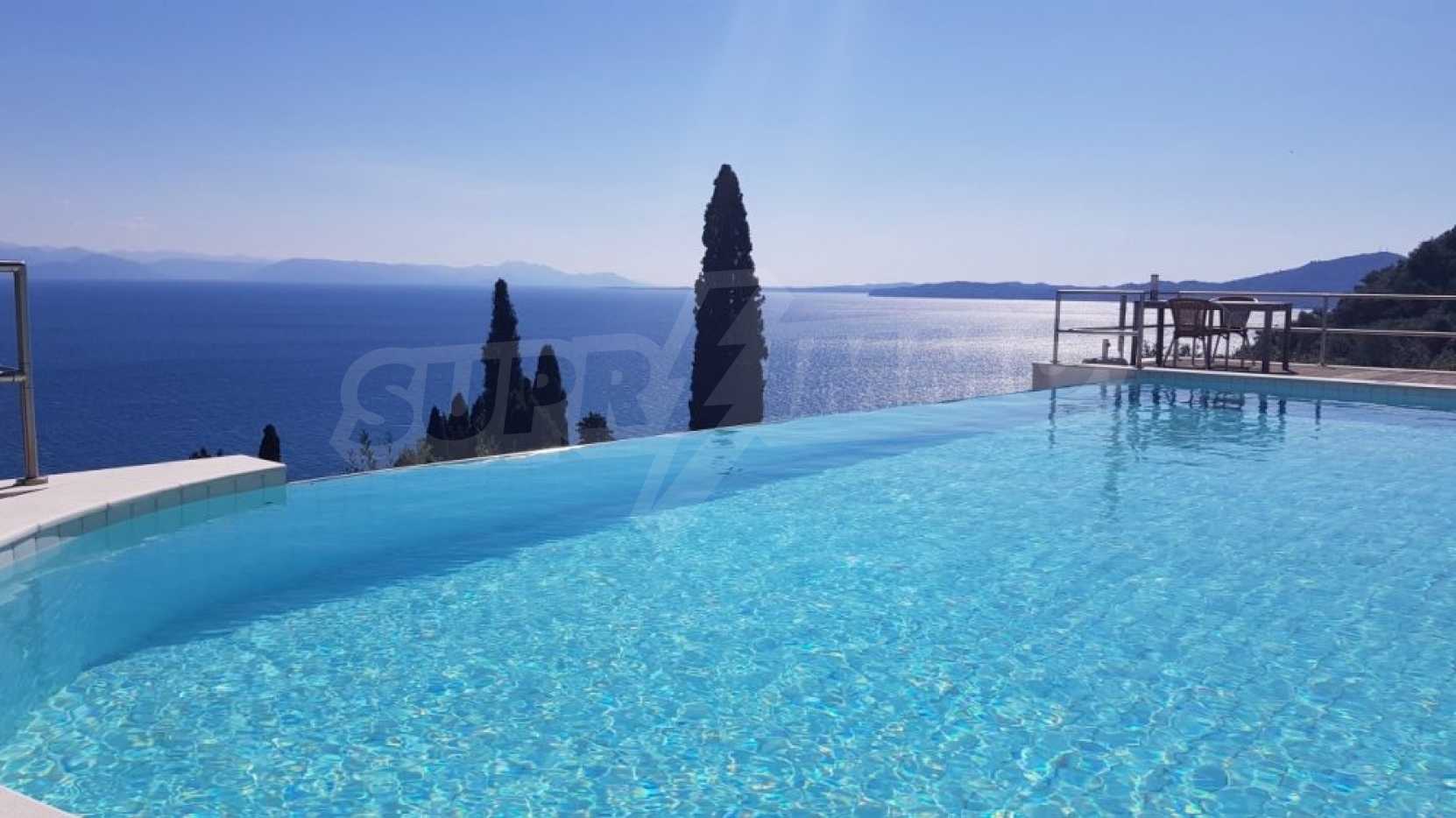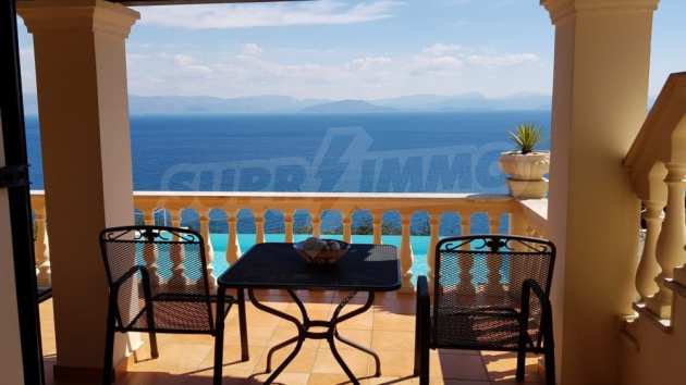 Вилла с панорамным видом на море расположена на большом территории 10,100 кв.м. Она идеально подходит тем, кто мечтает насладиться тишиной и спокойствием. Вилла площадью 201 кв.м. состоит из двух этажей. Зайдя во внутрь, мы окажемся в коридоре, который ведет к большой гостиной / кухне с тремя французскими дверями, ведущими на балконы. На первом этаже также расположены просторная кухня и ванная комната. Несколько ступенек ведут в главную спальню. Если вы когда-нибудь представляли, что просыпаетесь с видом на море, эта спальня исполнит вашу мечту. Французские панорамные двери ведут на балкон с прекрасным видом на Ионическое море, где вы можете насладиться утренним кофе. В этой спальне есть ванная комната и гардеробная.