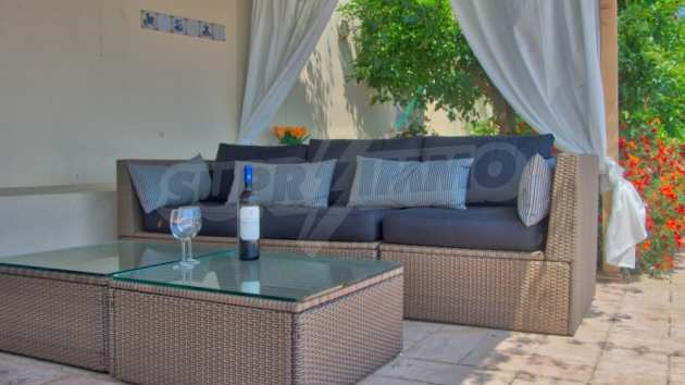 Вилла имеет приподнятую беседку и большую террасу с панорамным бассейном. Он окружен пышной зеленью, участок засажен множеством фруктовых деревьев, оливковых деревьев, растений и цветов.