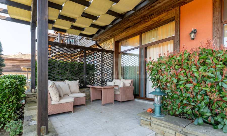 Квартира общей площадью 78,58 кв. метров. расположена на первом этаже и включает в себя одну спальню, просторную гостиную с кухней, ванную комнату с туалетом и собственный дворик с верандой. Отделка выполнена с использованием высококачественных материалов, квартира продается с мебелью и бытовой техникой, включая кондиционеры Toshiba и полностью оборудованную кухню. Квартира готова к заселению и предлагает все необходимое для прекрасного летнего отдыха, постоянного проживания или сдачи в аренду.