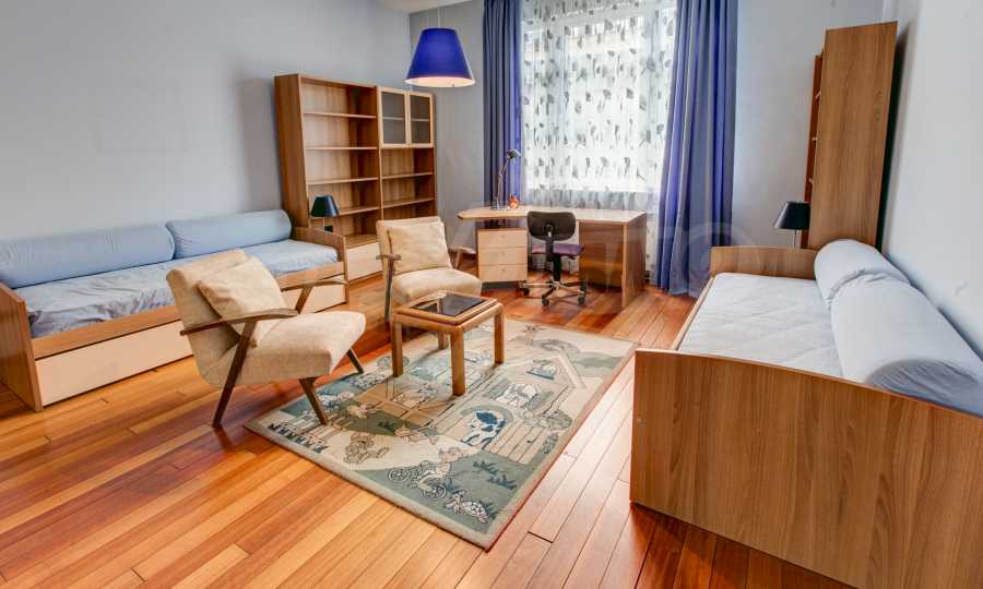 Меблировка: Мягкая меблировку; кресла; обеденный стол с шестью стульями; зеркало; вешалка для одежды; тумба для обуви; тумба под телевизор; кондиционеры; встроенная кухня; посудомоечная машина "Gorenje"; холодильник "Liebherr"; стиральная машина "Electrolux"; духовой шкаф с варочными поверхностями; кровать с матрасом; прикроватные тумбочки; две кровати; письменные столы; шкафы; светильники и т. д.