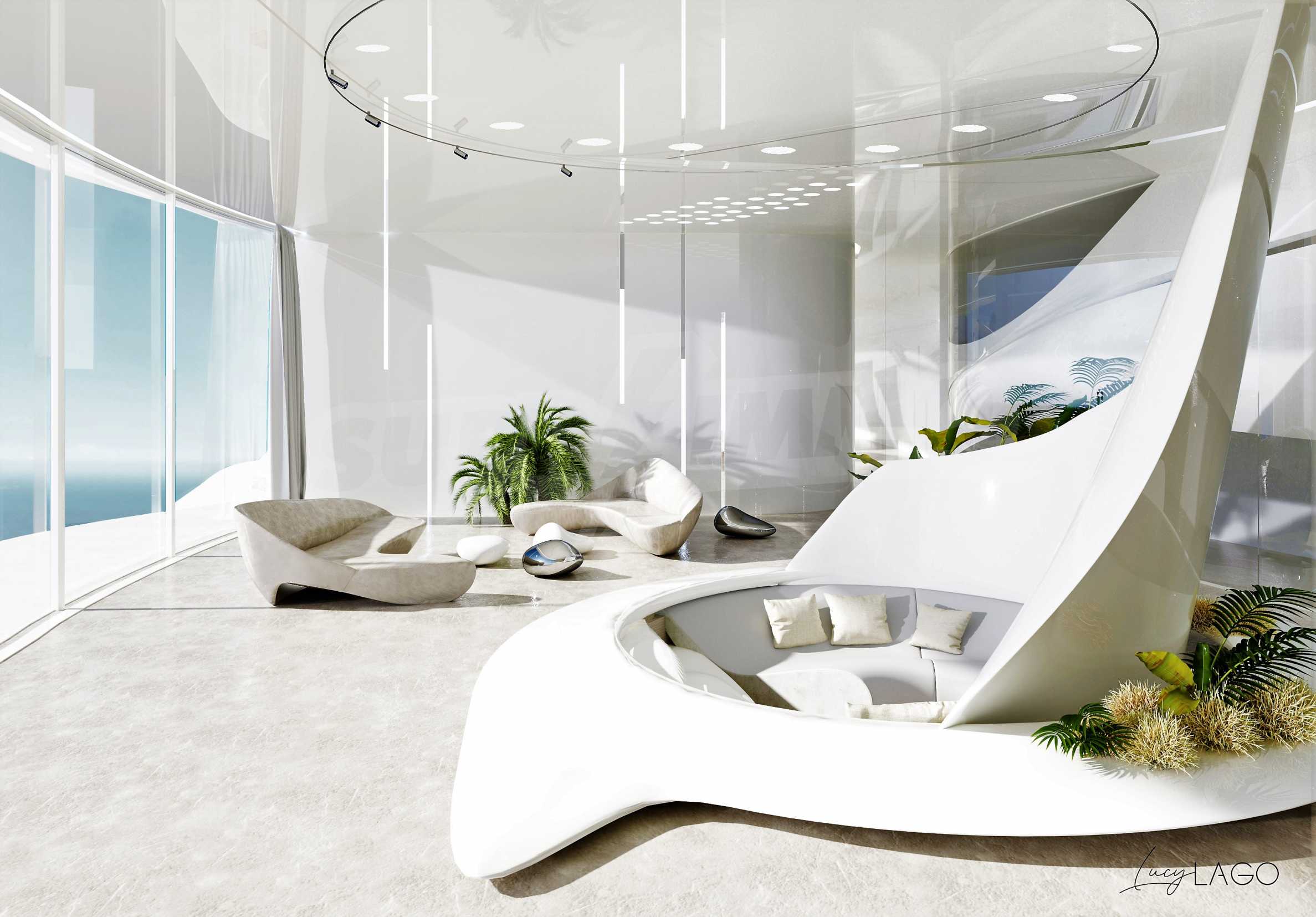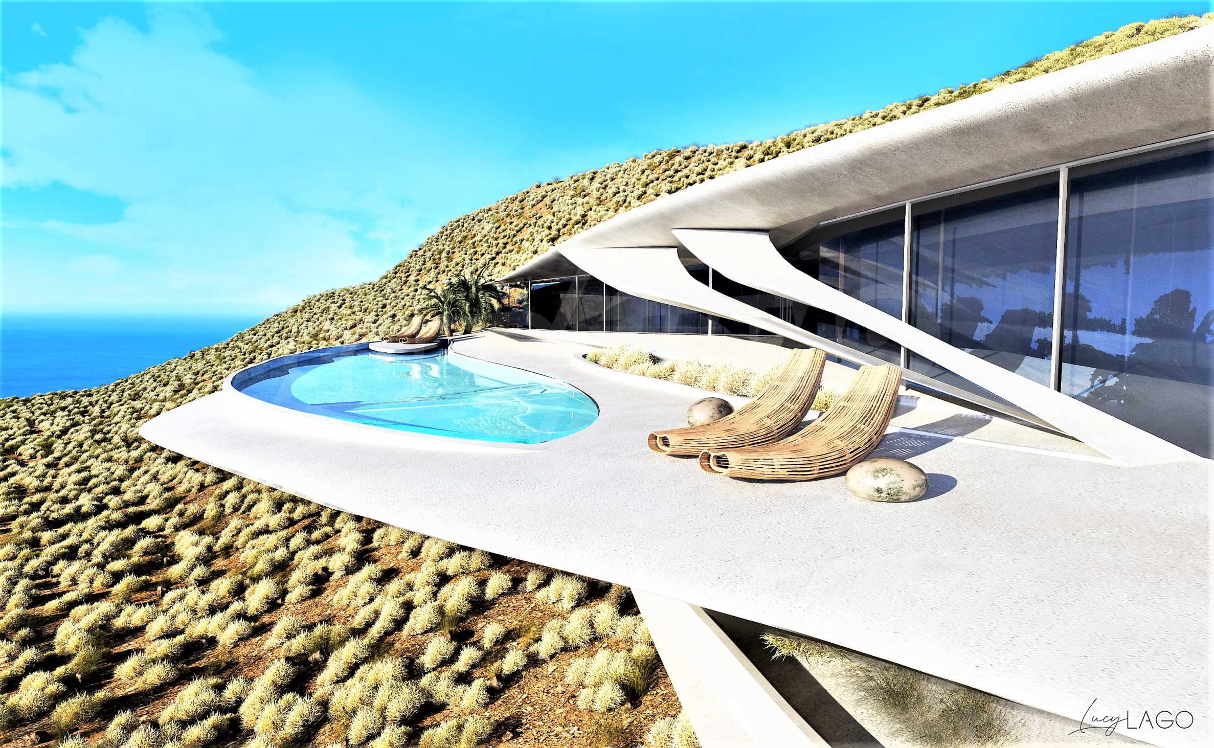 Вилла THEA - это божественное место для роскошной жизни на острове Закинф. Философия проекта - найти баланс между архитектурным дизайном и окружающей средой. Вилла имеет плавные естественные формы с тонкими изгибами в каждой линии. В отличие от конструкции здания, вилла словно парит над простором горного холма в районе Керри. Плавность форм прослеживается на протяжении всего проекта, начиная от функционального решения плана и заканчивая террасами и бассейном вокруг виллы. У этого проекта есть стиль и индивидуальность. Вилла станет дорогой жемчужиной, расположенной на просторах природы. Архитектурная уникальность и оригинальность сделают виллу Thea особенной в архитектурном портфолио всего мира. Сочетание футуризма с натуризмом - шаг в будущее. Использование современных технологий, экологических методов строительства ставит виллу на ступеньку выше и ее значимость. Можно создать мотивы природы и одновременно прикоснуться к космической теме Земли. Вилла состоит из открытой гостиной, столовой и кухни, 8 спален, 7 ванных комнат, тренажерного зала, подвала, кладовой, большого бассейна, сада и парковочных мест. Интерьер виллы составляет единое целое со всем архитектурным проектом. Органические формы и изогнутые плавные линии являются частью пространства. Для интерьера выбирают белый цвет, светлые оттенки, стекло и светоотражающие поверхности. Все внимание сосредоточено на панорамном виде на море из окон. Красота в каждой детали, особое внимание к естественному и искусственному освещению. Зеленые растения являются акцентом в интерьере и напоминают нам, что мы находимся на прекрасном острове Закинф.