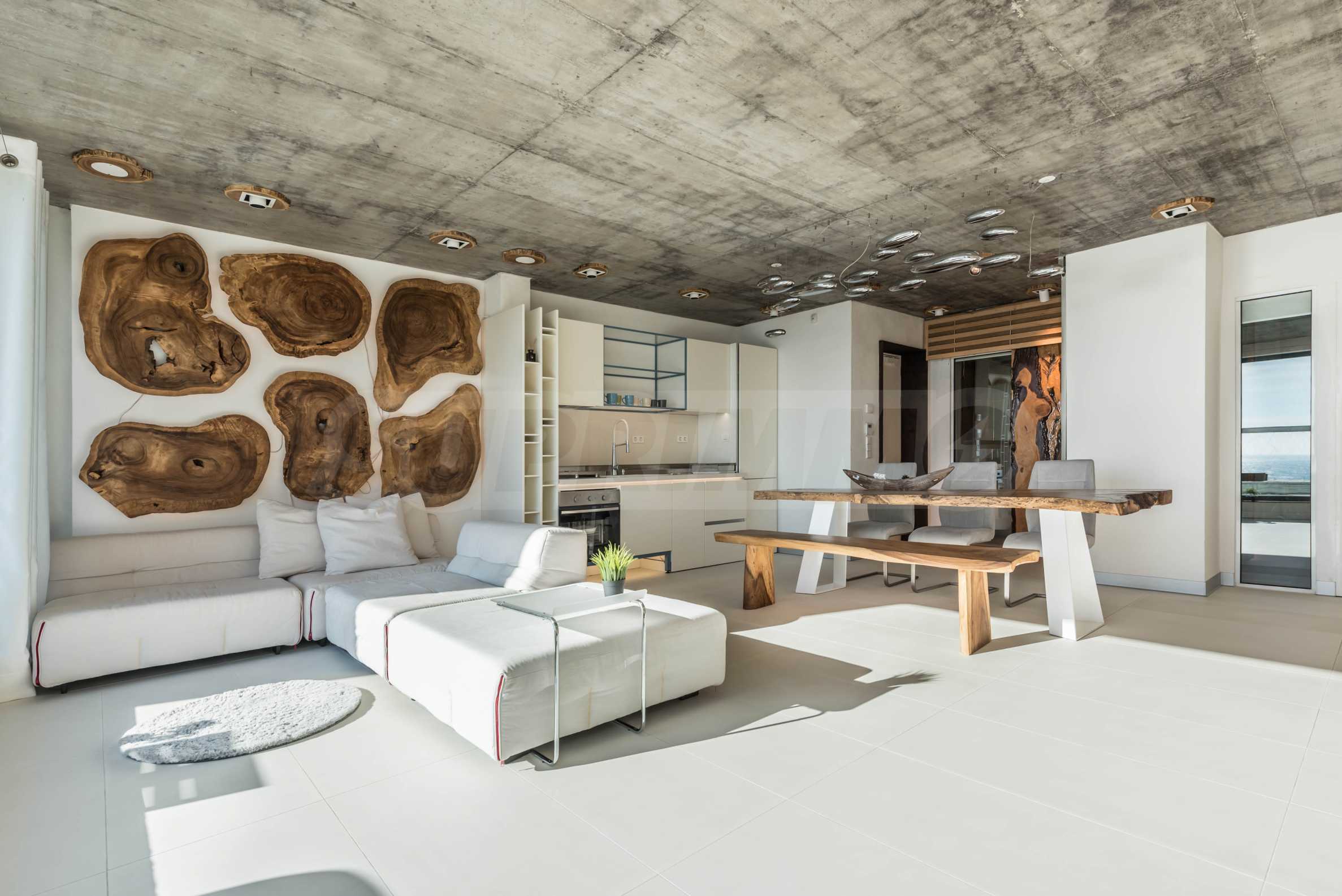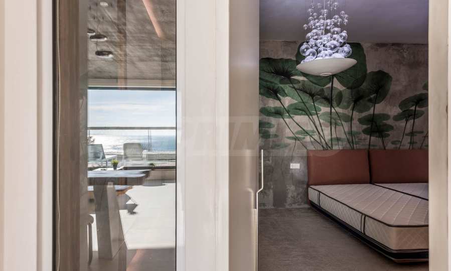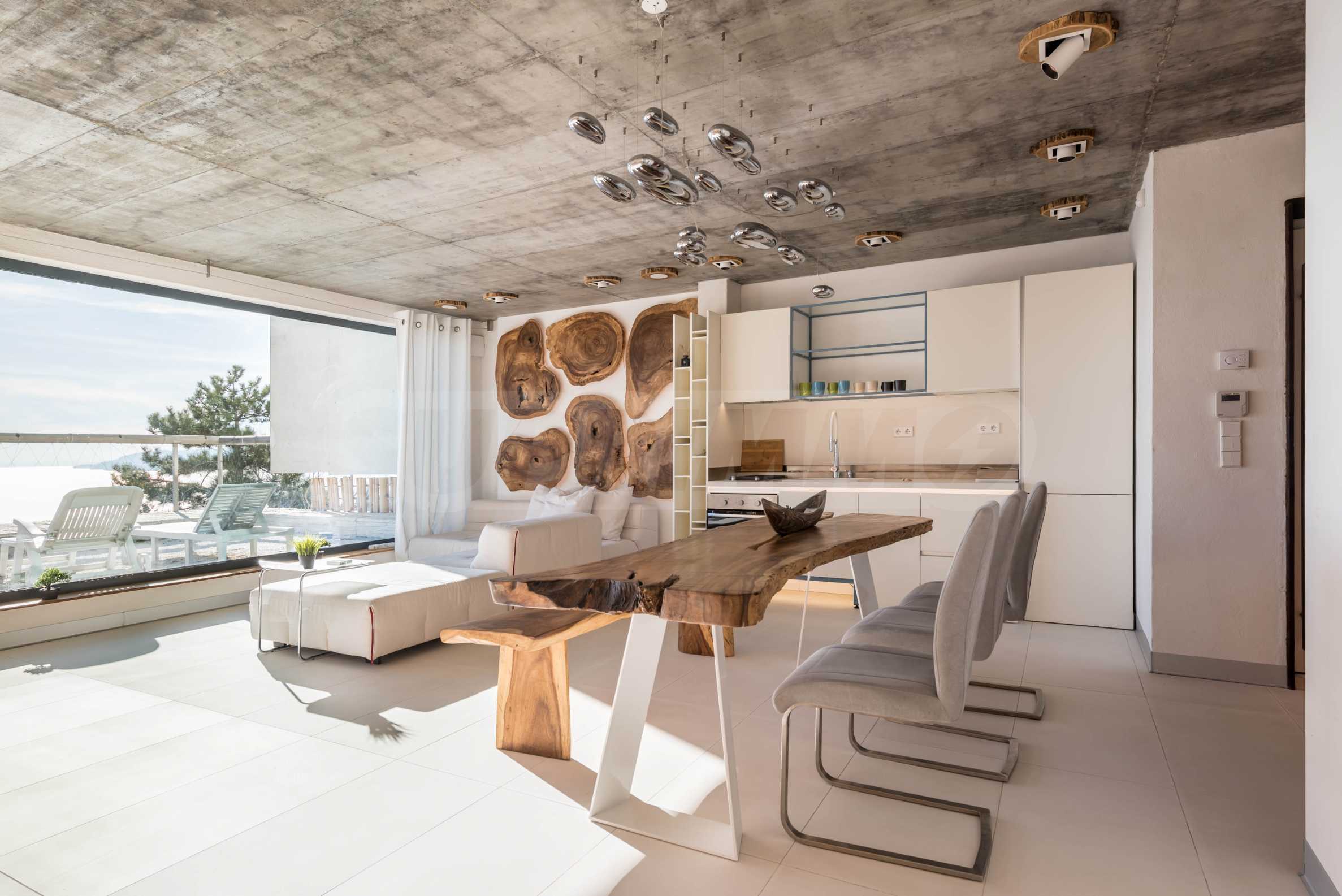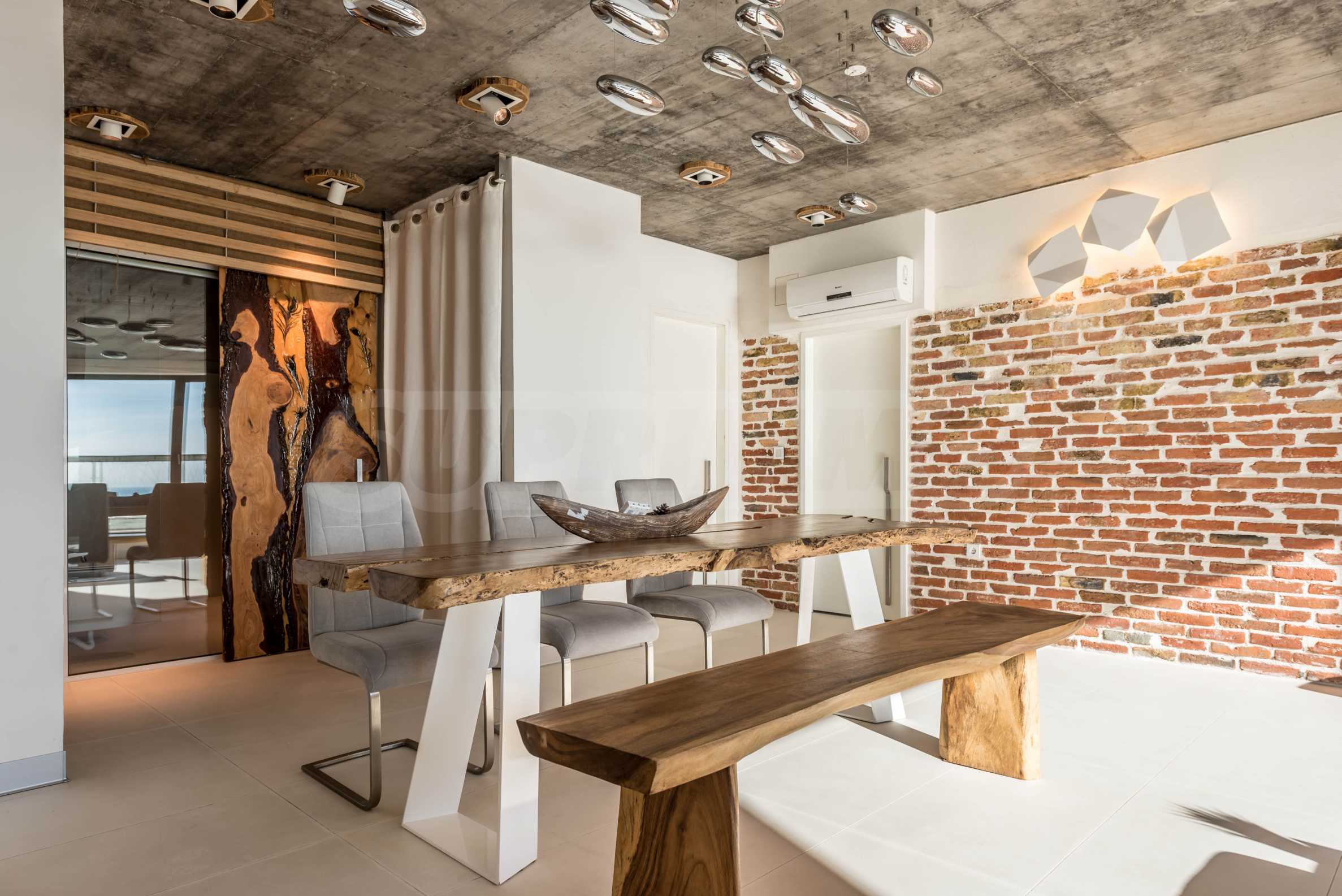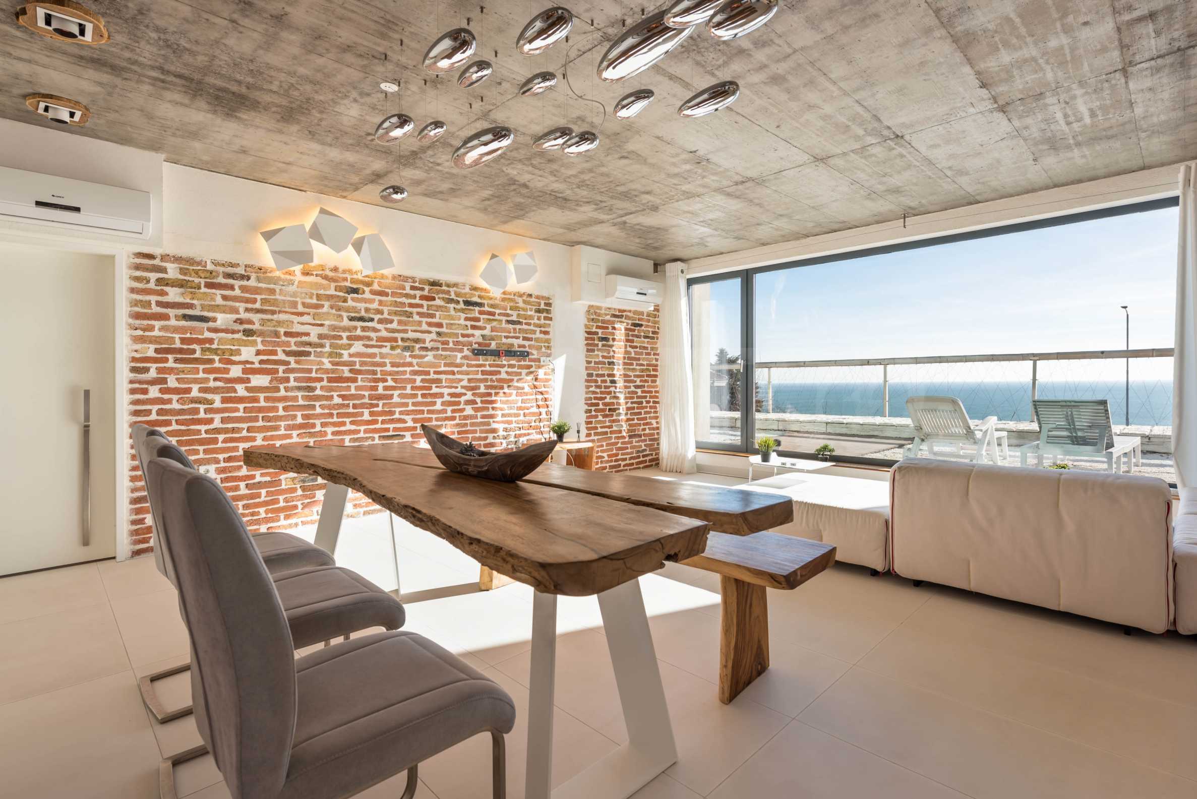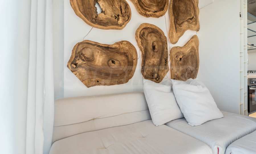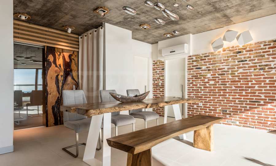 Дизайн уникален - естественный и современный, вызывающий и яркий, несущий идею автономии, расслабления и морской атмосферы. В бетонные плиты потолка квартиры вмонтированы натуральные бетонные орнаменты из акации. Кирпичные стены и бетон используются для естественной отделки, так как дополнительно обрабатываются, пропитываются и грунтуются. Мебель, кухня, матрасы и диваны, привлекательная плитка, светильники - все от известных итальянских брендов. В центре внимания столовой – экстравагантный стол, изготовленный на заказ из ценных и редких пород амазонского дерева. Ванная комната отделена стеклянной дверью, для обилия солнечного света, а все туалеты первоклассного немецкого качества.
