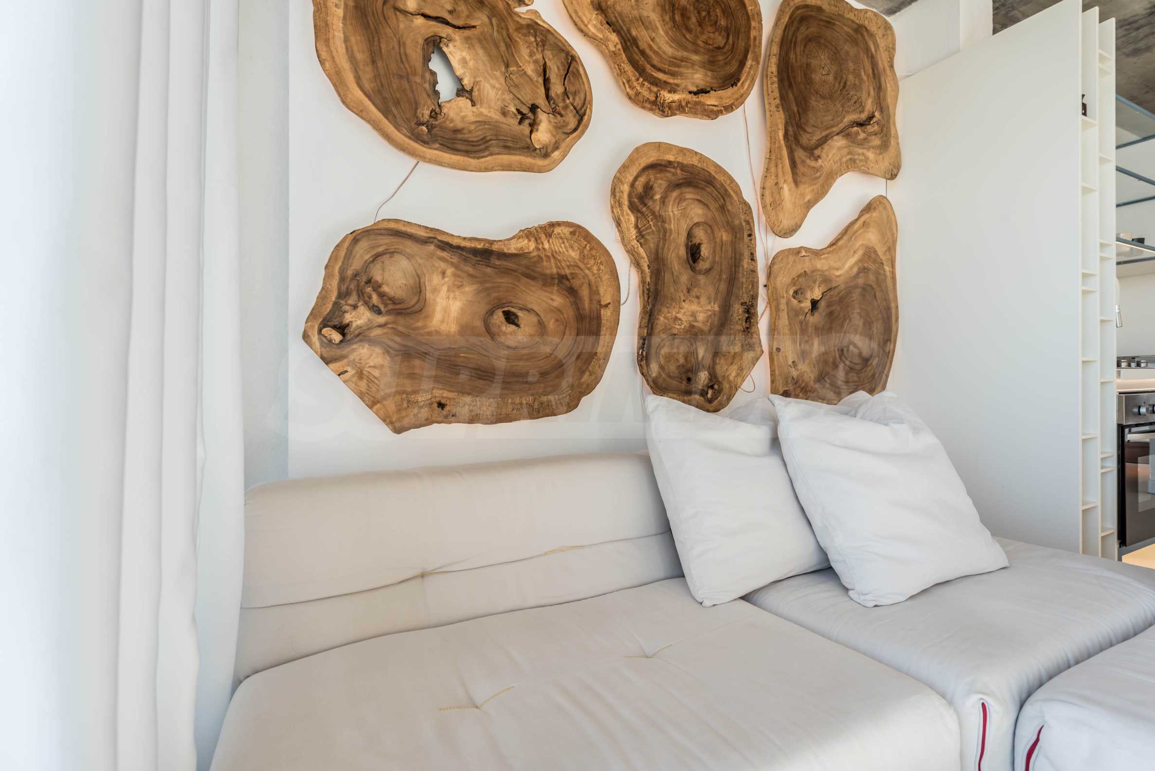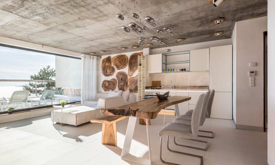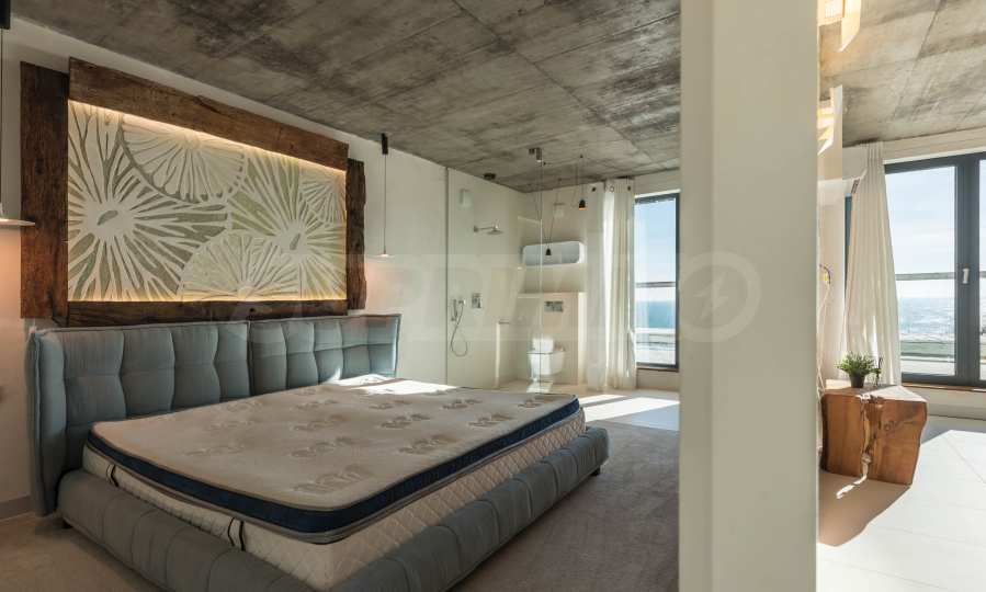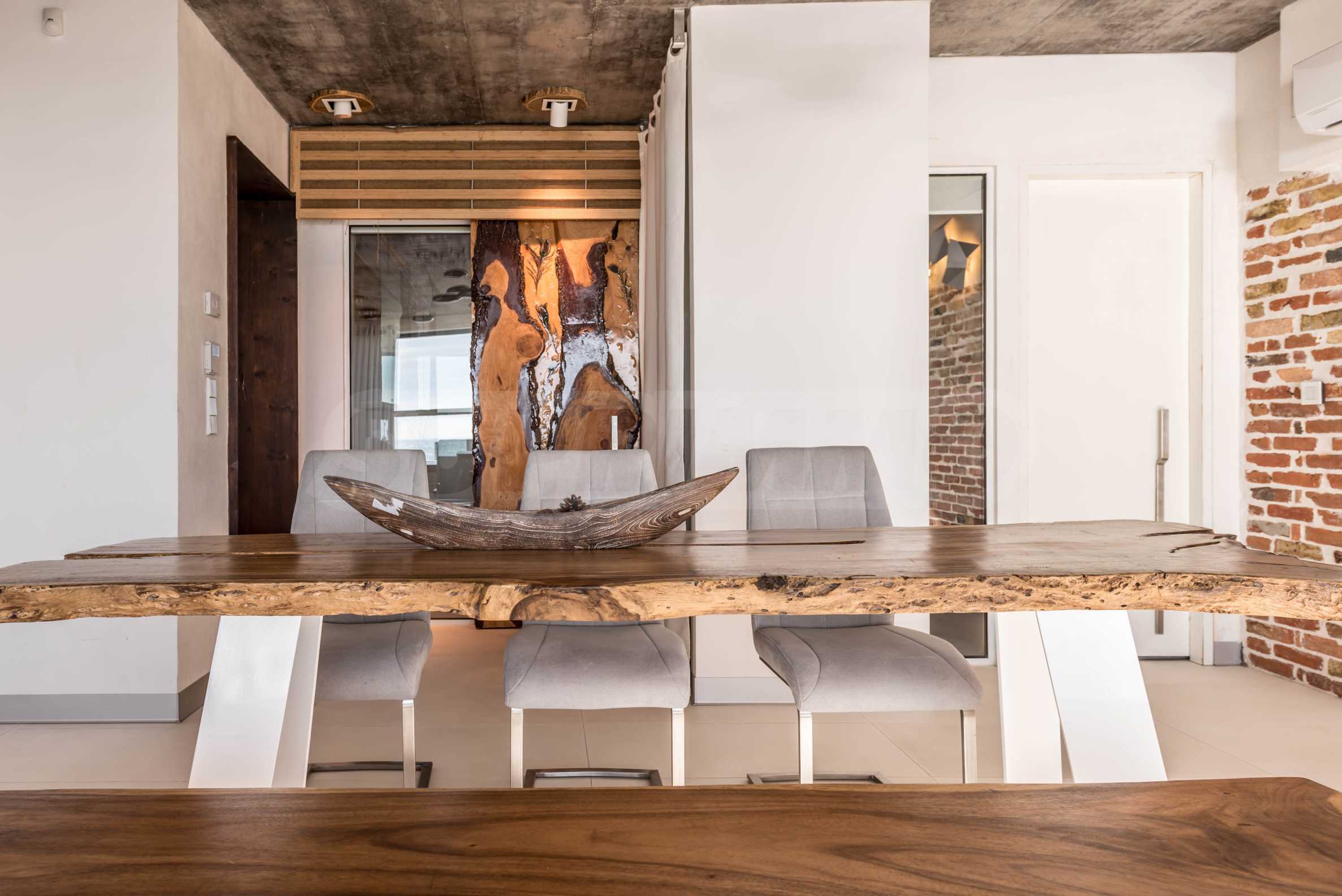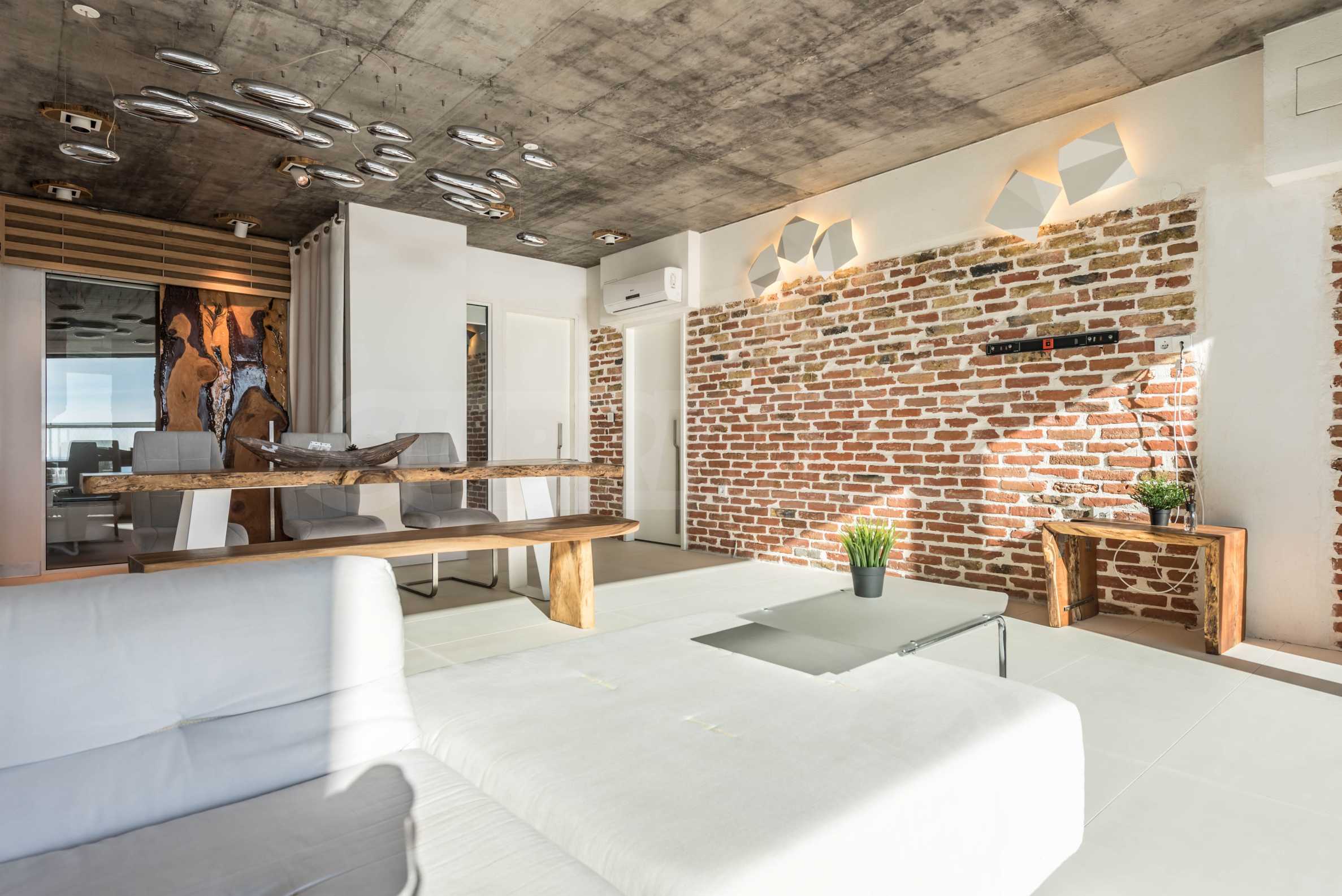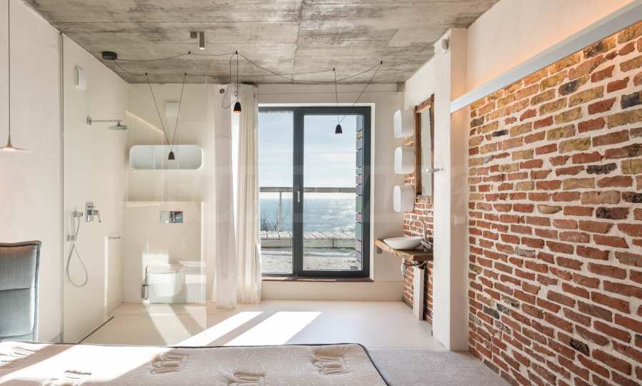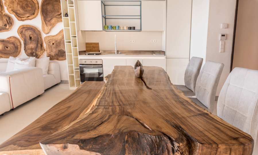 Дизайн уникален - естественный и современный, вызывающий и яркий, несущий идею автономии, расслабления и морской атмосферы. В бетонные плиты потолка квартиры вмонтированы натуральные бетонные орнаменты из акации. Кирпичные стены и бетон используются для естественной отделки, так как дополнительно обрабатываются, пропитываются и грунтуются. Мебель, кухня, матрасы и диваны, привлекательная плитка, светильники - все от известных итальянских брендов. В центре внимания столовой – экстравагантный стол, изготовленный на заказ из ценных и редких пород амазонского дерева. Ванная комната отделена стеклянной дверью, для обилия солнечного света, а все туалеты первоклассного немецкого качества.