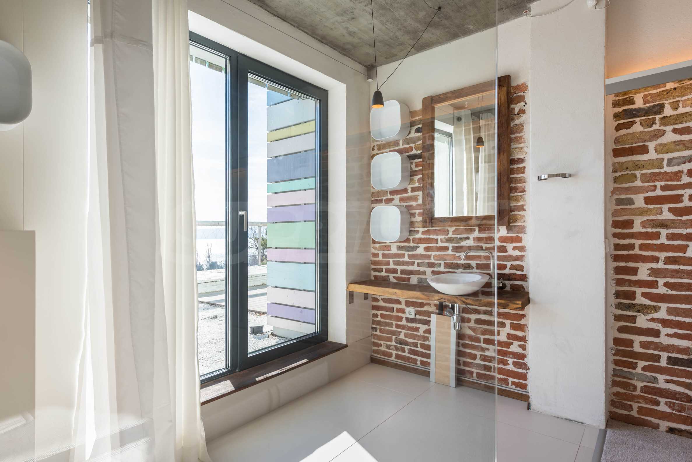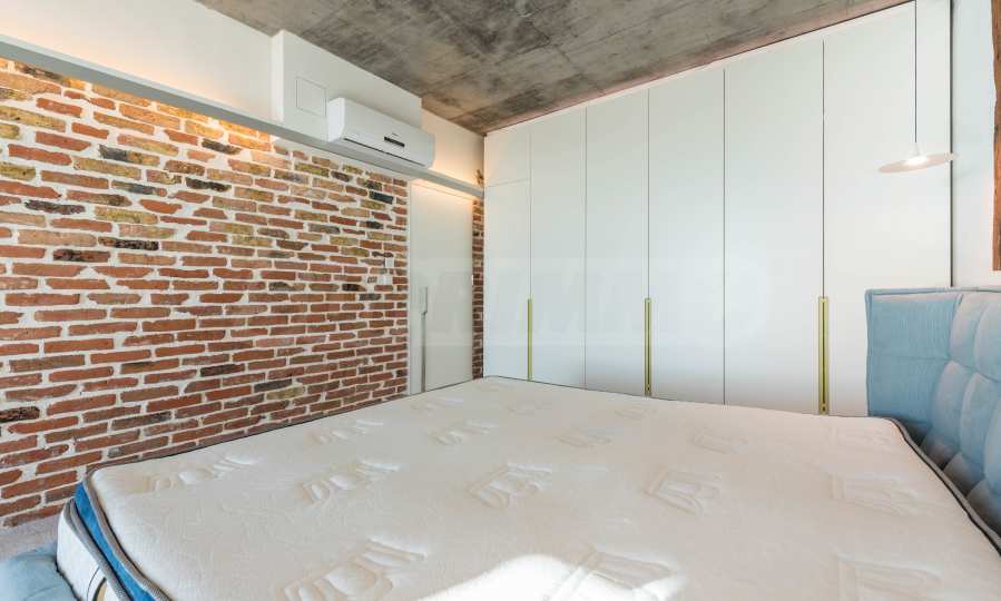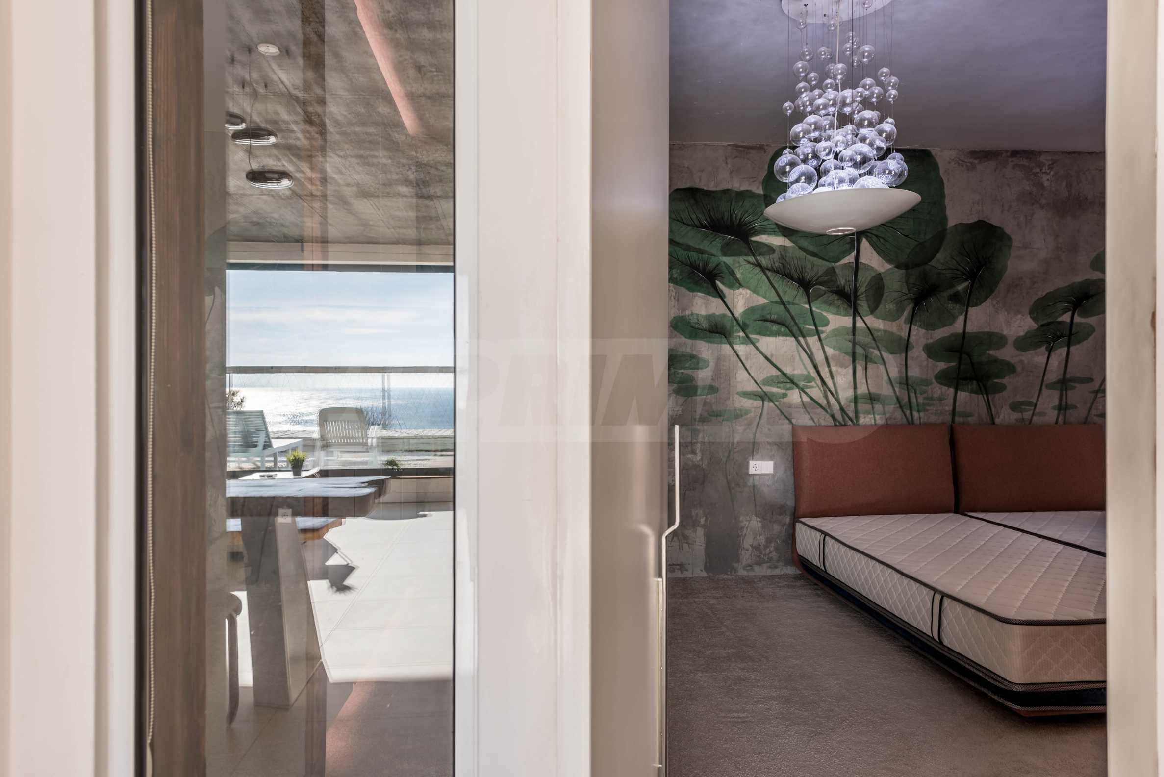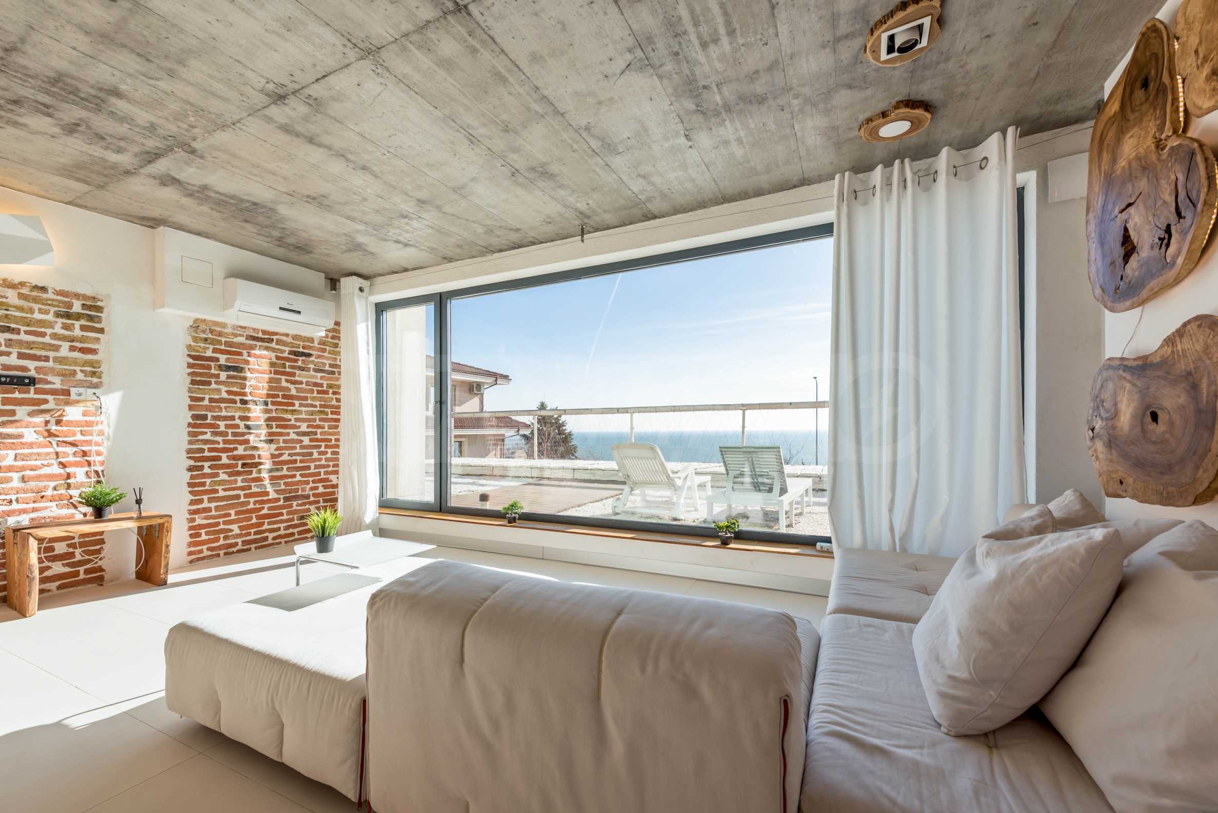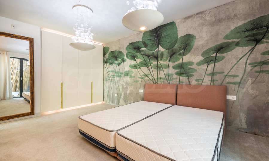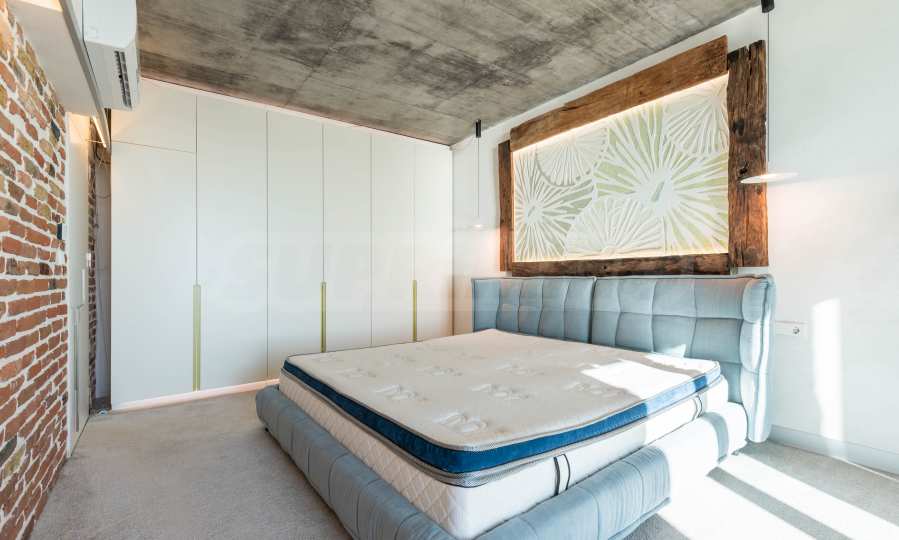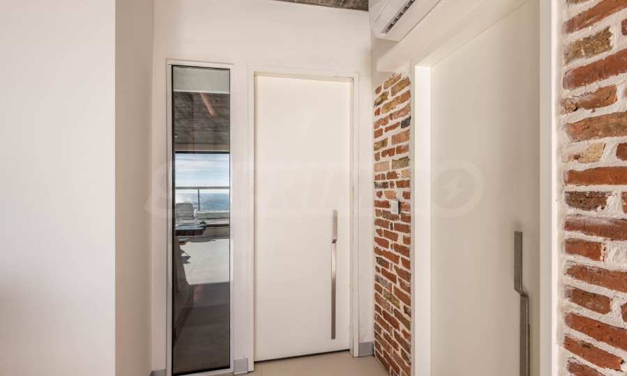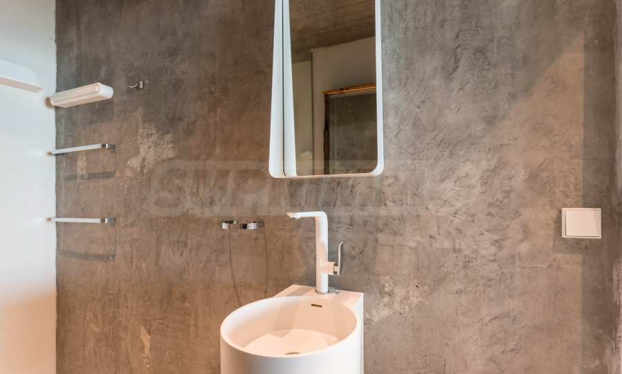 Дизайн уникален - естественный и современный, вызывающий и яркий, несущий идею автономии, расслабления и морской атмосферы. В бетонные плиты потолка квартиры вмонтированы натуральные бетонные орнаменты из акации. Кирпичные стены и бетон используются для естественной отделки, так как дополнительно обрабатываются, пропитываются и грунтуются. Мебель, кухня, матрасы и диваны, привлекательная плитка, светильники - все от известных итальянских брендов. В центре внимания столовой – экстравагантный стол, изготовленный на заказ из ценных и редких пород амазонского дерева. Ванная комната отделена стеклянной дверью, для обилия солнечного света, а все туалеты первоклассного немецкого качества.
