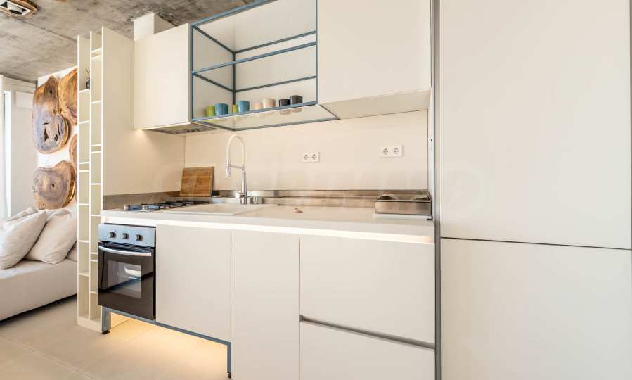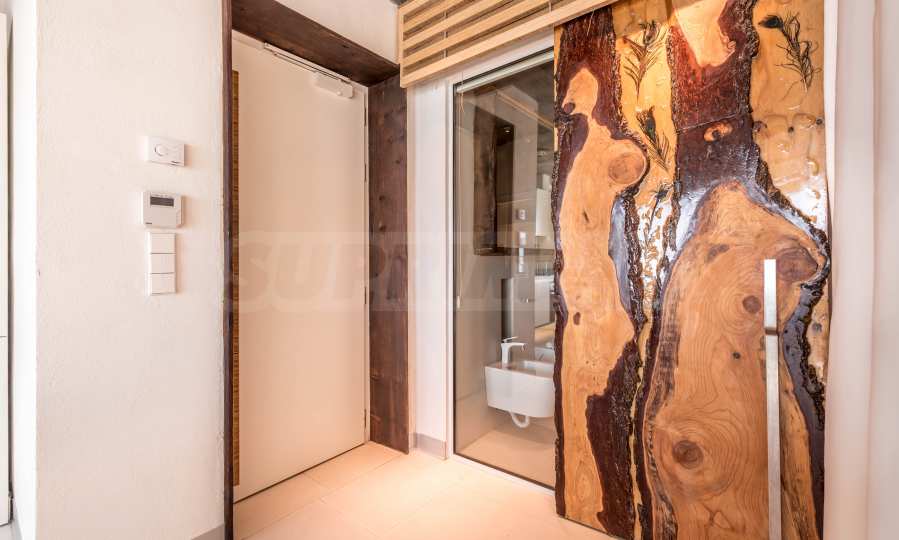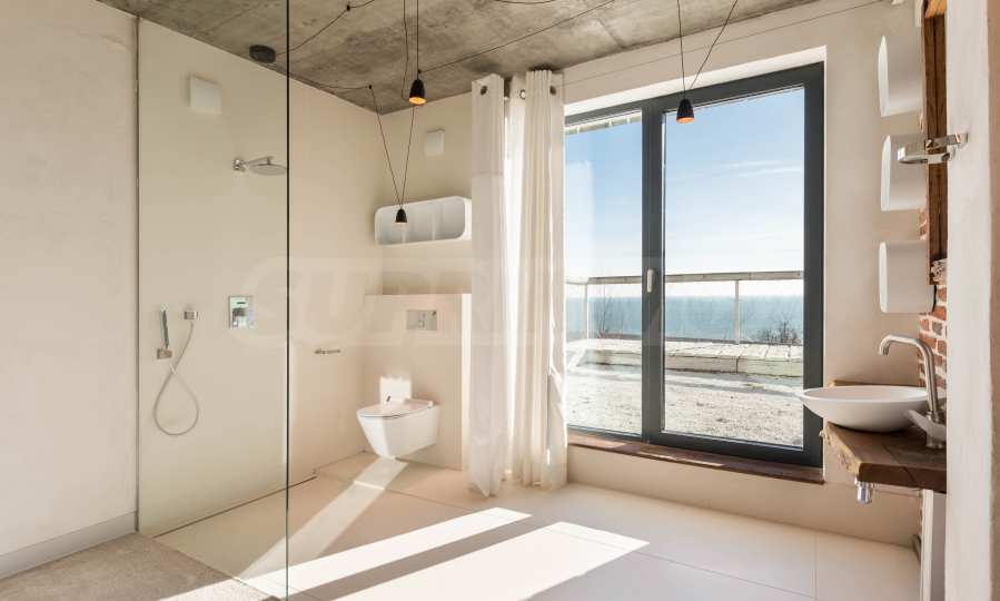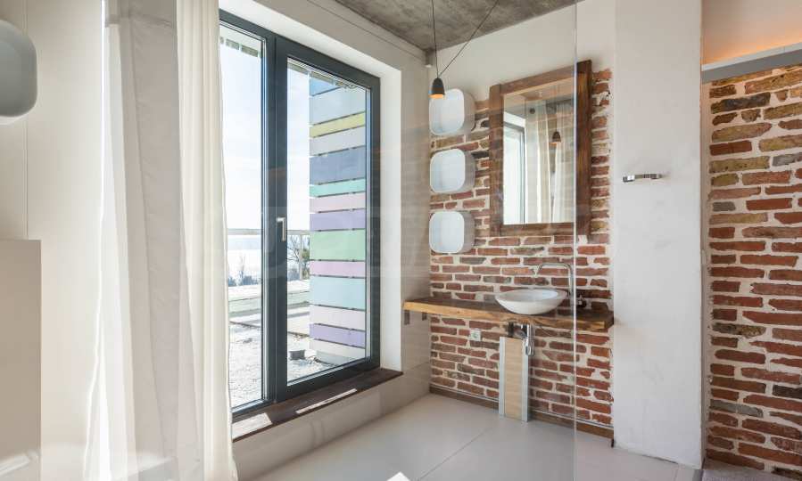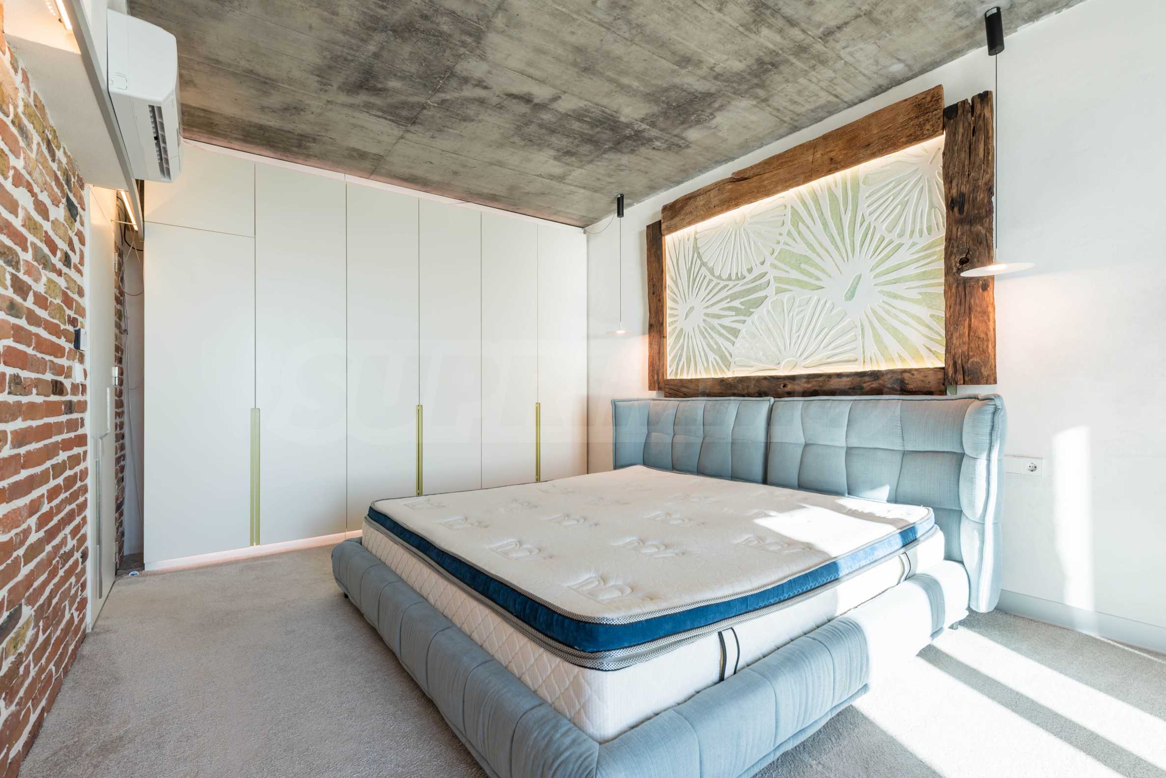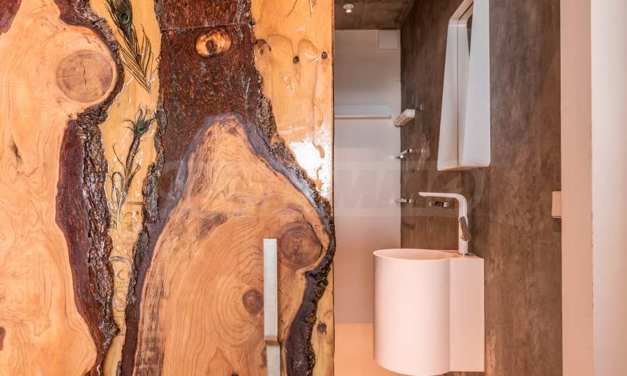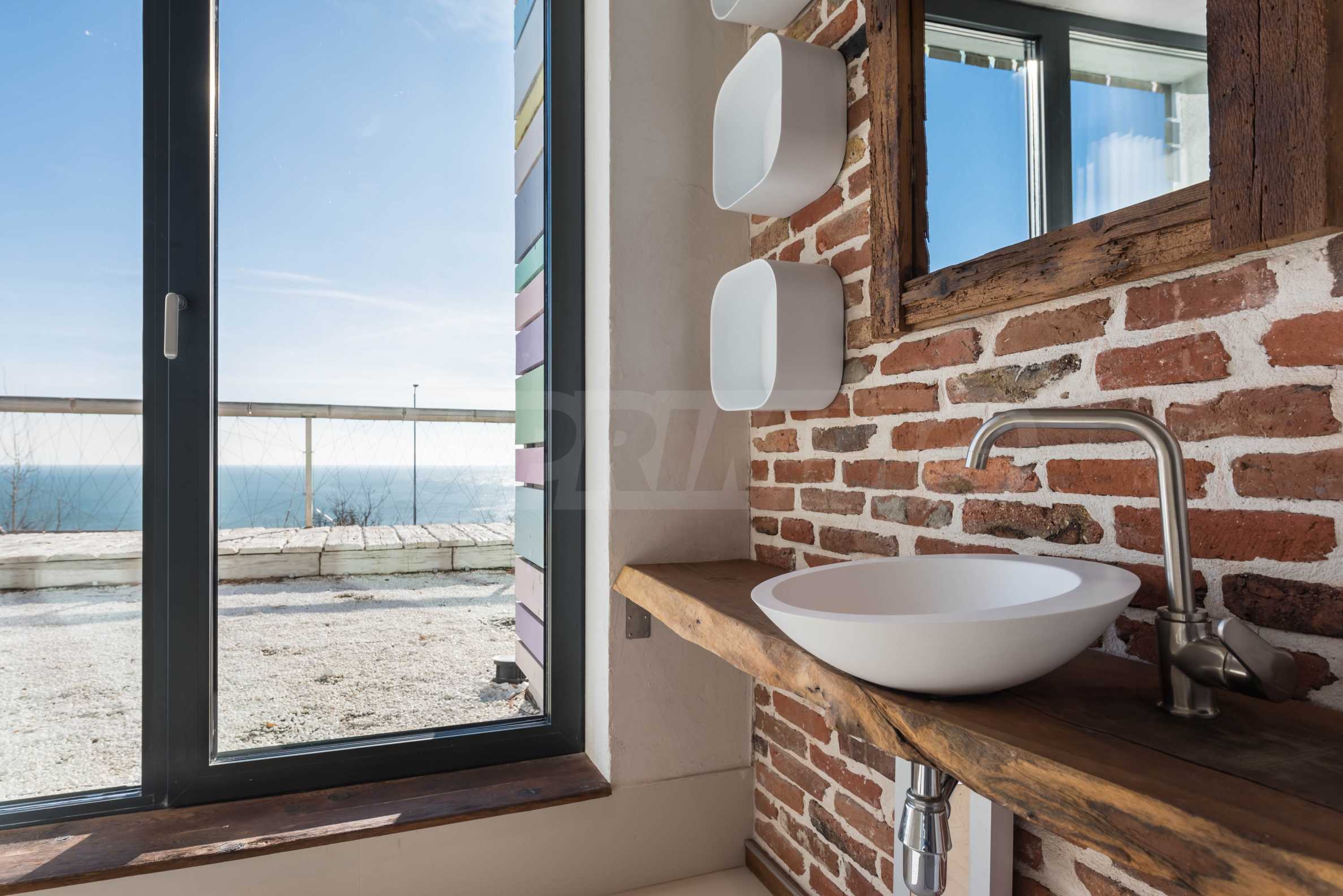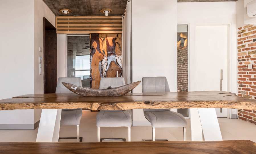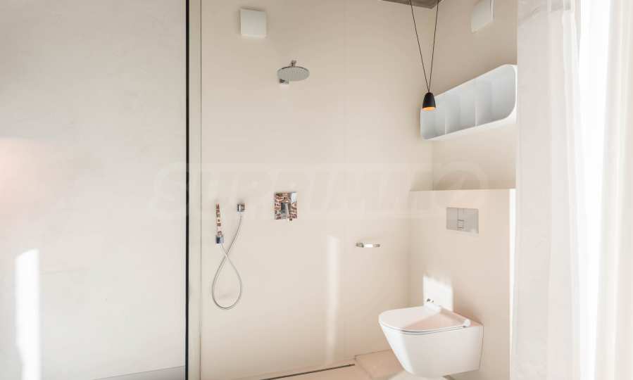 Дизайн уникален - естественный и современный, вызывающий и яркий, несущий идею автономии, расслабления и морской атмосферы. В бетонные плиты потолка квартиры вмонтированы натуральные бетонные орнаменты из акации. Кирпичные стены и бетон используются для естественной отделки, так как дополнительно обрабатываются, пропитываются и грунтуются. Мебель, кухня, матрасы и диваны, привлекательная плитка, светильники - все от известных итальянских брендов. В центре внимания столовой – экстравагантный стол, изготовленный на заказ из ценных и редких пород амазонского дерева. Ванная комната отделена стеклянной дверью, для обилия солнечного света, а все туалеты первоклассного немецкого качества.