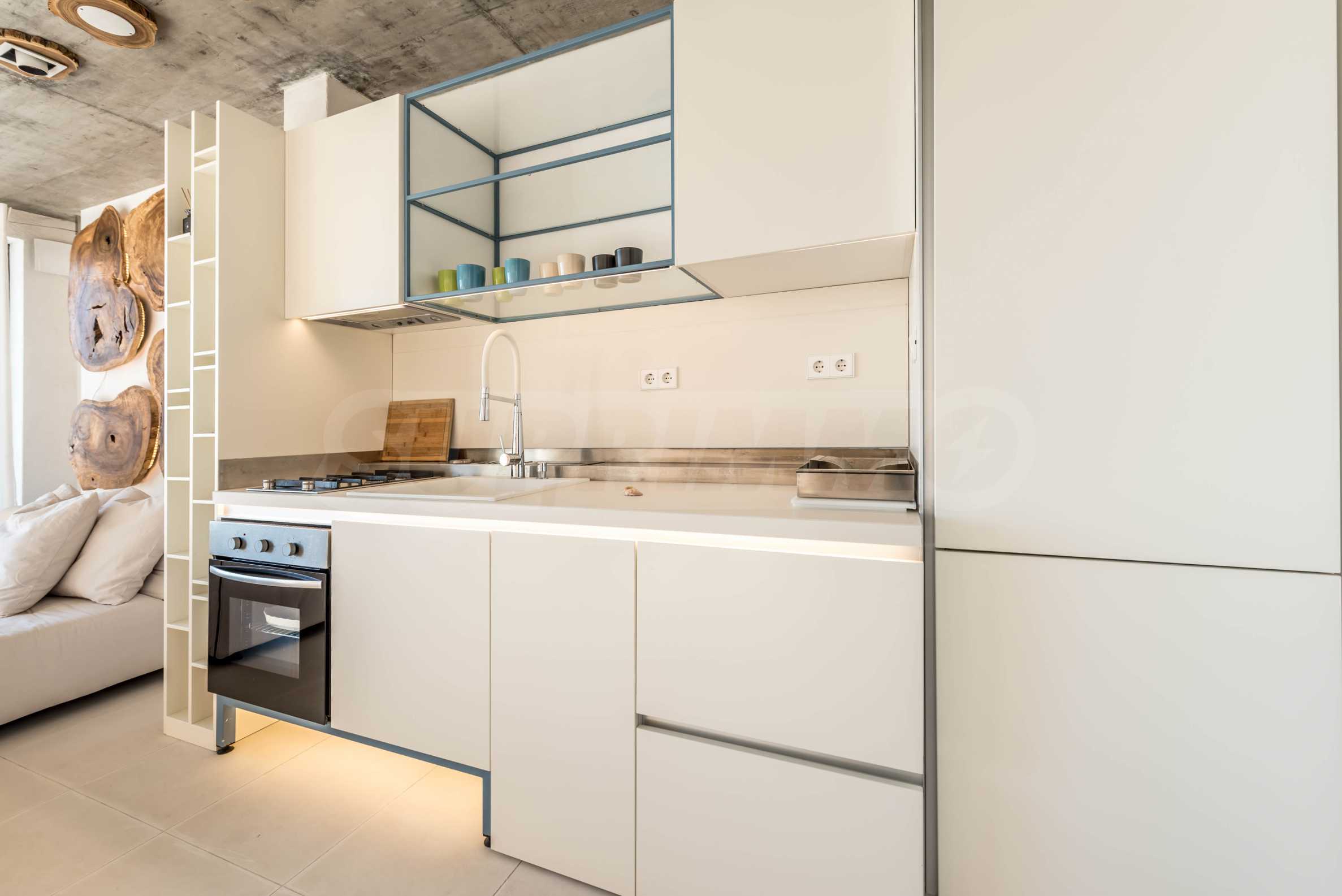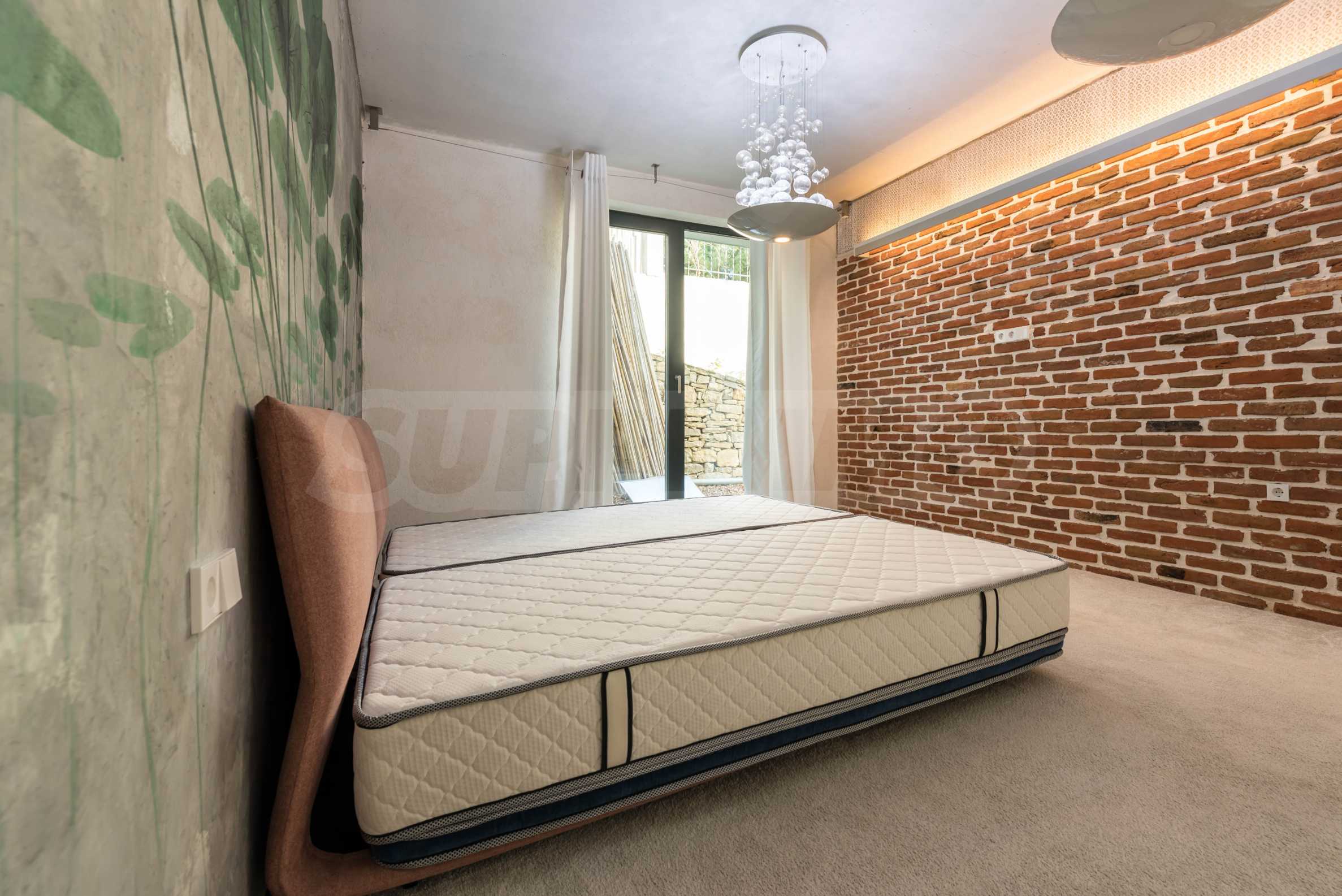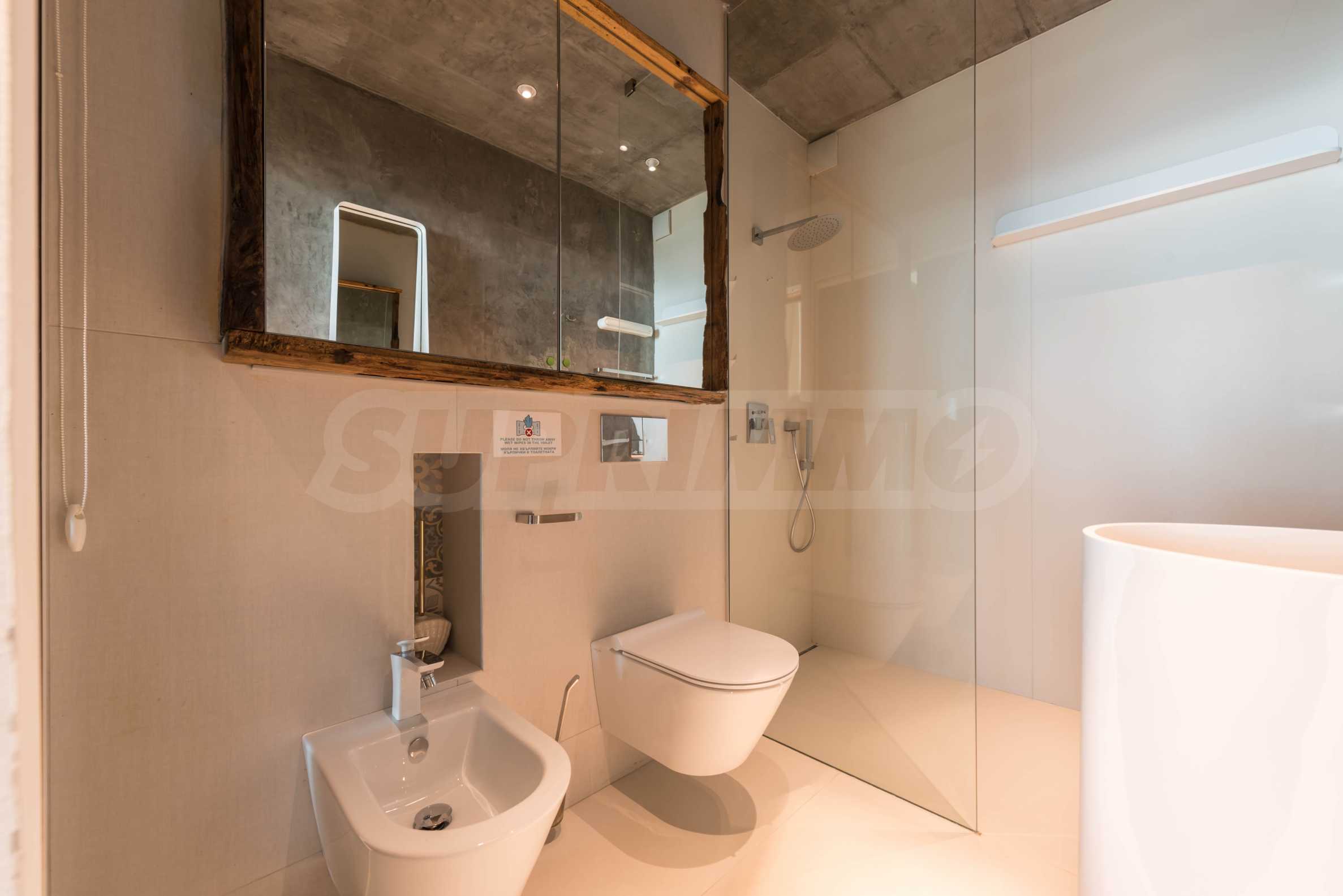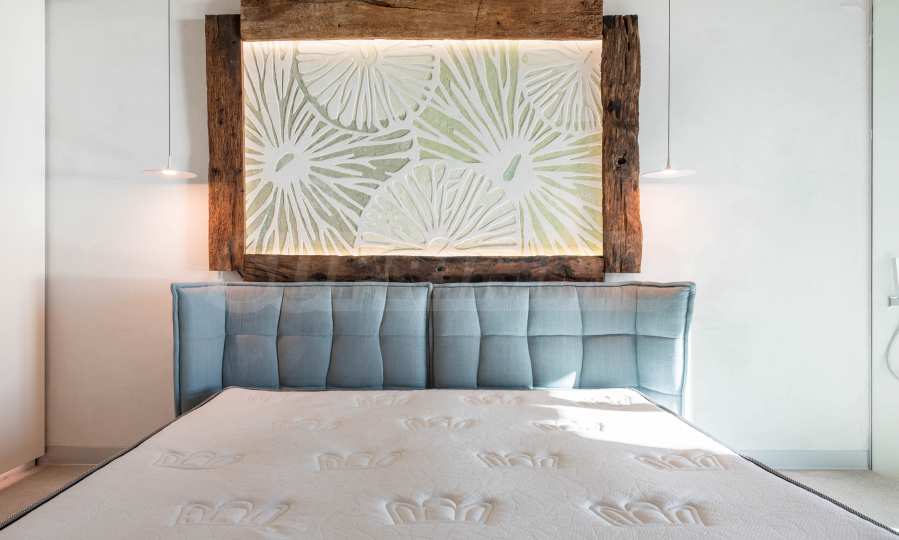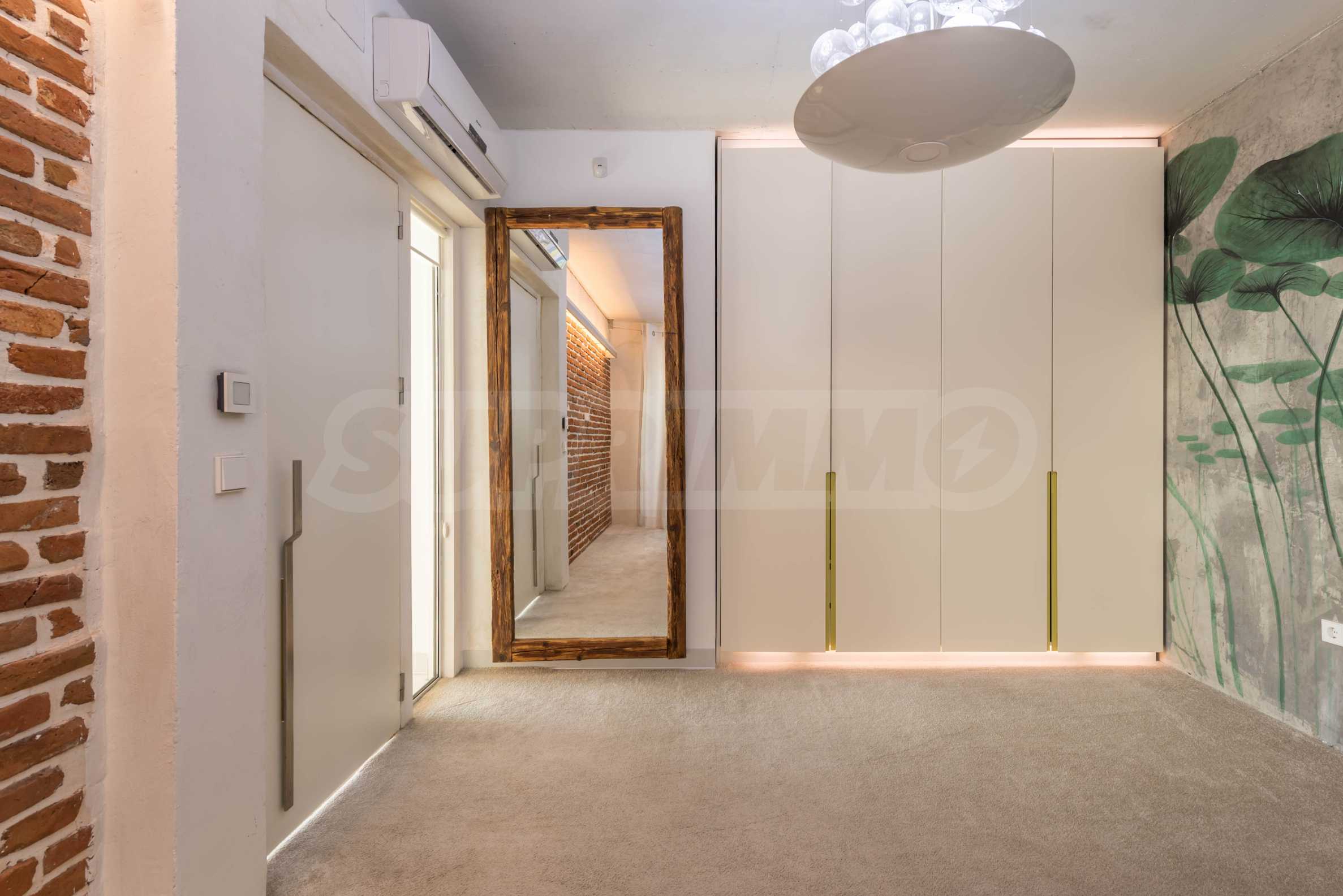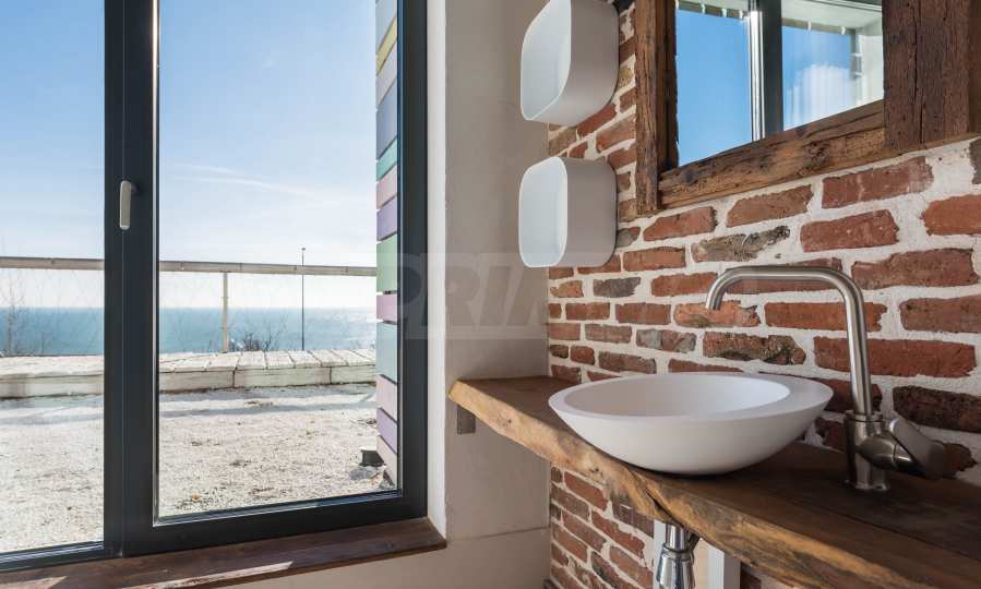 Дизайн уникален - естественный и современный, вызывающий и яркий, несущий идею автономии, расслабления и морской атмосферы. В бетонные плиты потолка квартиры вмонтированы натуральные бетонные орнаменты из акации. Кирпичные стены и бетон используются для естественной отделки, так как дополнительно обрабатываются, пропитываются и грунтуются. Мебель, кухня, матрасы и диваны, привлекательная плитка, светильники - все от известных итальянских брендов. В центре внимания столовой – экстравагантный стол, изготовленный на заказ из ценных и редких пород амазонского дерева. Ванная комната отделена стеклянной дверью, для обилия солнечного света, а все туалеты первоклассного немецкого качества.