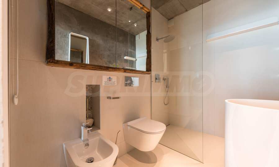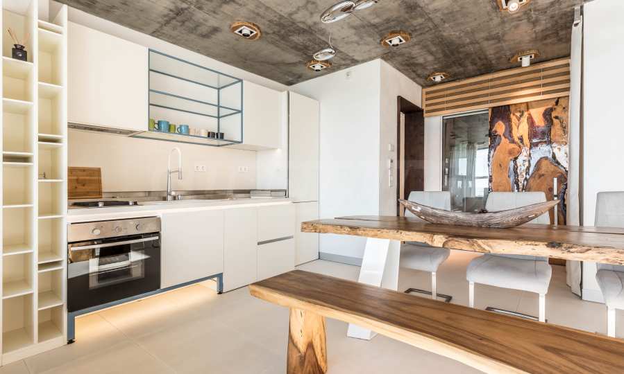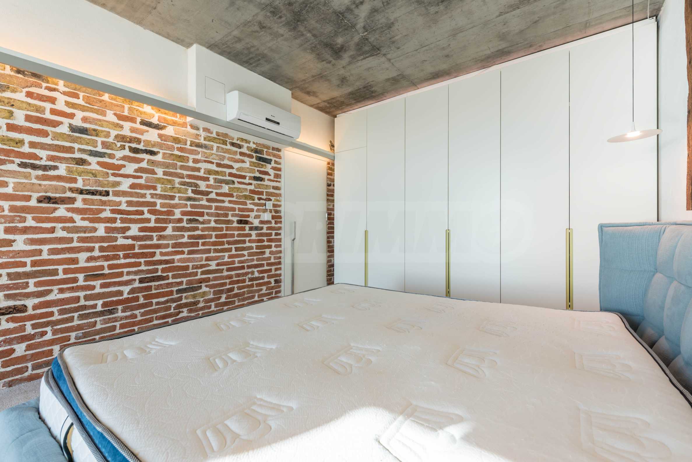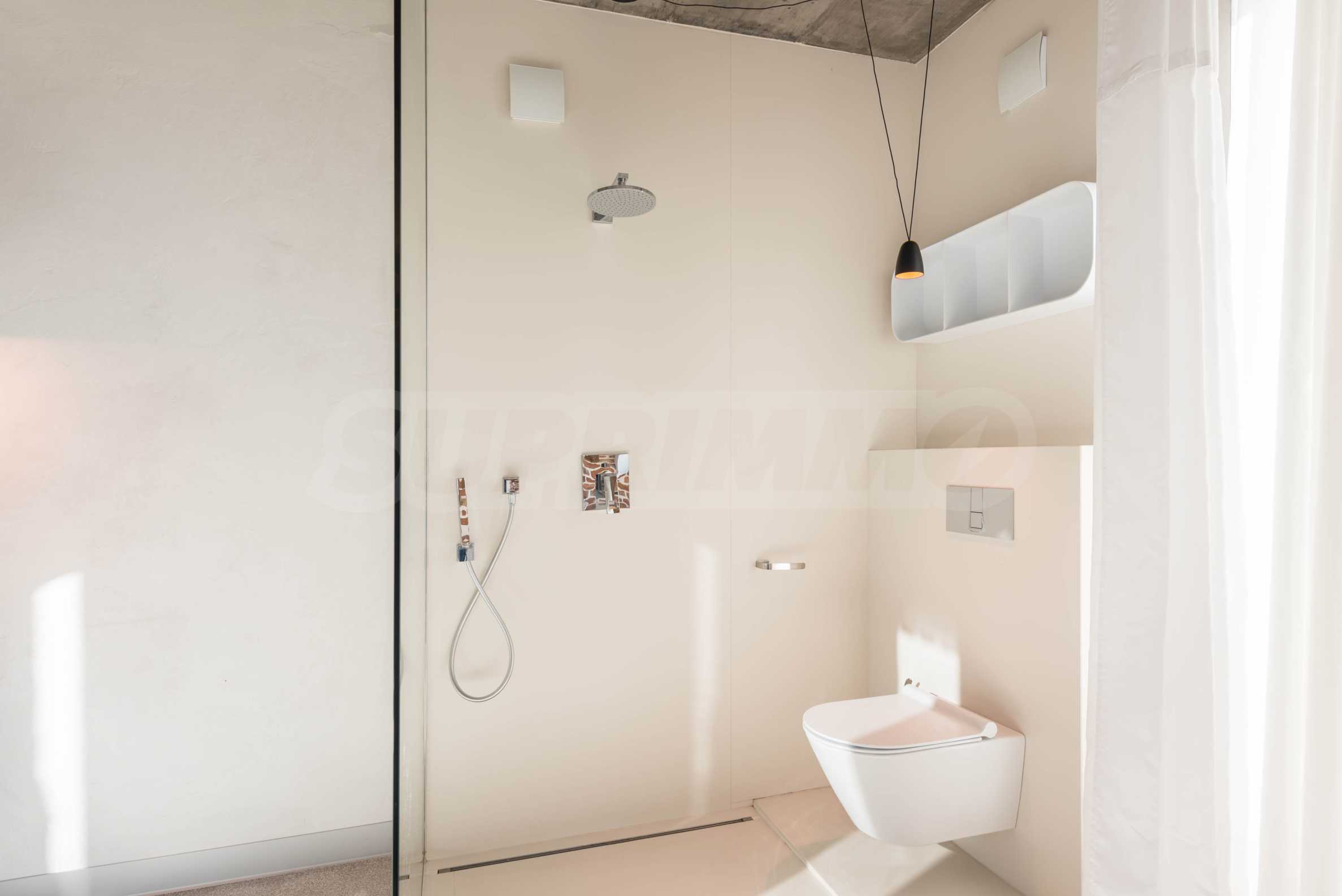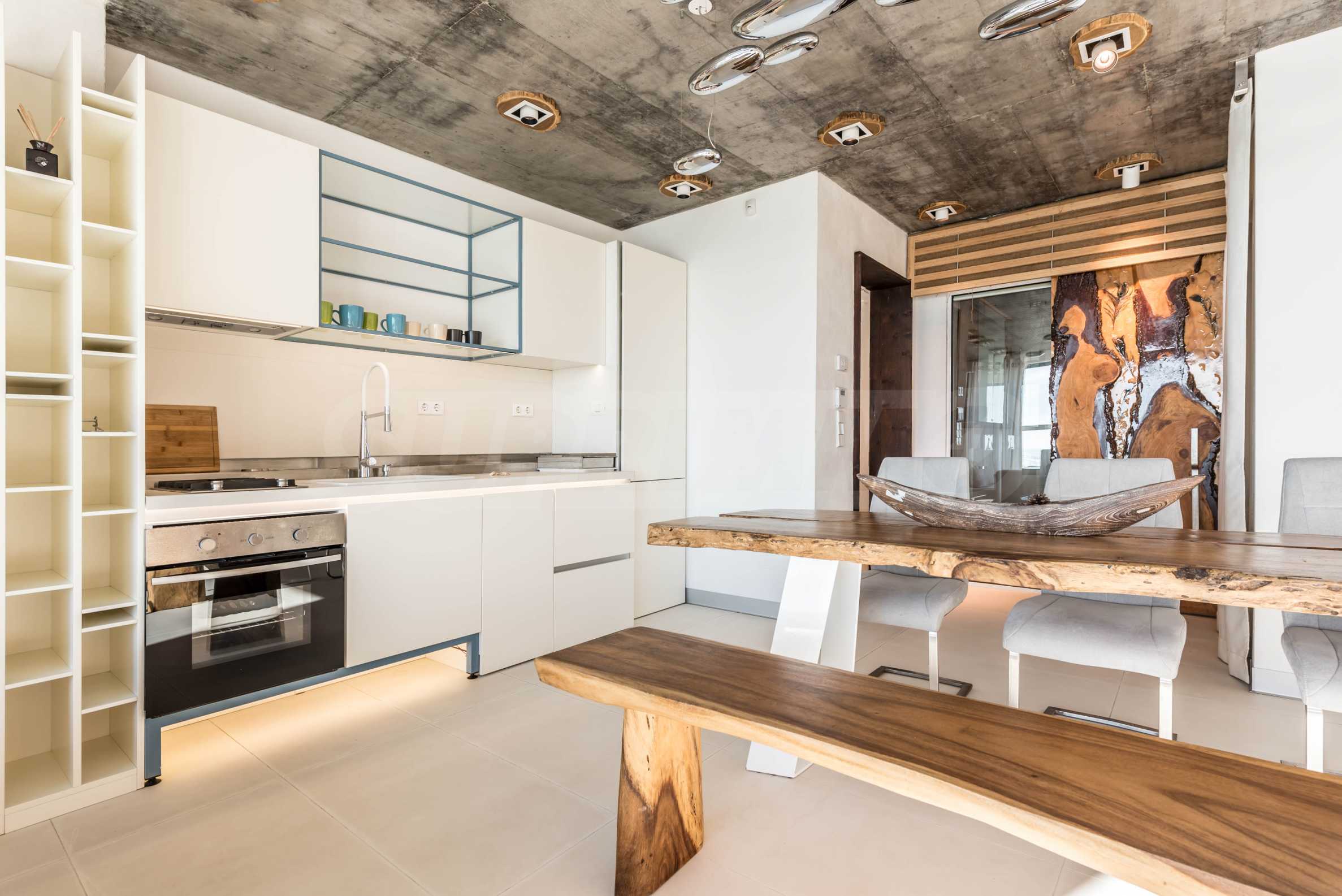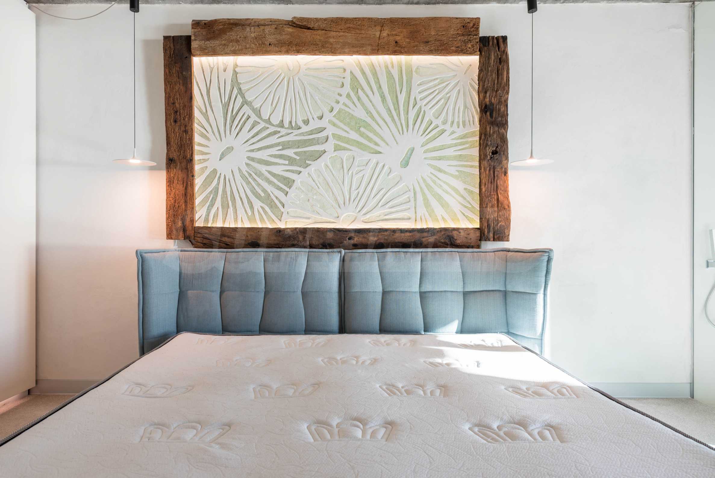 Дизайн уникален - естественный и современный, вызывающий и яркий, несущий идею автономии, расслабления и морской атмосферы. В бетонные плиты потолка квартиры вмонтированы натуральные бетонные орнаменты из акации. Кирпичные стены и бетон используются для естественной отделки, так как дополнительно обрабатываются, пропитываются и грунтуются. Мебель, кухня, матрасы и диваны, привлекательная плитка, светильники - все от известных итальянских брендов. В центре внимания столовой – экстравагантный стол, изготовленный на заказ из ценных и редких пород амазонского дерева. Ванная комната отделена стеклянной дверью, для обилия солнечного света, а все туалеты первоклассного немецкого качества.