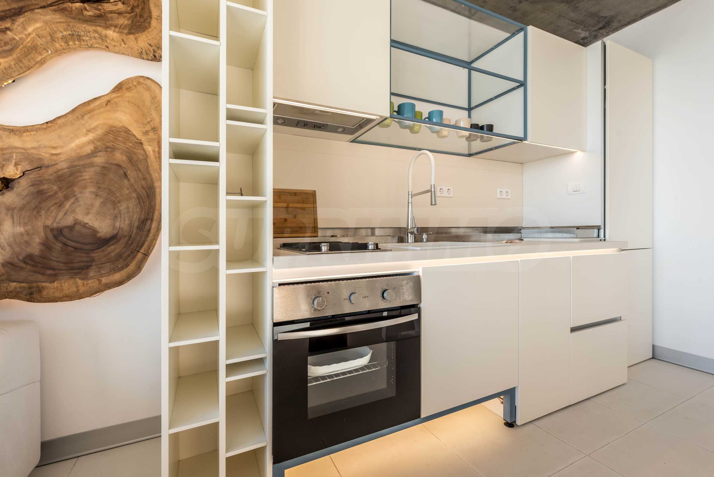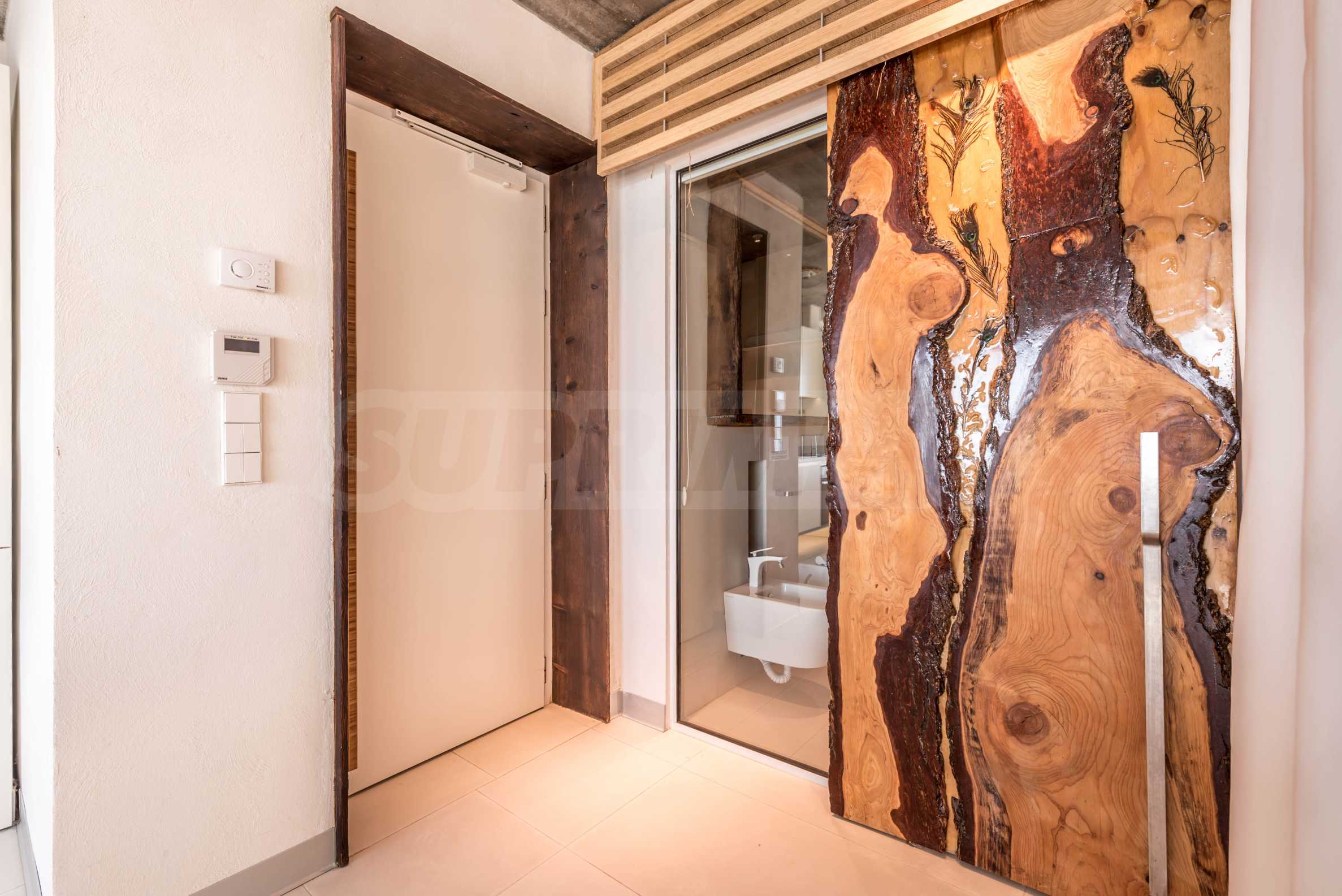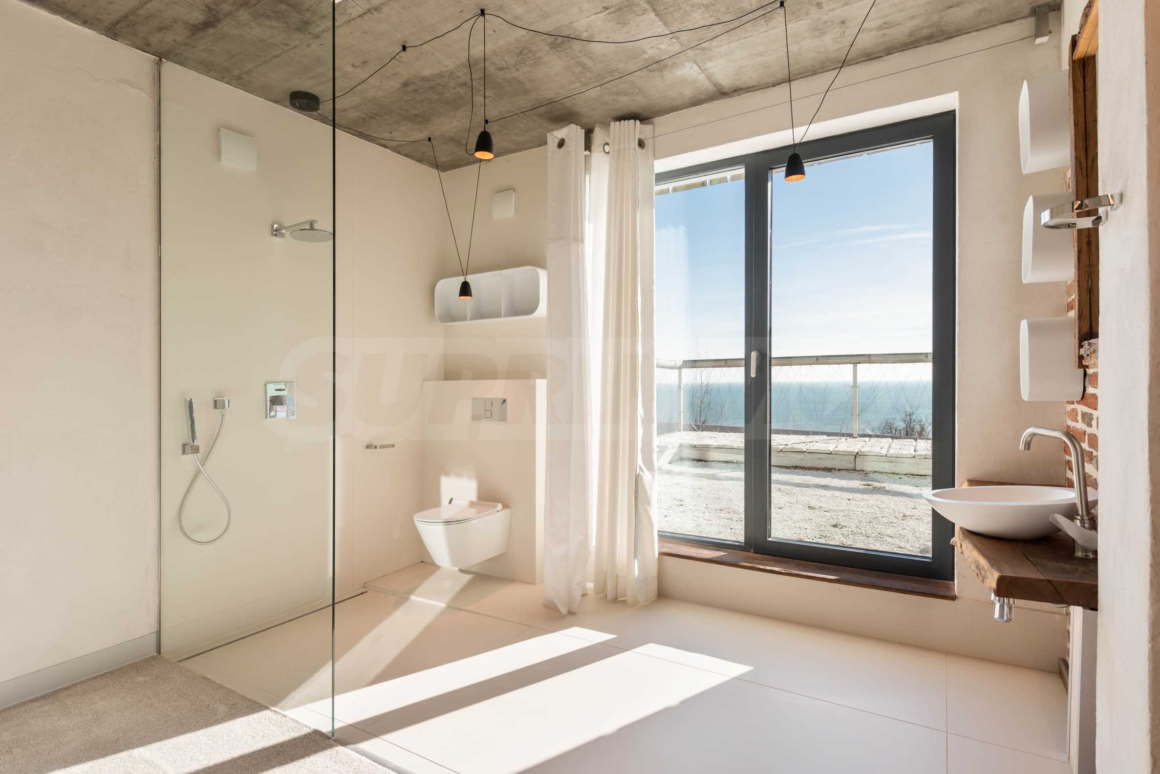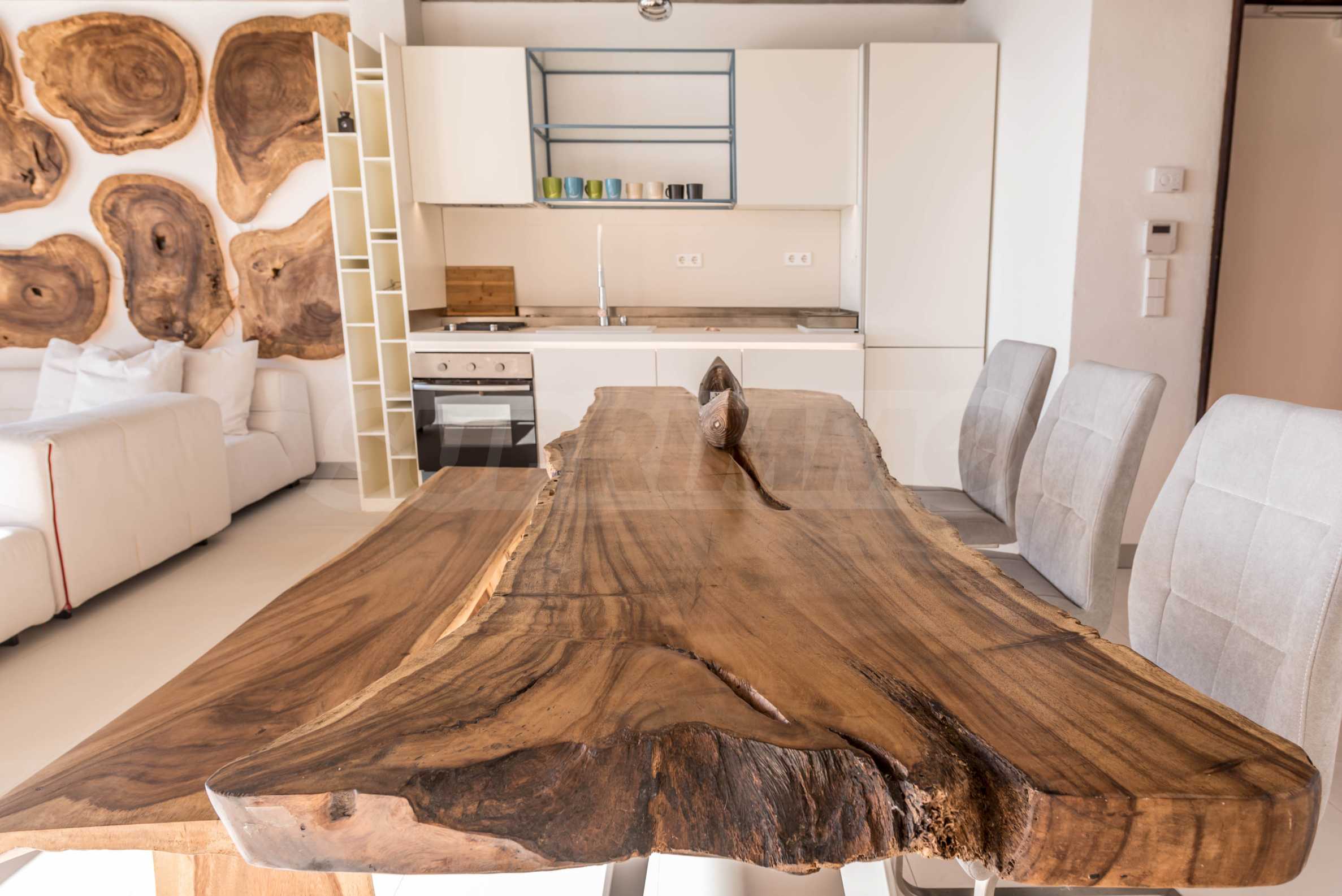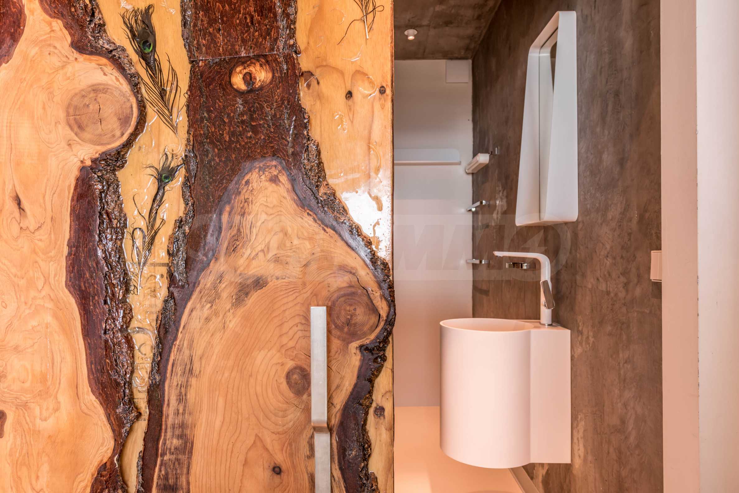 Дизайн уникален - естественный и современный, вызывающий и яркий, несущий идею автономии, расслабления и морской атмосферы. В бетонные плиты потолка квартиры вмонтированы натуральные бетонные орнаменты из акации. Кирпичные стены и бетон используются для естественной отделки, так как дополнительно обрабатываются, пропитываются и грунтуются. Мебель, кухня, матрасы и диваны, привлекательная плитка, светильники - все от известных итальянских брендов. В центре внимания столовой – экстравагантный стол, изготовленный на заказ из ценных и редких пород амазонского дерева. Ванная комната отделена стеклянной дверью, для обилия солнечного света, а все туалеты первоклассного немецкого качества.
