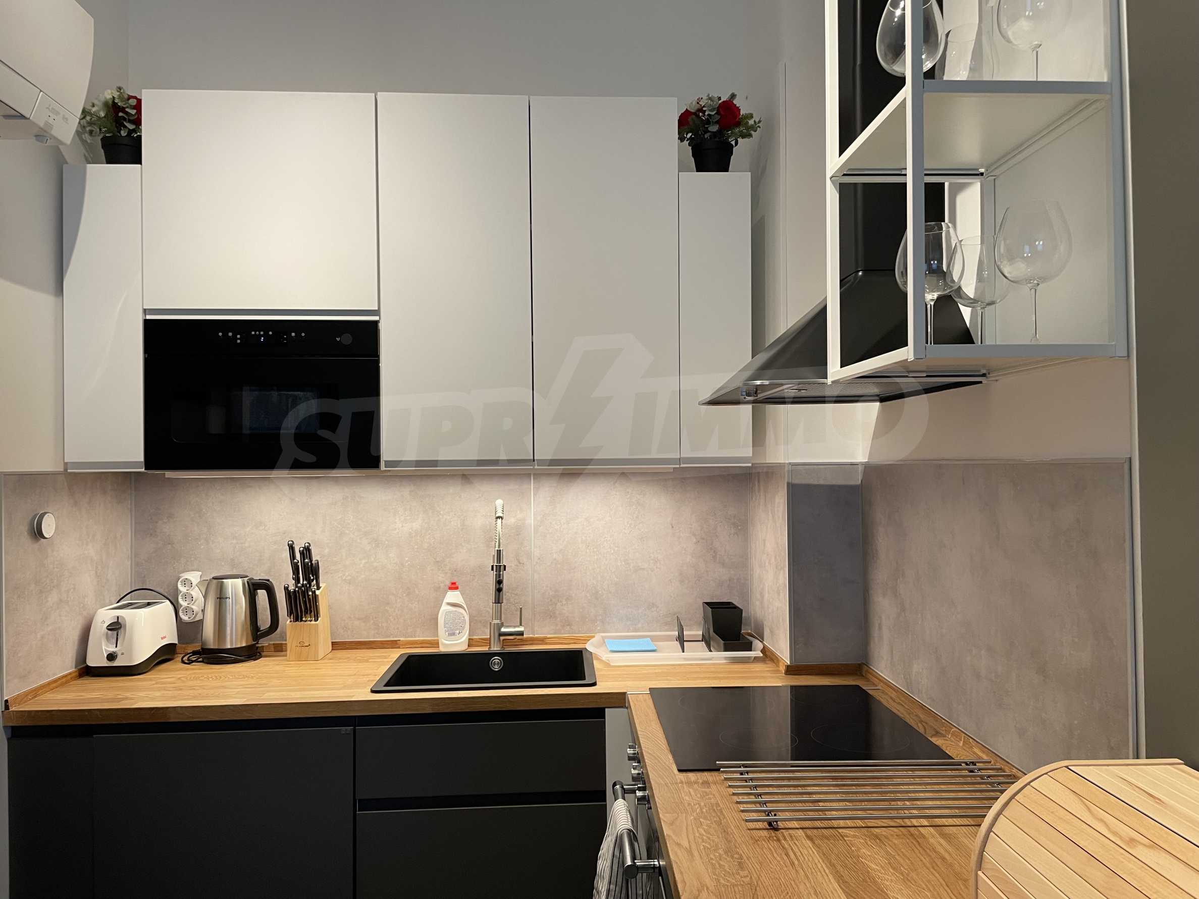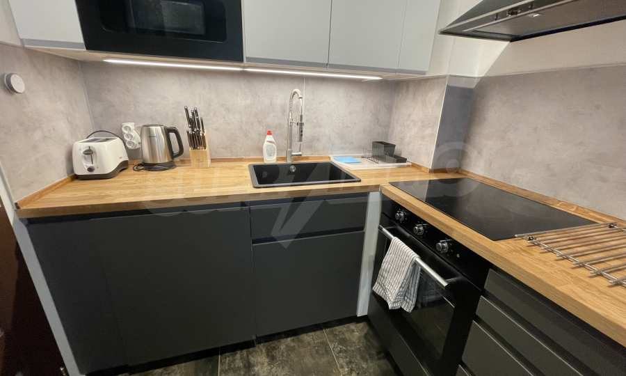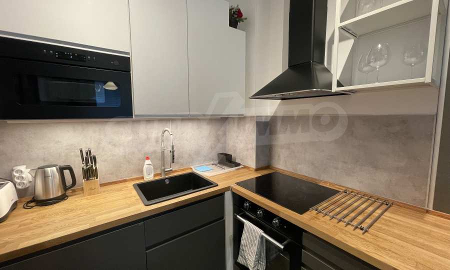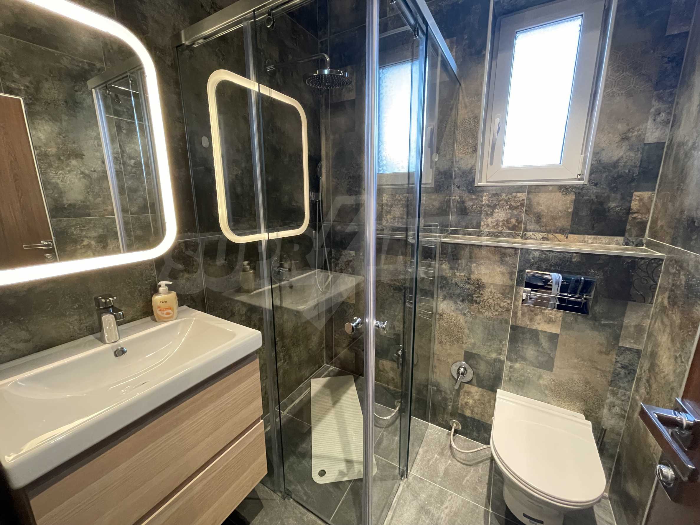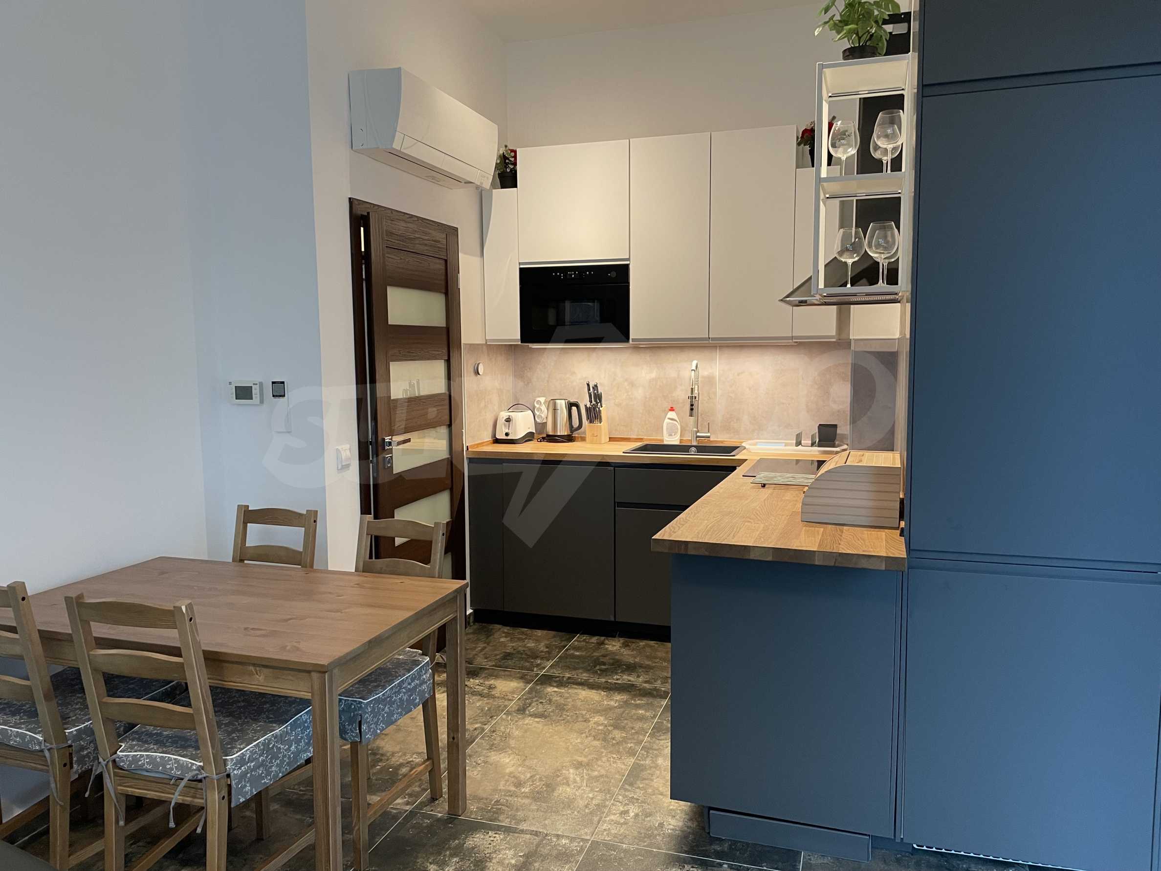 Он расположен на первом этаже, общей площадью 52,08, жилой площадью 45,95 квадратных метров и функциональной планировкой: прихожая, гостиная с высококачественной кухней, удобная спальня и ванная комната. К нему принадлежит сад площадью 8,63 квадратных метра, подходящий для отдыха. Недвижимость компактная, с современным интерьером в серых тонах, высококачественным оснащением, эффектным освещением и деталями. В доме газовое отопление с теплыми полами (автоматическая регулировка) и инверторный кондиционер "Mitsubishi". Также установлена комбинированная стиральная машина с сушкой и посудомоечной машиной. В доме высокие потолки 3,3 метра.